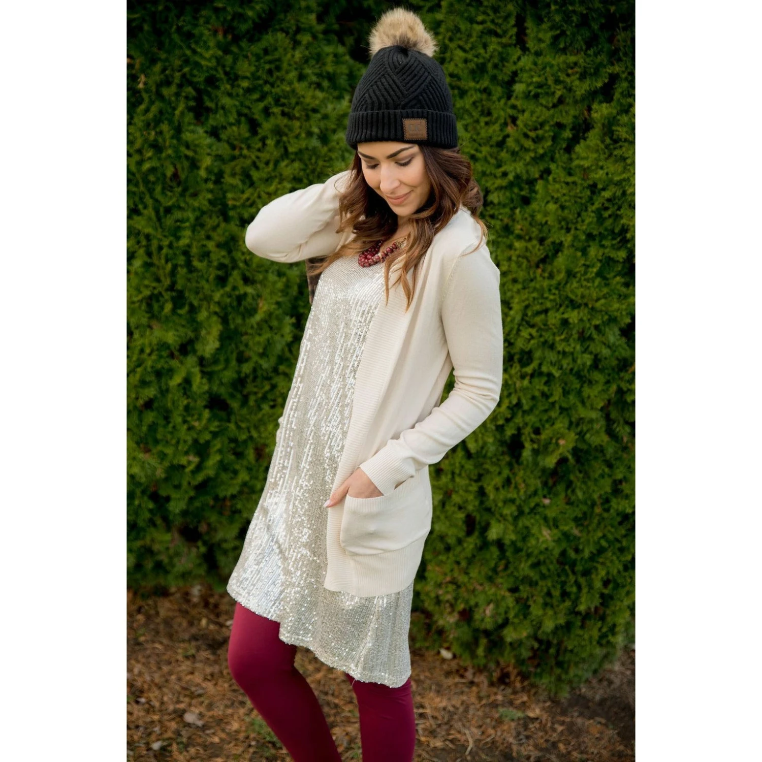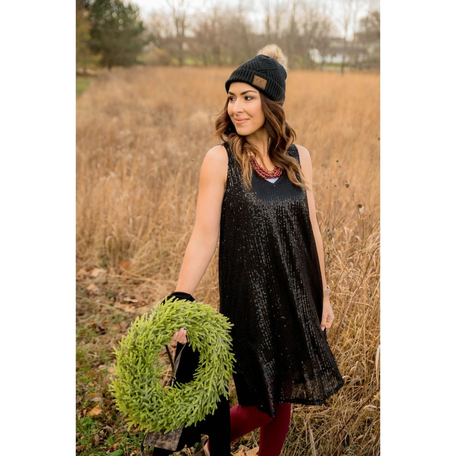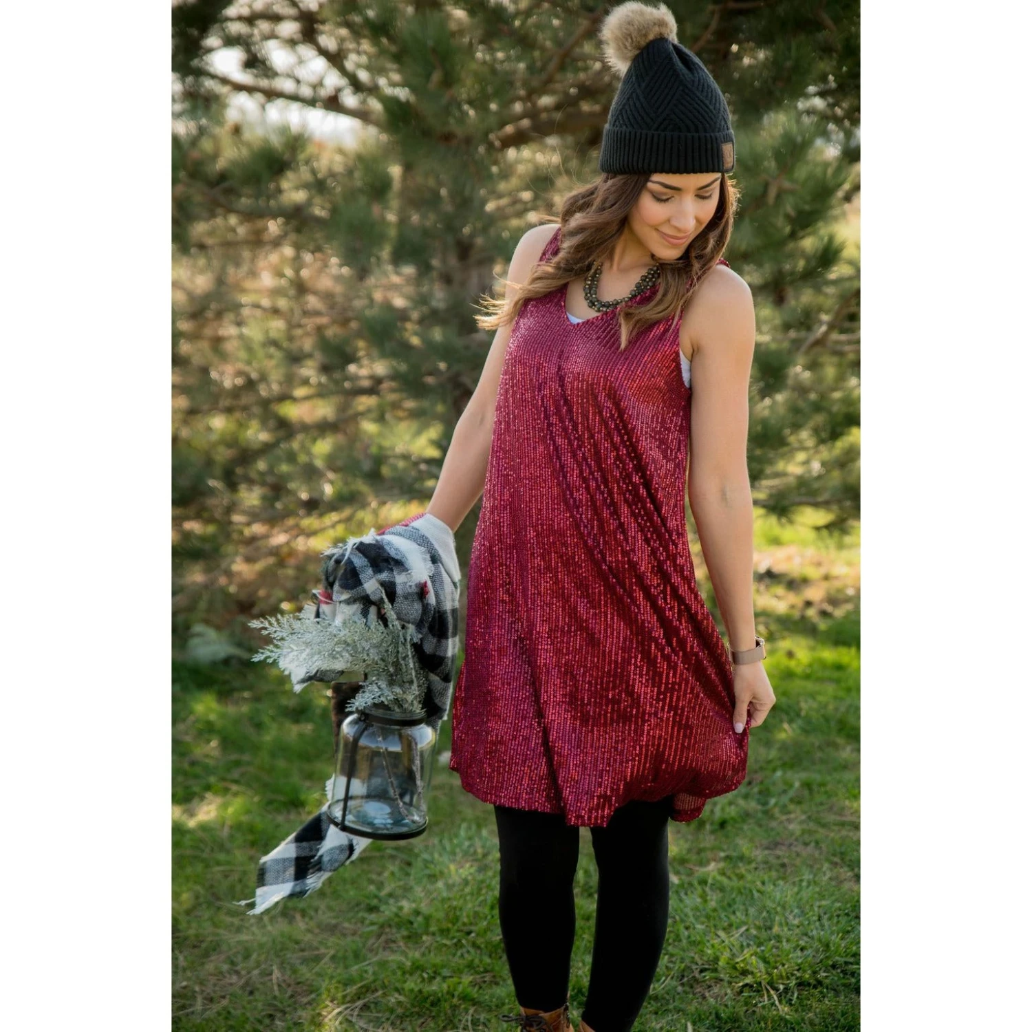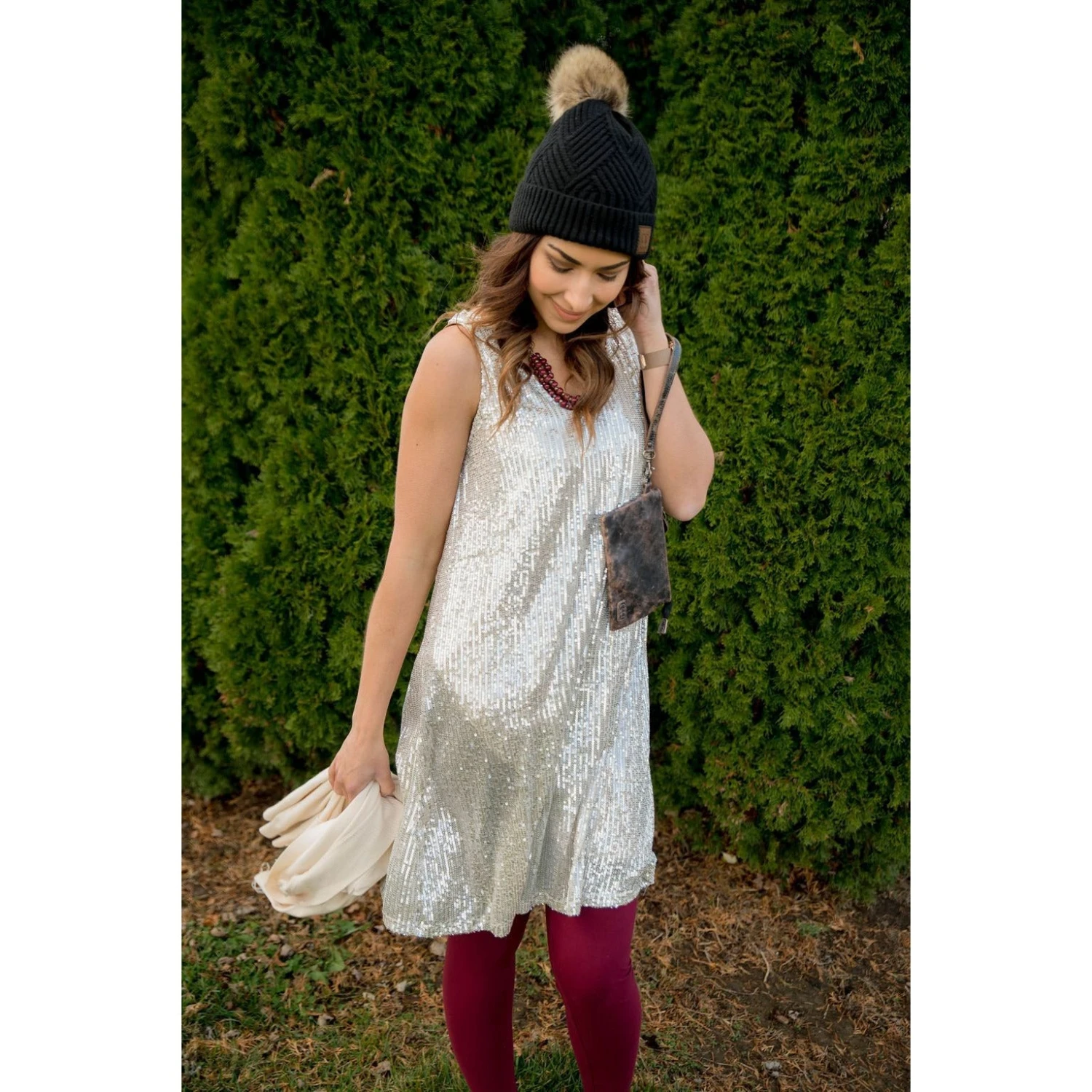 Looking for that perfect little dress for the holidays? Look no further! This sequined number is the perfect dress for you! Wear it with legging, boots, and a cardigan to make it a bit warmer!