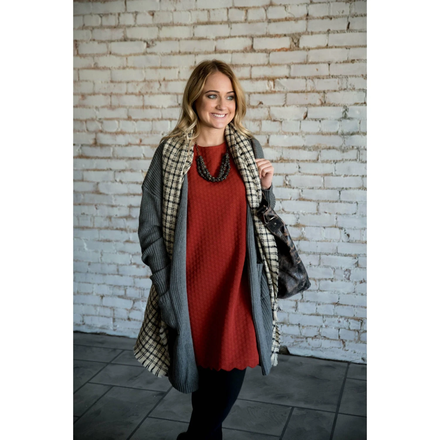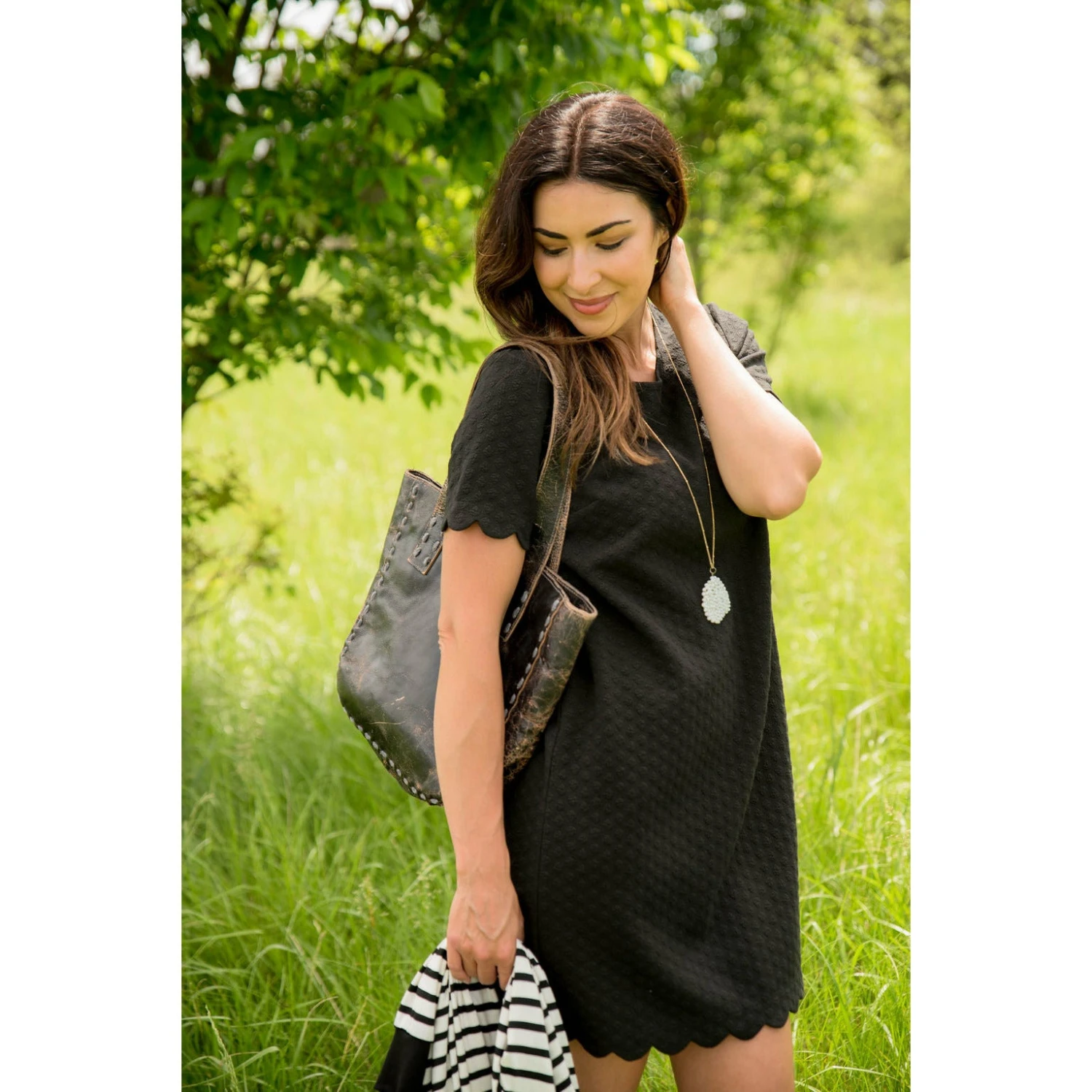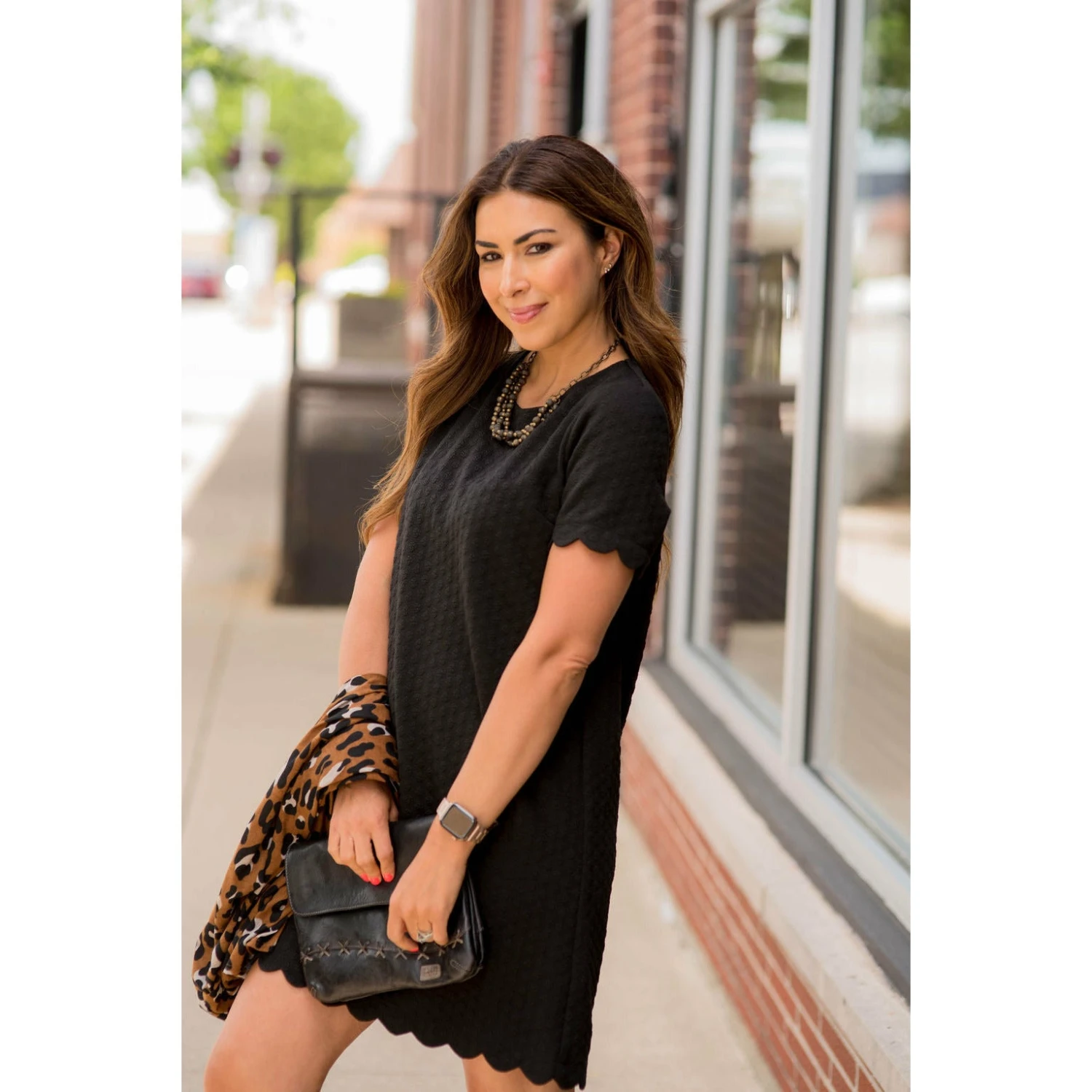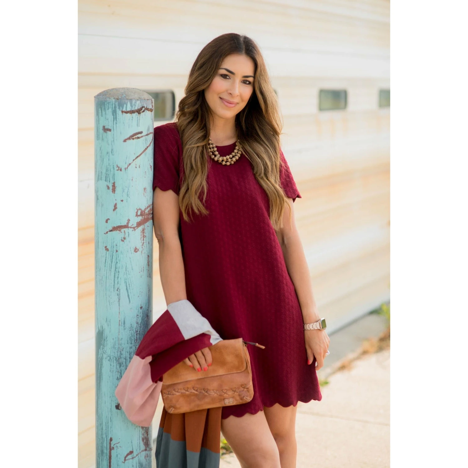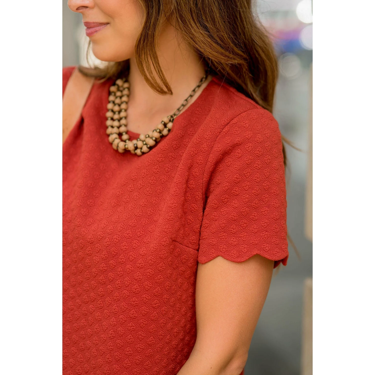 This is the perfect dress for any occasion! From the subtle texture that gives it a unique yet understated look, to the detail in the scalloped sleeves and bottom, this dress is sure to be a show stopper anywhere you wear it!