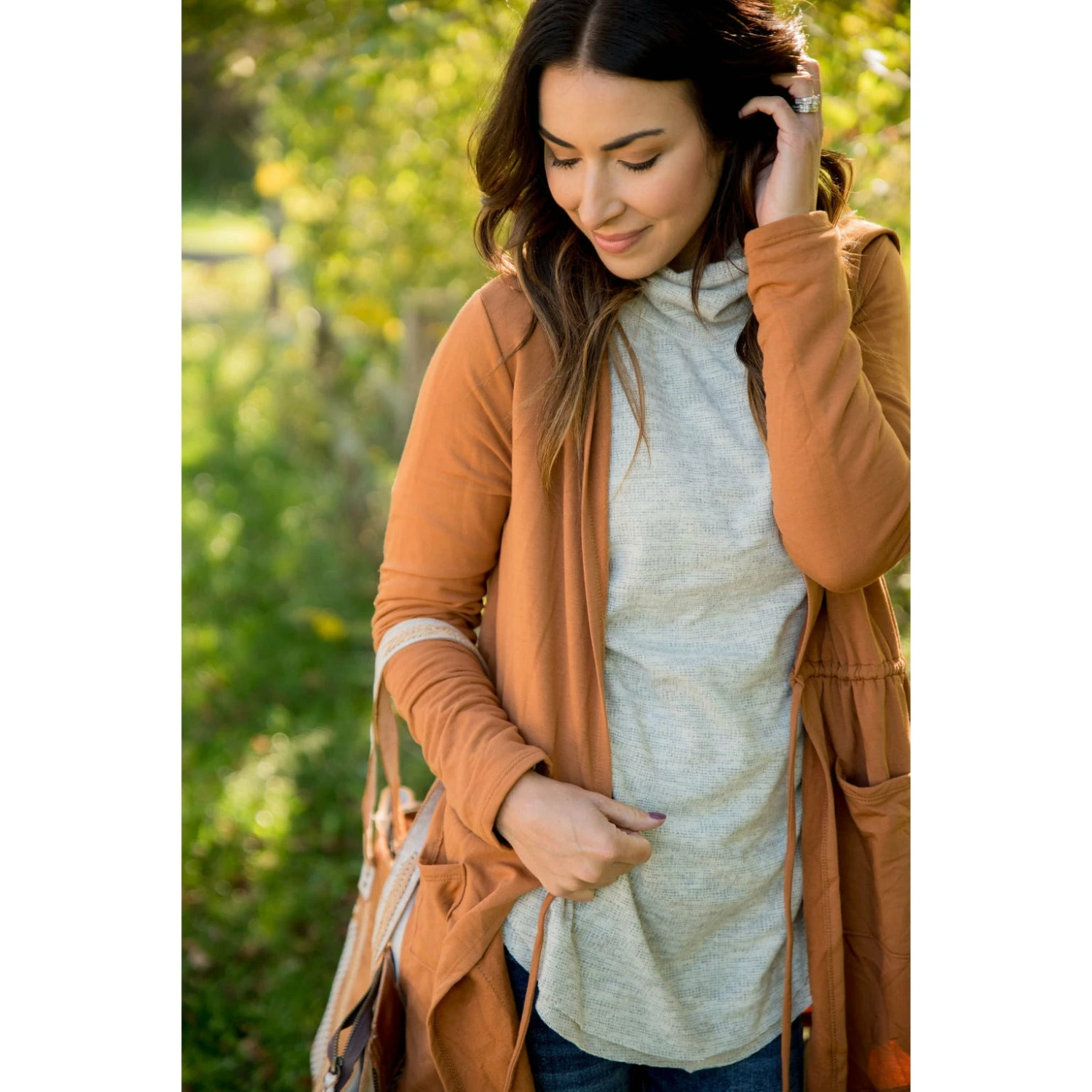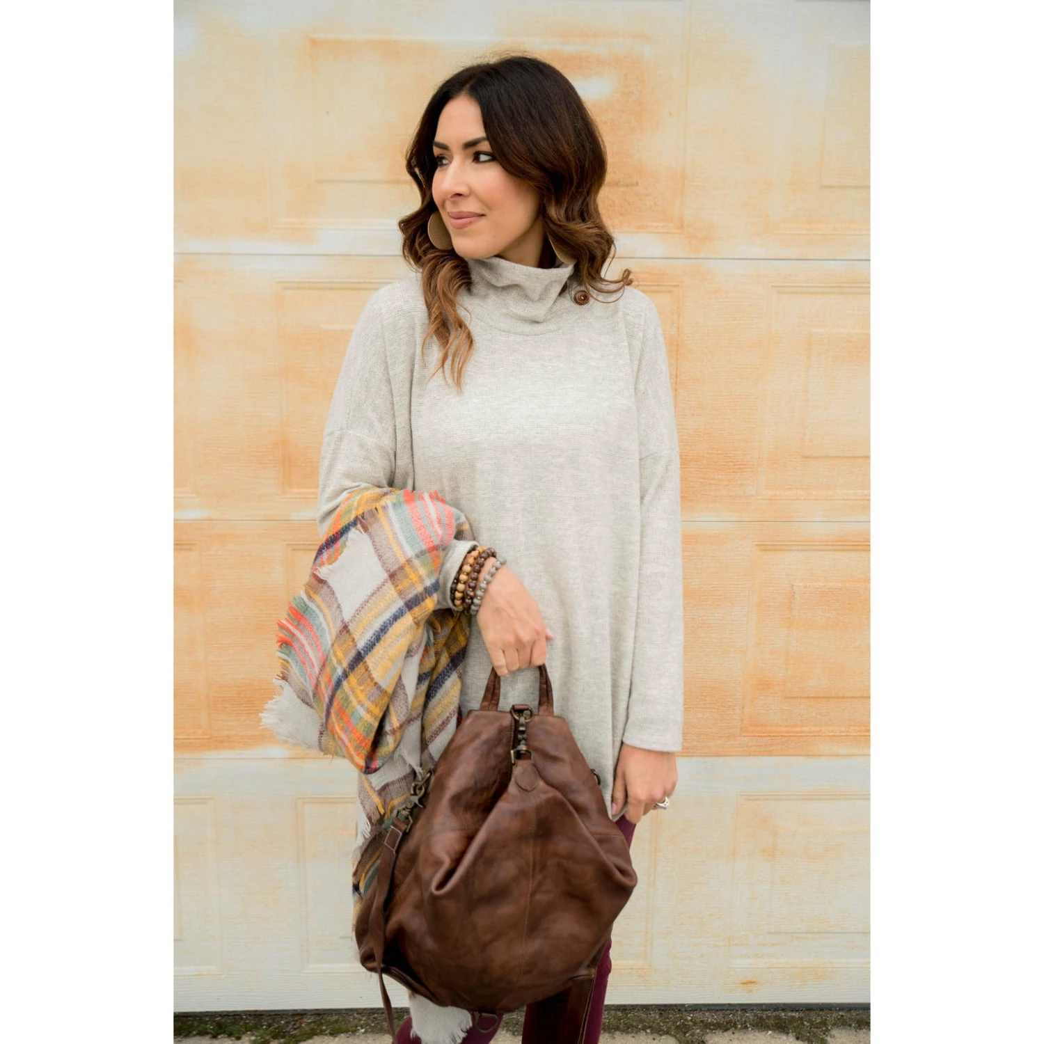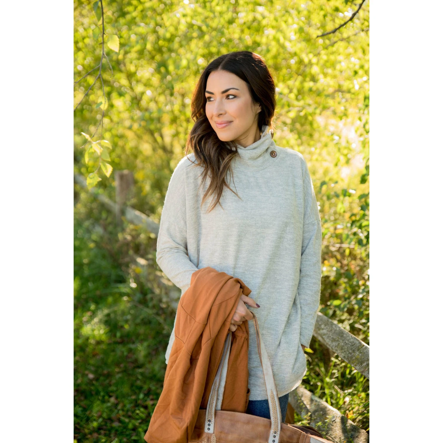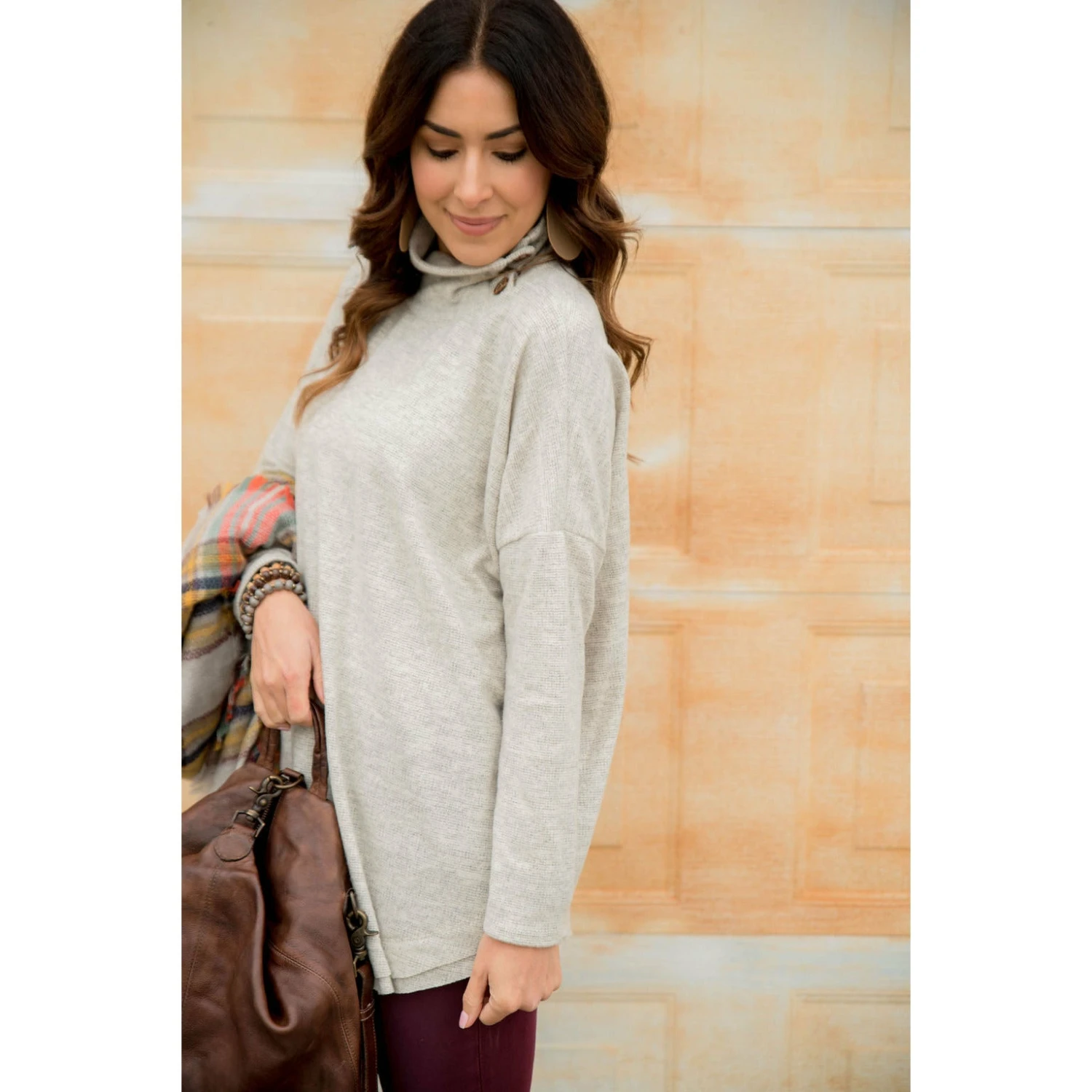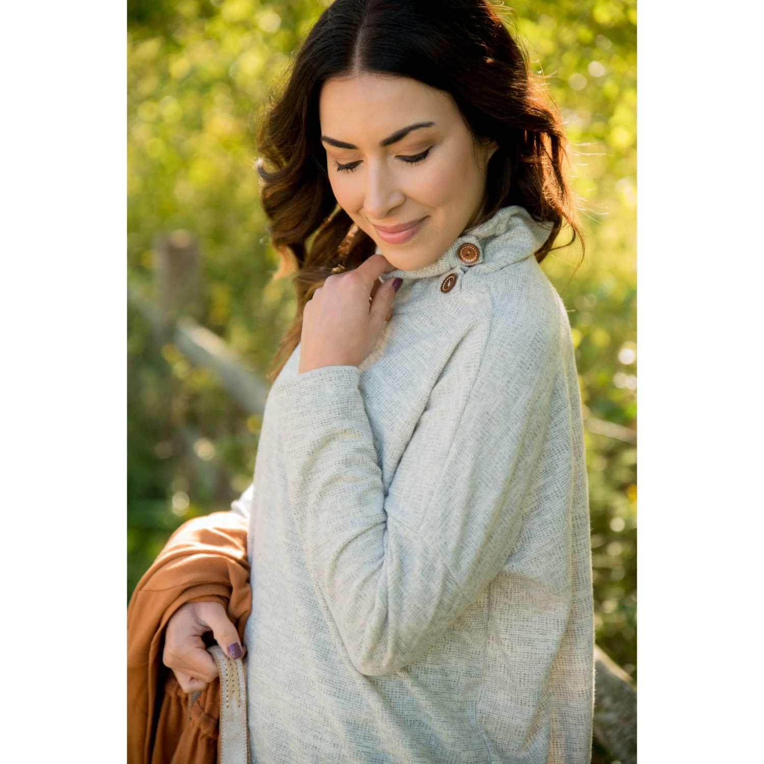 This is cozy! Get this cowl neck sweatshirt with buttons! You can wear this with a pair of our jeans or jeggings!