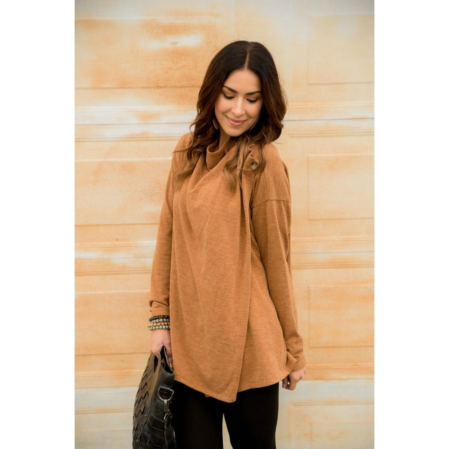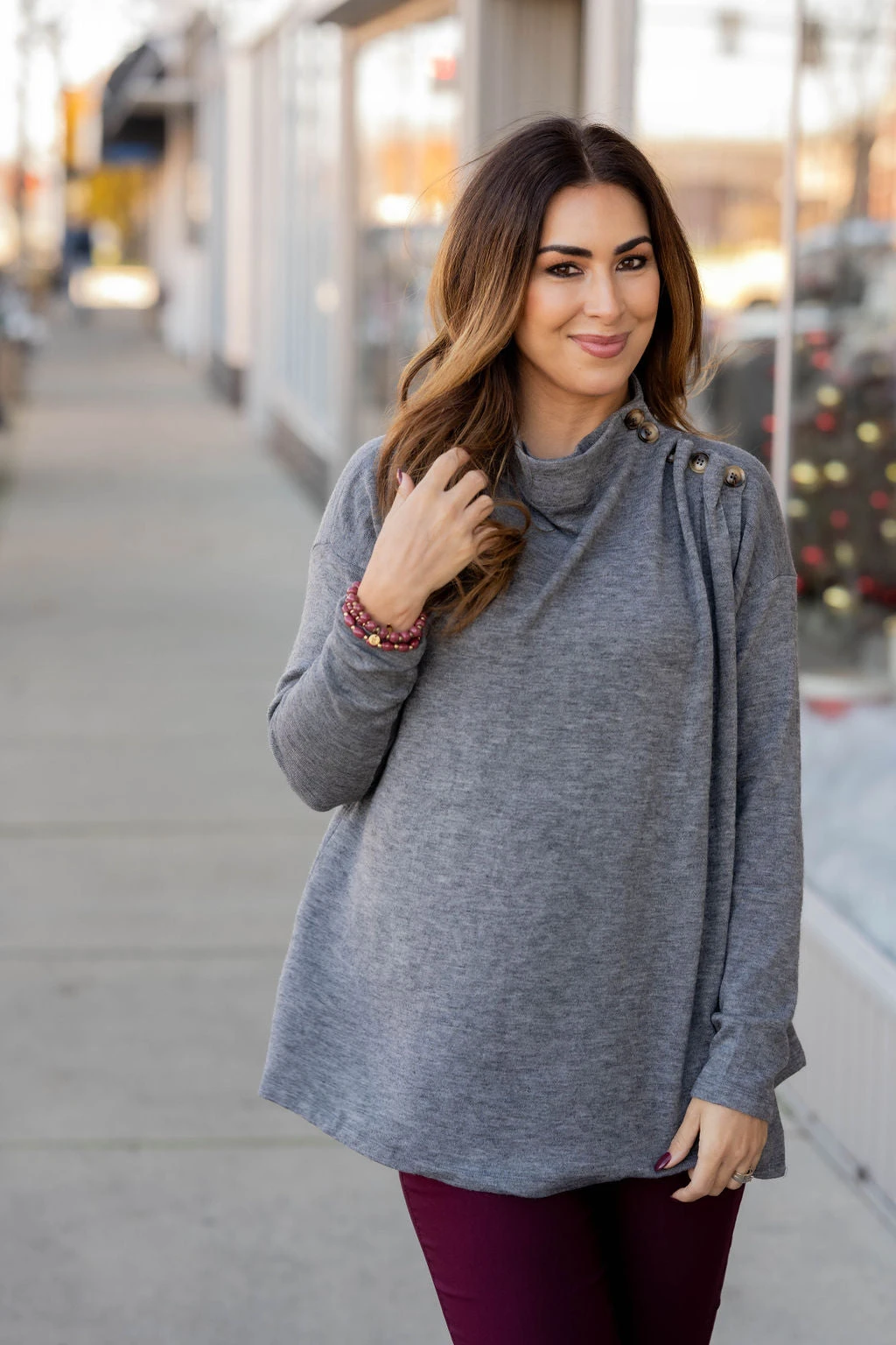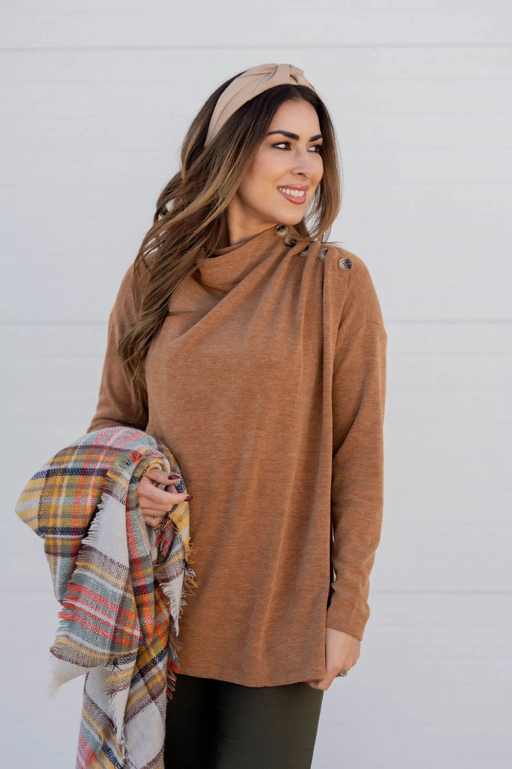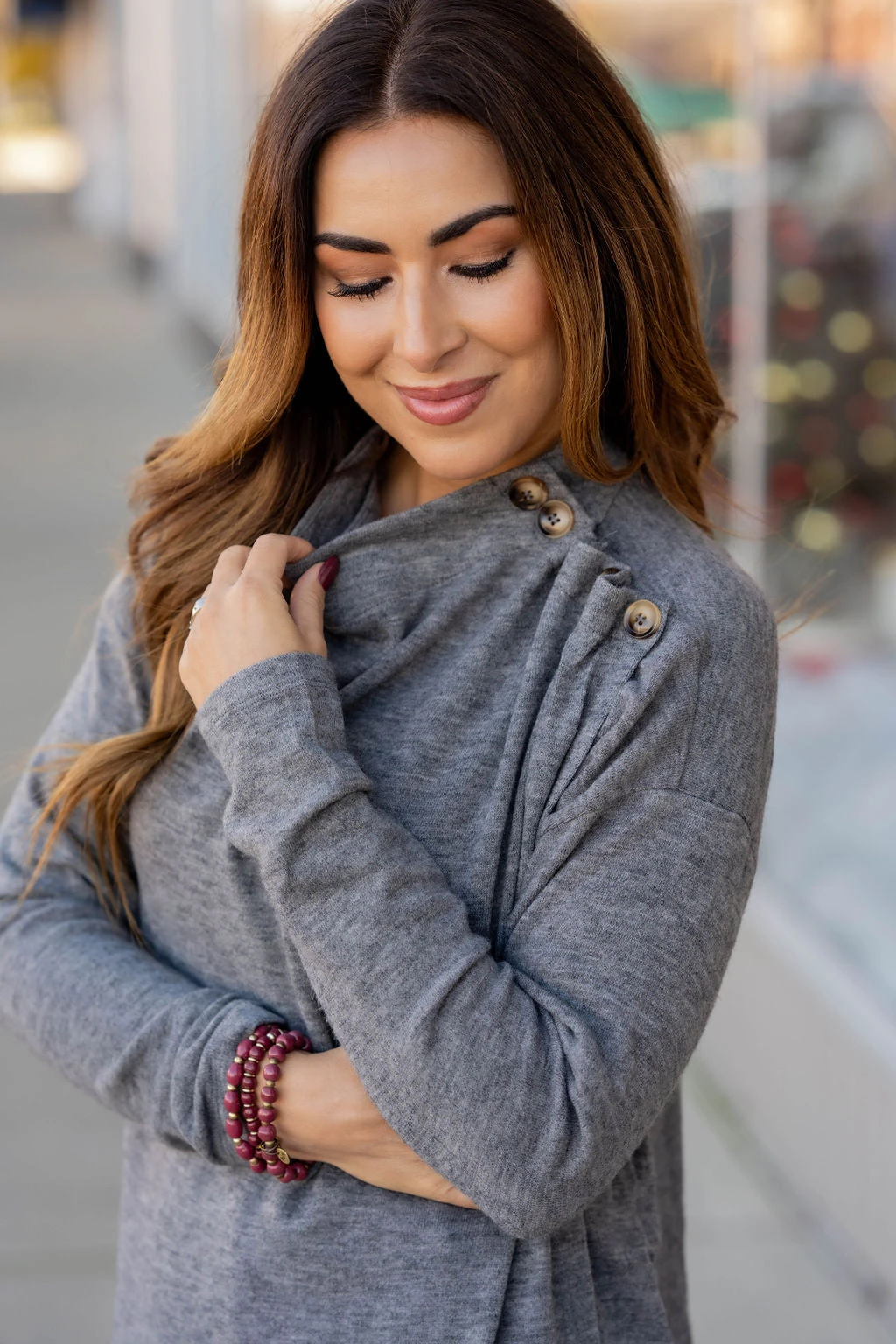 We’re absolutely loving this sweater! The faux wrap style and cute side buttons really take it to the next level! Pair with your favorite denim or leggings for a quick and easy look!