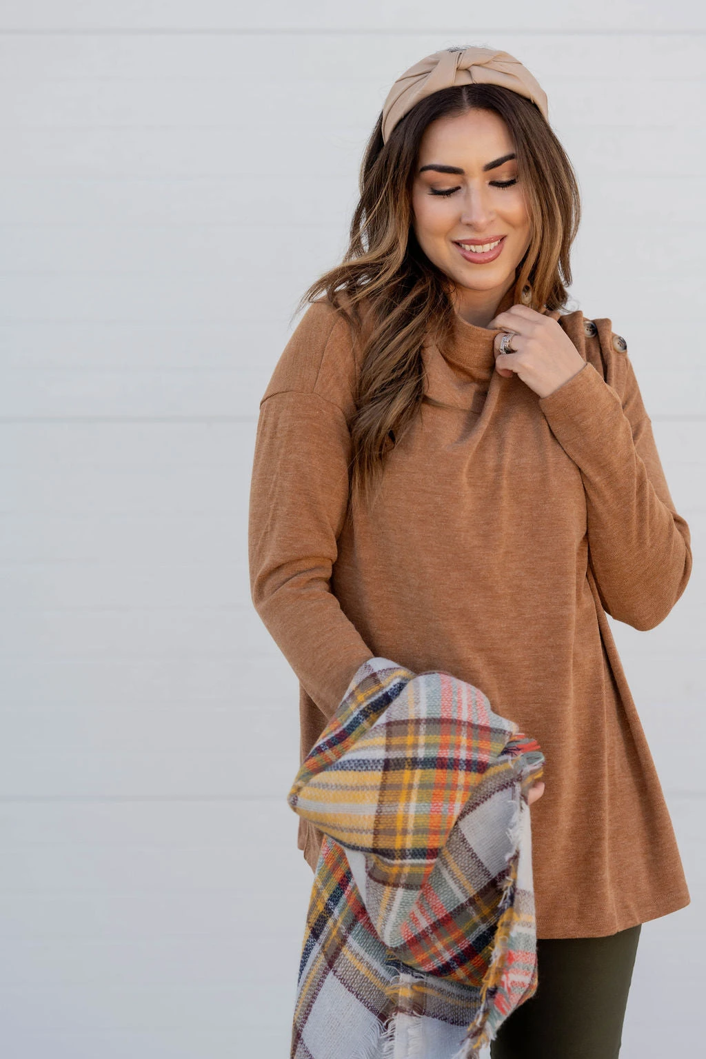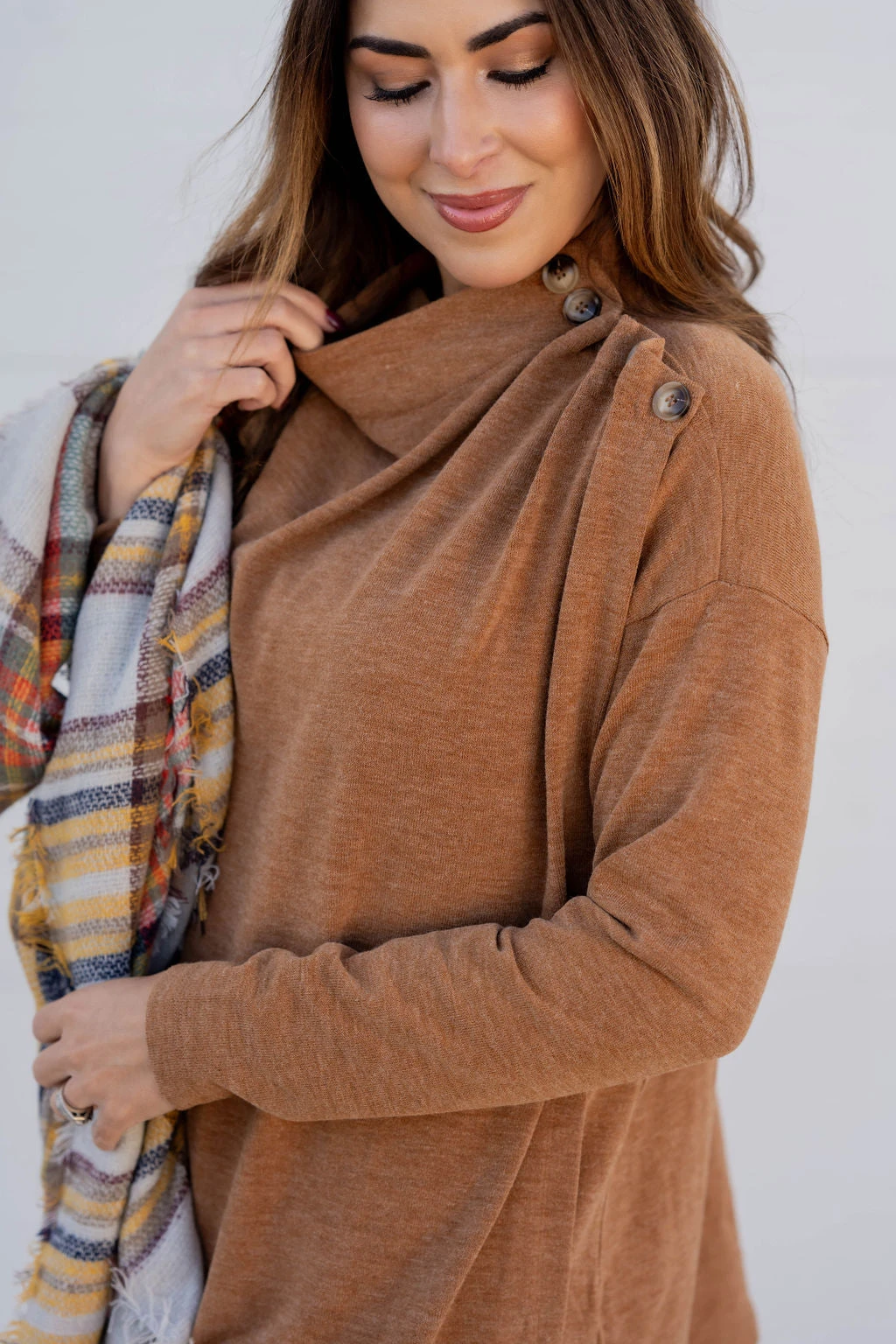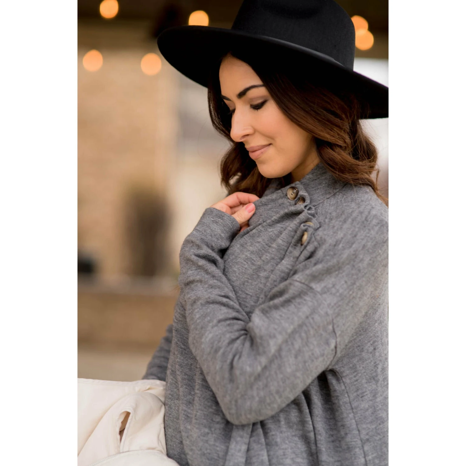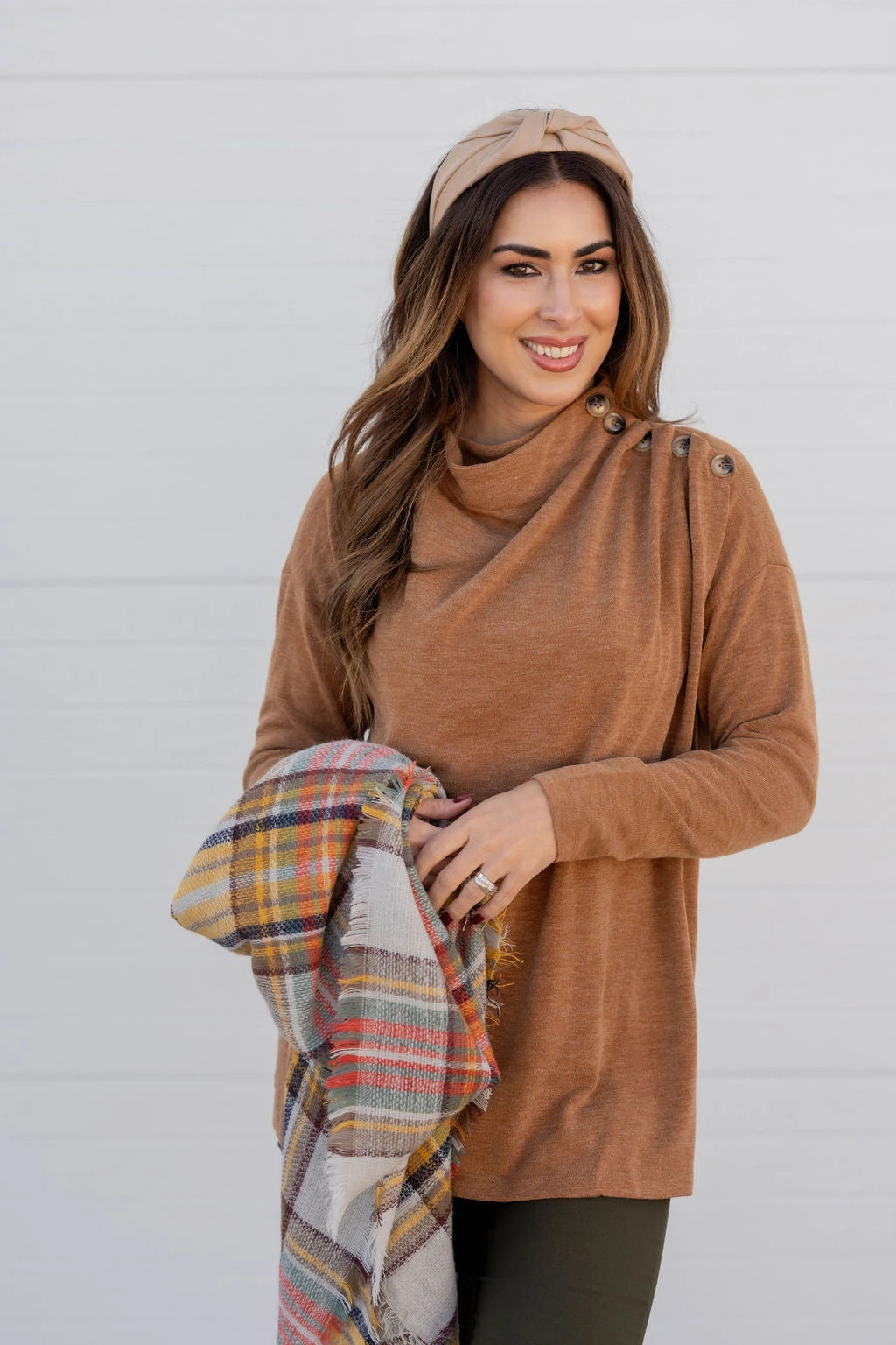 We’re absolutely loving this sweater! The faux wrap style and cute side buttons really take it to the next level! Pair with your favorite denim or leggings for a quick and easy look!