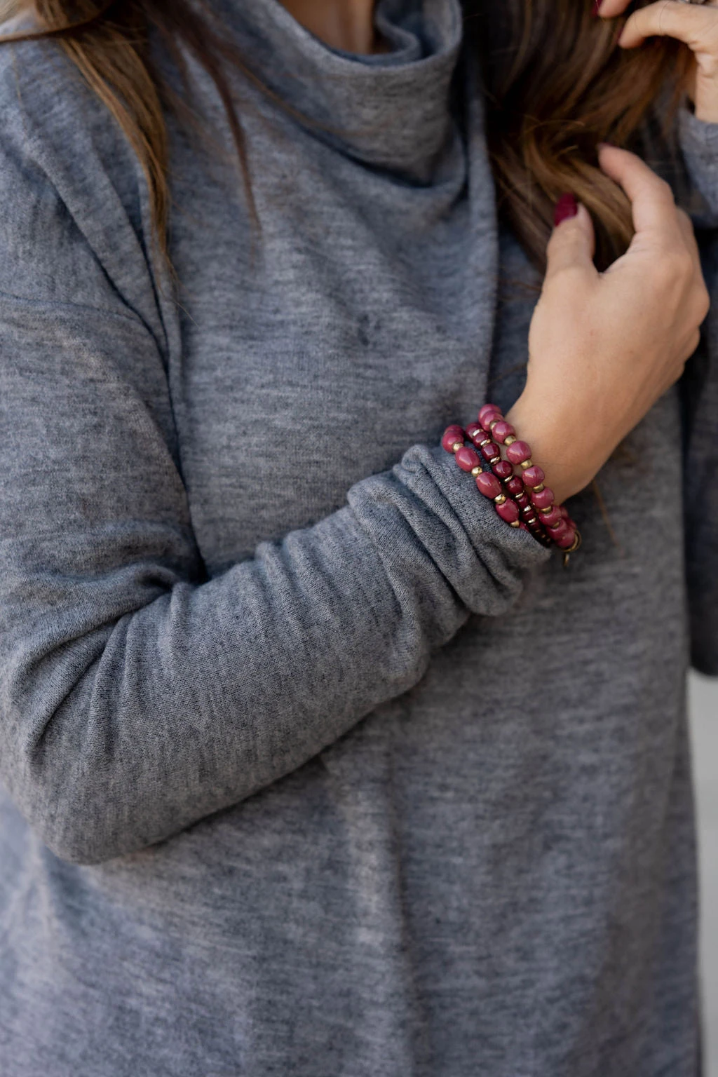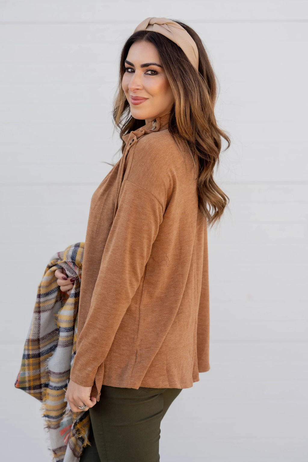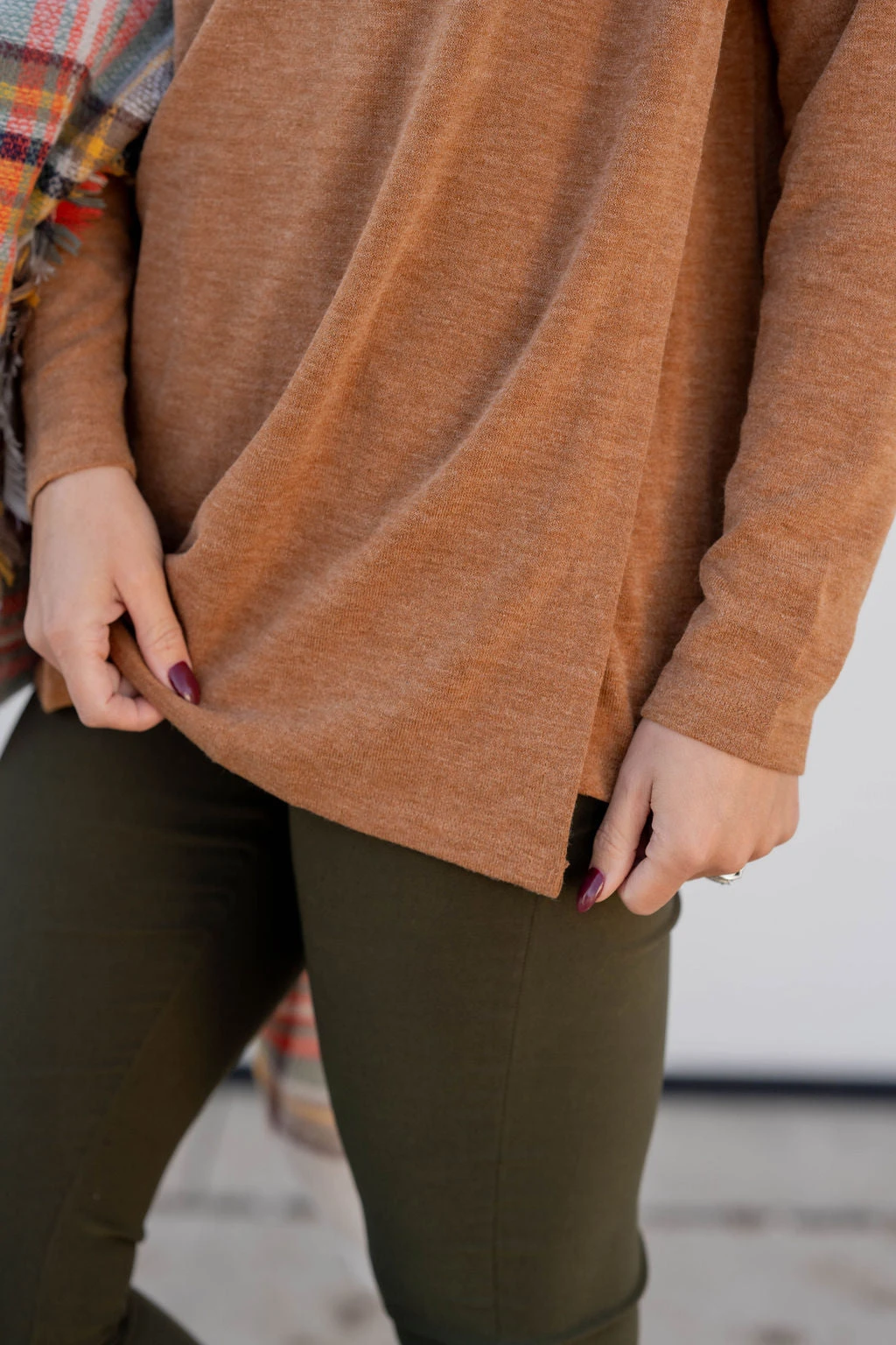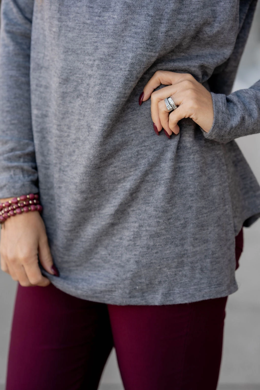 We’re absolutely loving this sweater! The faux wrap style and cute side buttons really take it to the next level! Pair with your favorite denim or leggings for a quick and easy look!