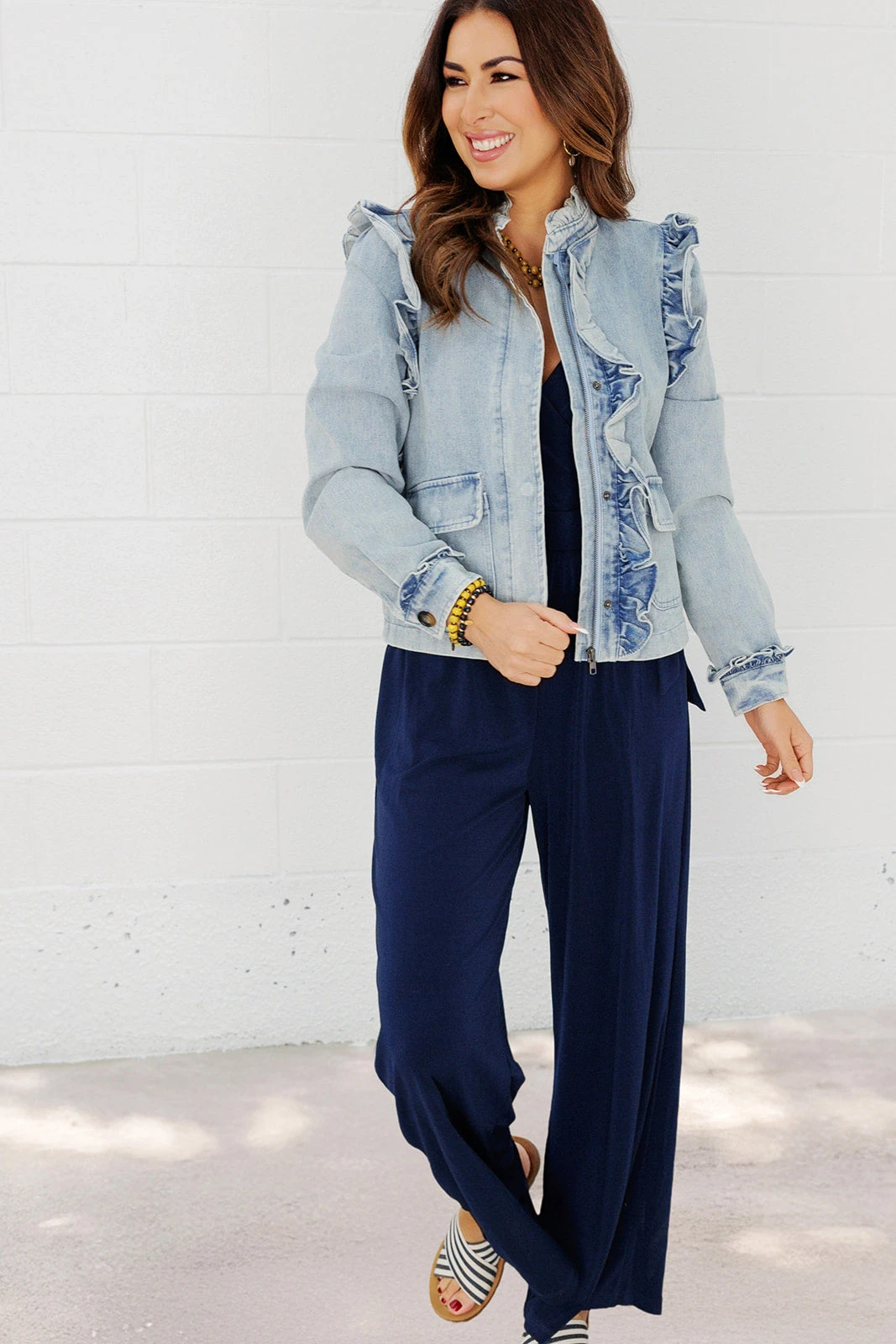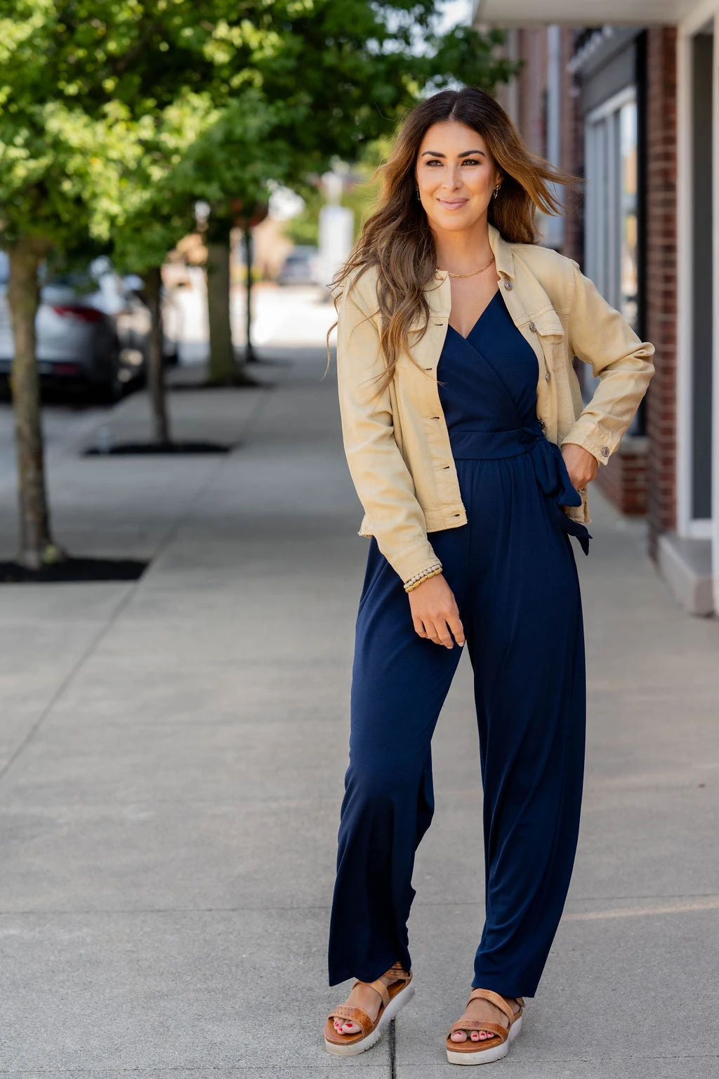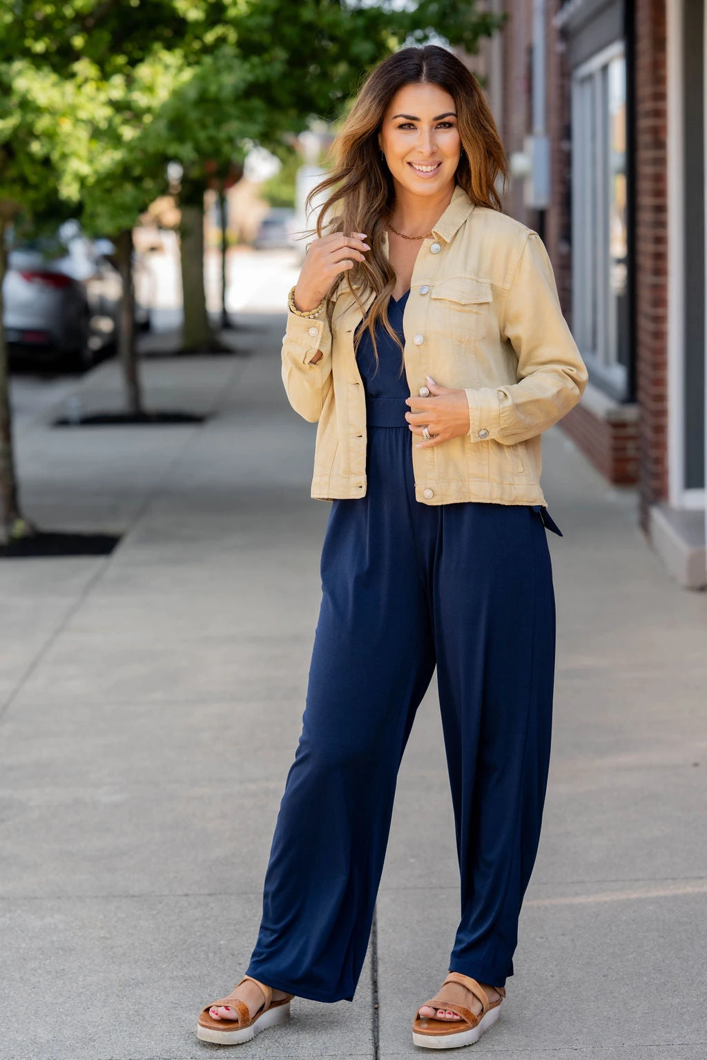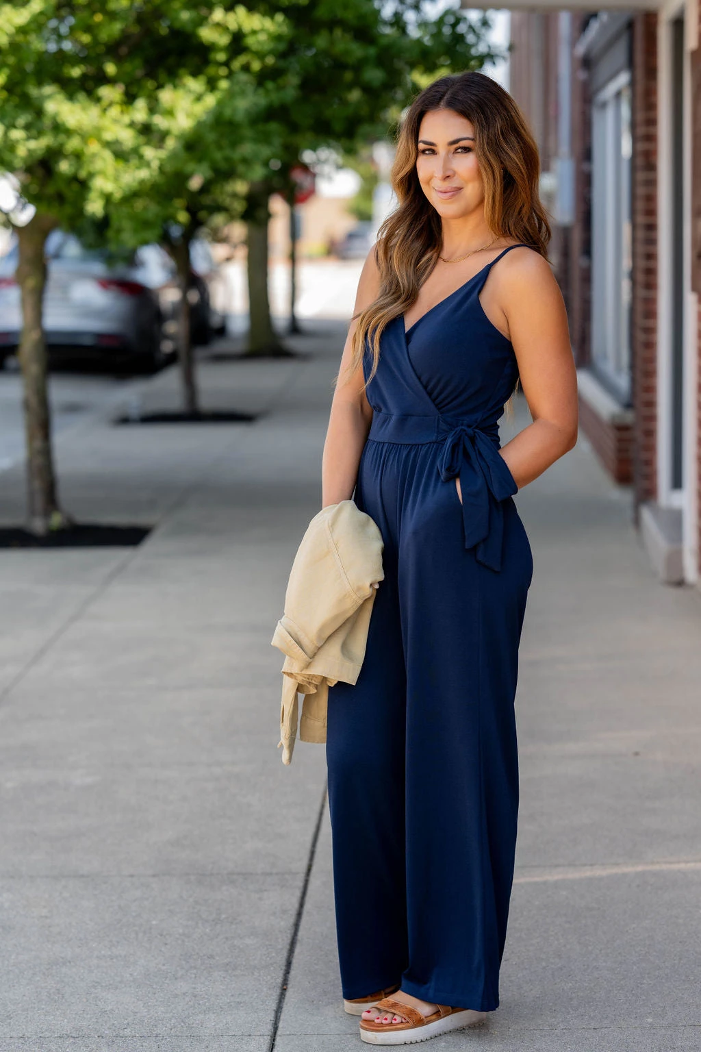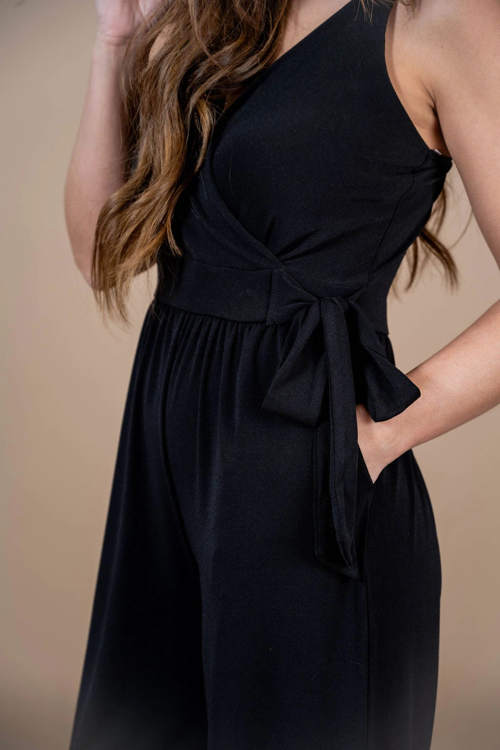 We love how this is such a great transitional piece going from season to season! The V-neck is flattering and the cinched tie waist and relaxed leg bottoms make this jumpsuit suitable for any body type. Add a bright pop of color, or a bold patterned cardigan or kimono, or even just a denim jacket with statement necklace! The soft material and pockets are going to make this jumpsuit a staple in your closet.