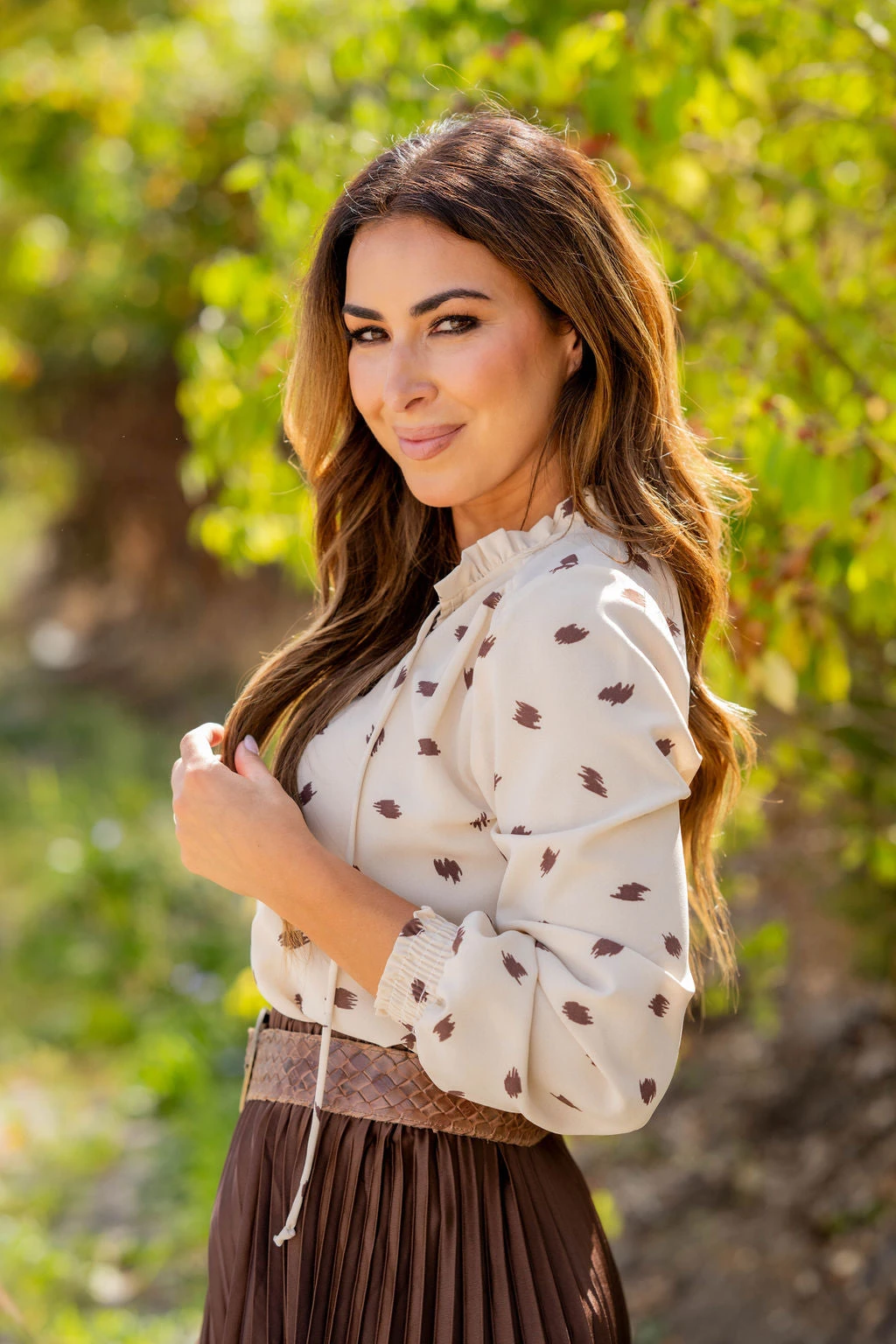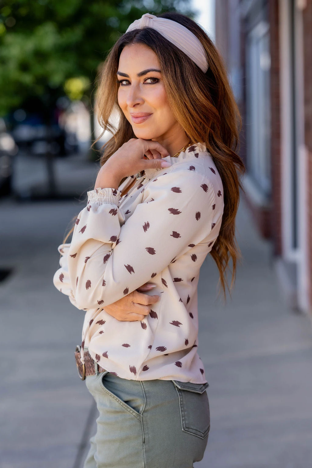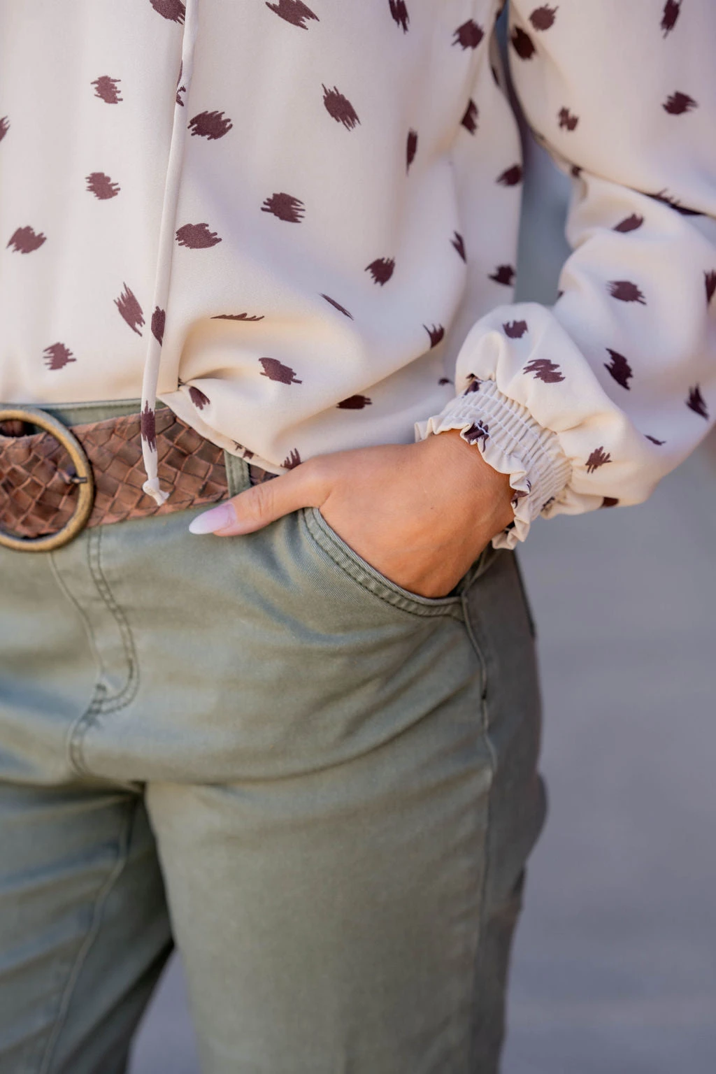 This polka dot top is perfect for quick, unique outfits! We love the colors, pattern, cinching, and the drawstrings. Wear this blouse more casually with your favorite denim or joggers or dress it up by tucking it into a high-waisted skirt or with a pair of our Betsey’s Jeggings and your favorite accessories. Lightweight enough to wear in the warmer months with shorts or layered in the cooler ones. The possibilities are endless with this one.