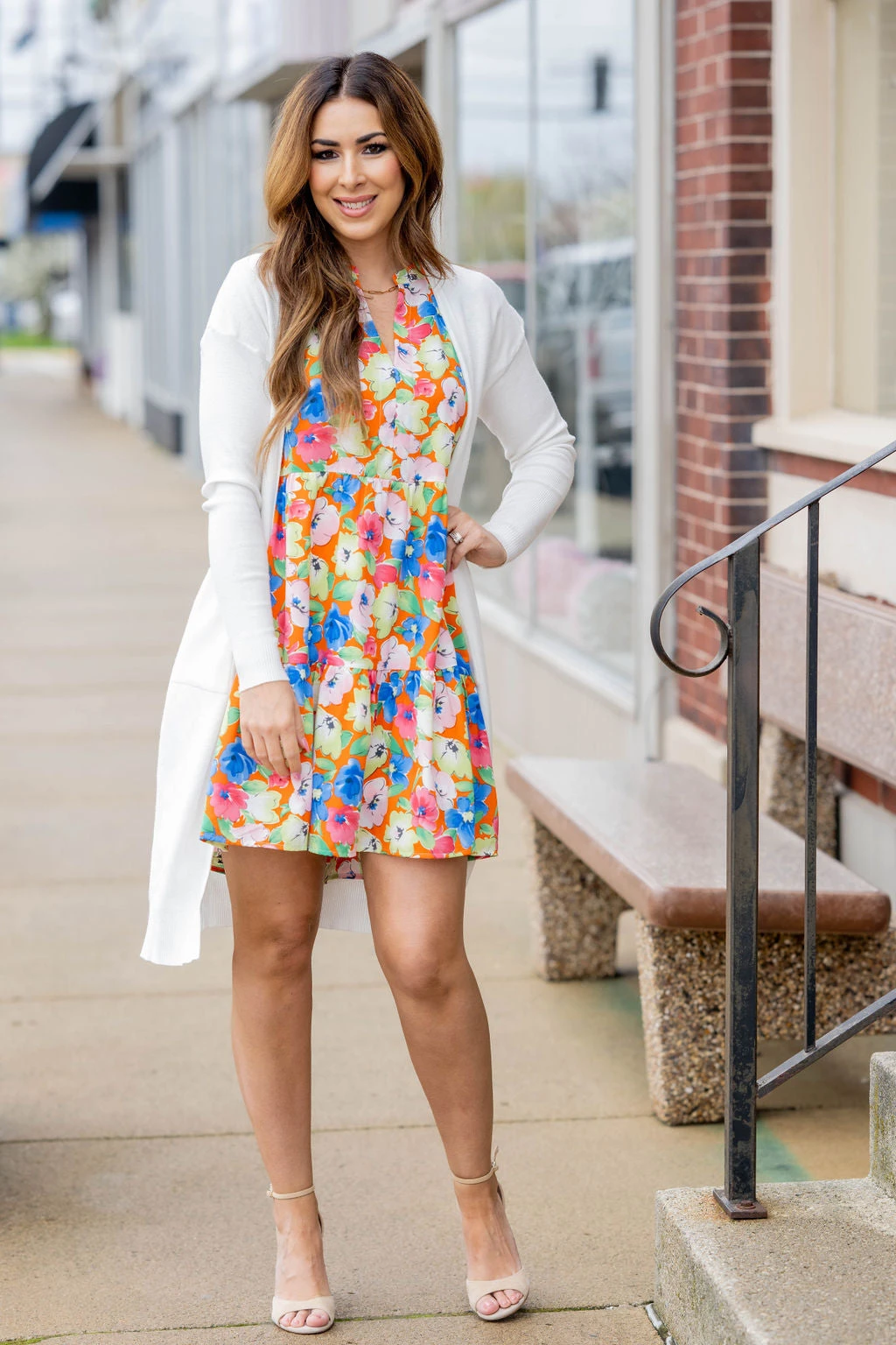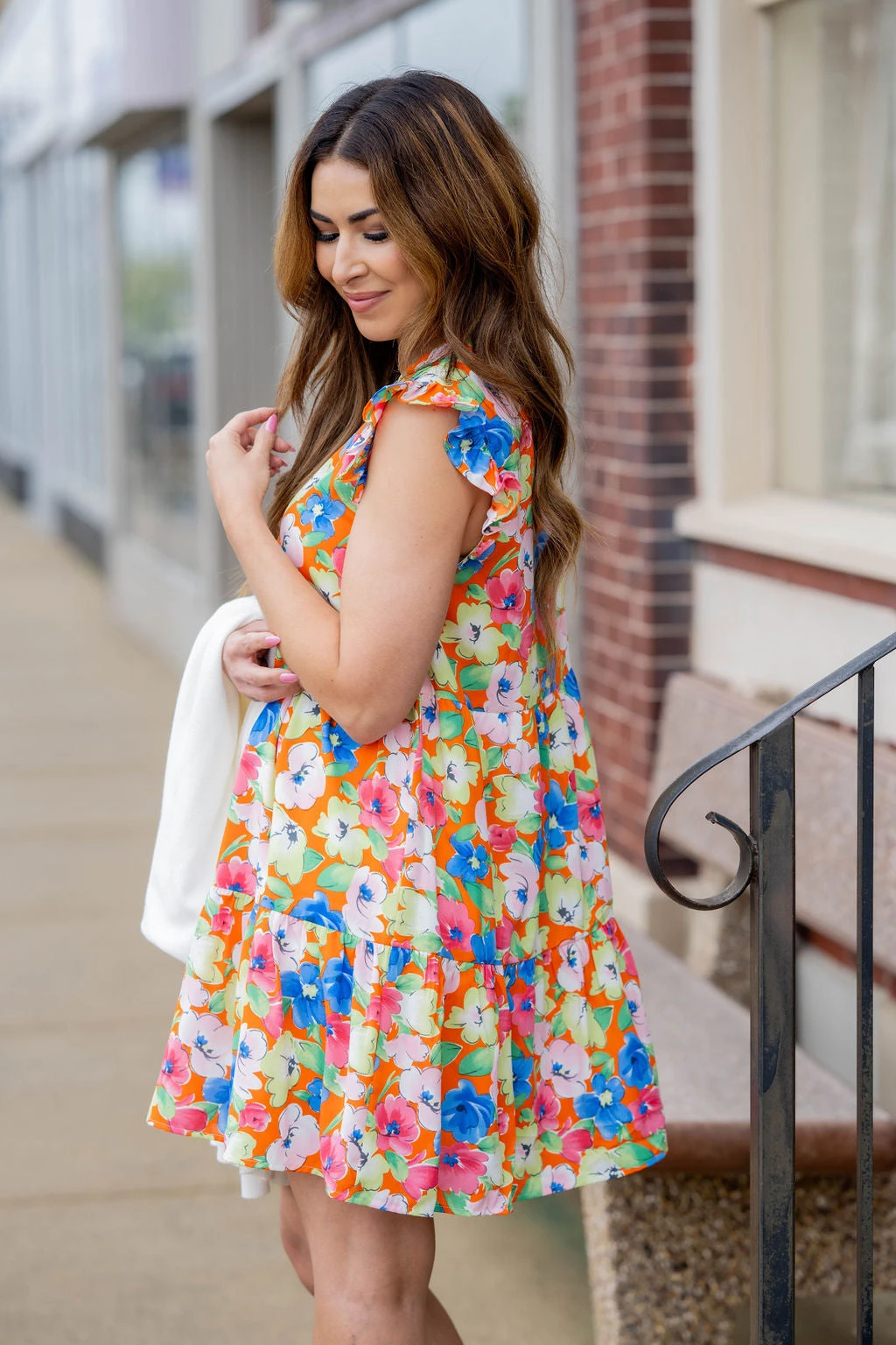 We’re loving how feminine and flirty this floral print is! This dress is made of a lightweight and breathable material, making it perfect for the warmer months but can be layered with a denim jacket or coordinating colored cardigan for the cooler months. The flutter trim add the perfect little detail to this dress, and the flowy tiered style fit makes it perfect for any body type!