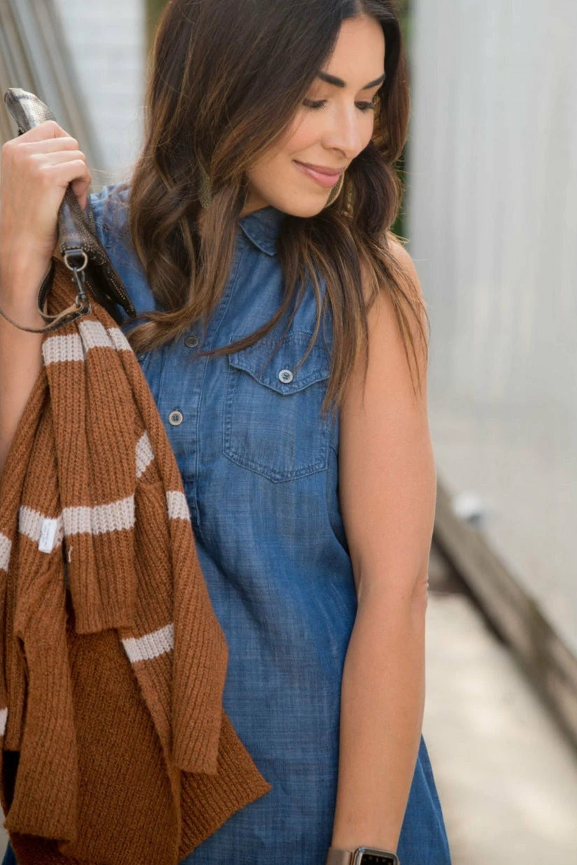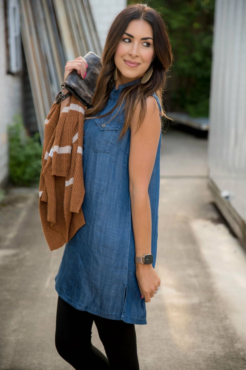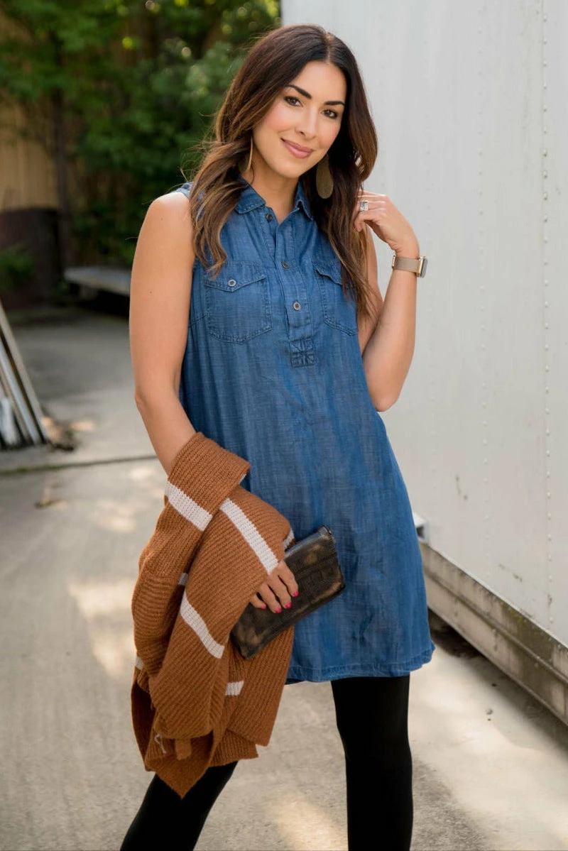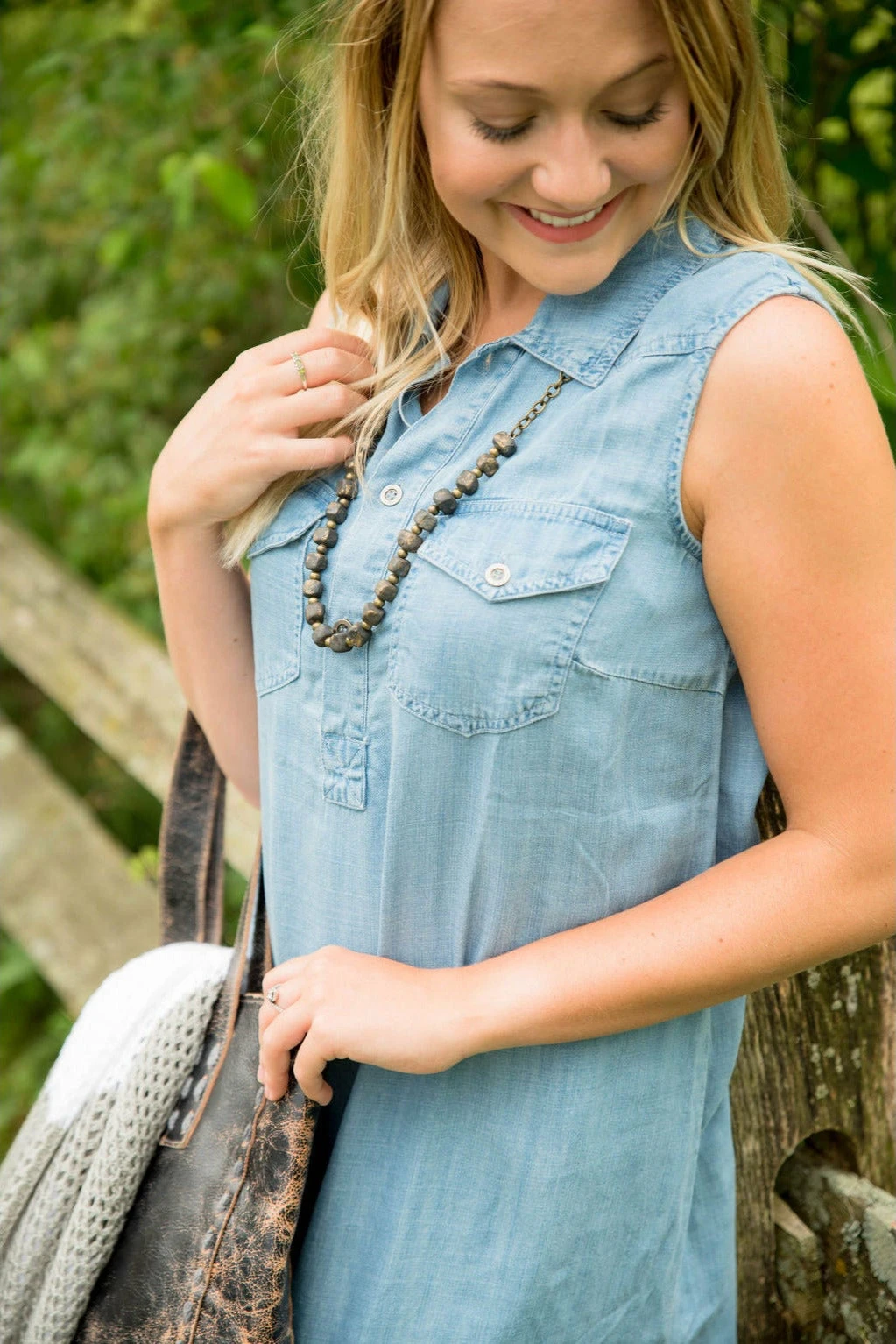 Denim is the best! It is so cute and can be worn so many different ways. You can wear it with sandals and a cardigan or maybe even a pair of booties for a more boho look! Easily put on any necklace and some of our bracelets to add a pop of color to this cute dress.