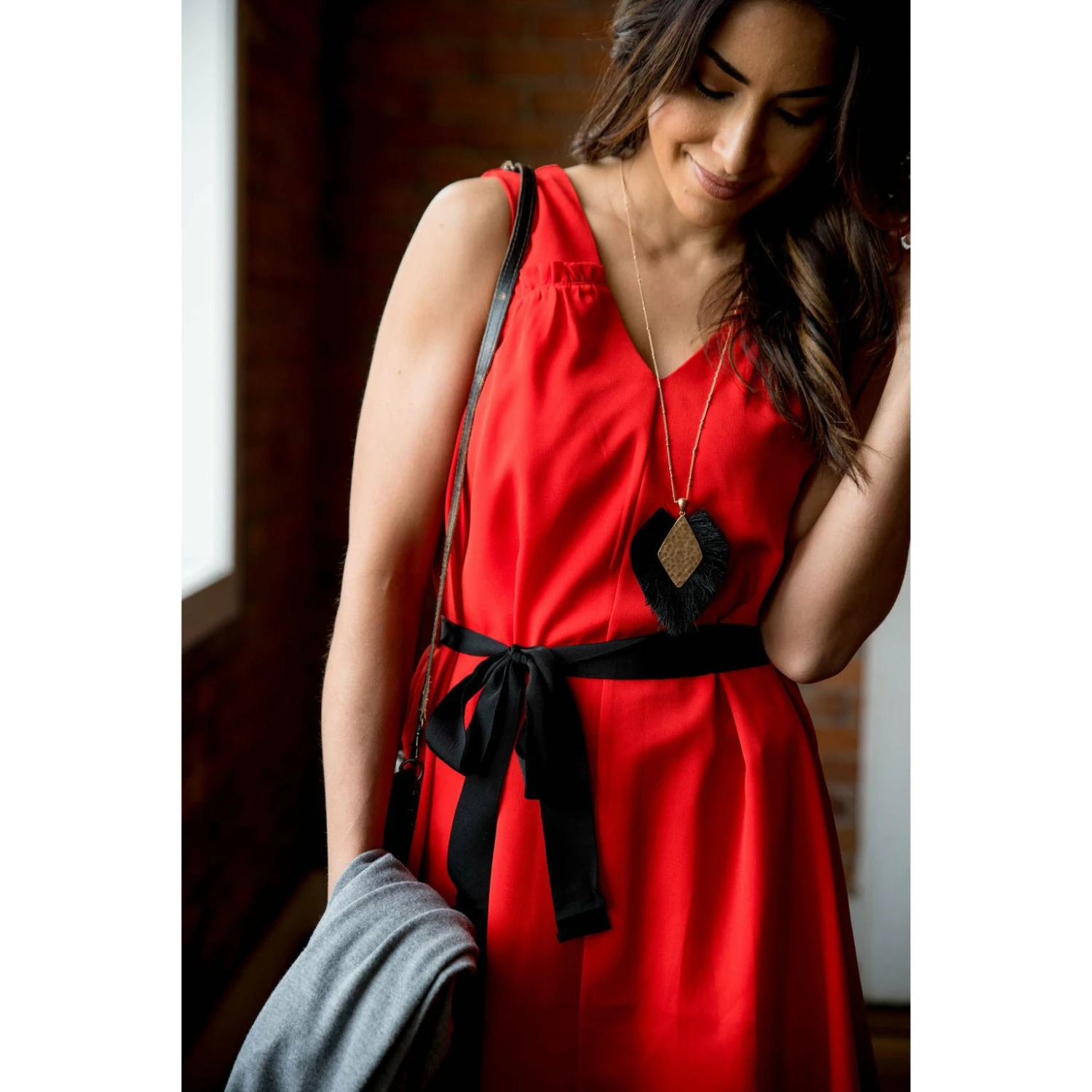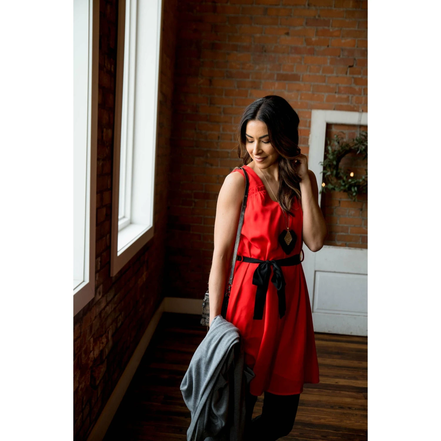 This look is so charming! This dress is just what you need for a special occasion. It has a tie that you can adjust and looks great with leggings!