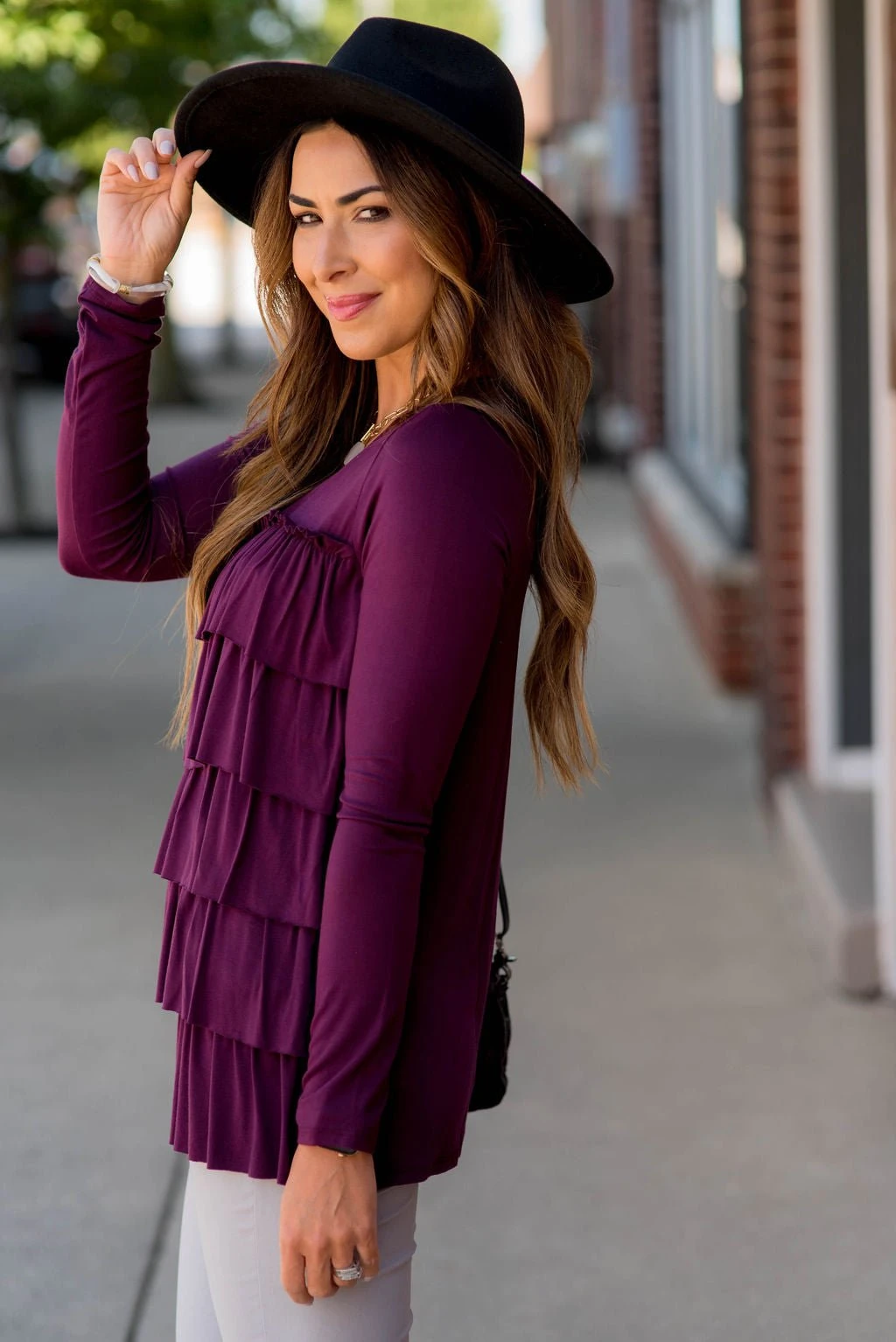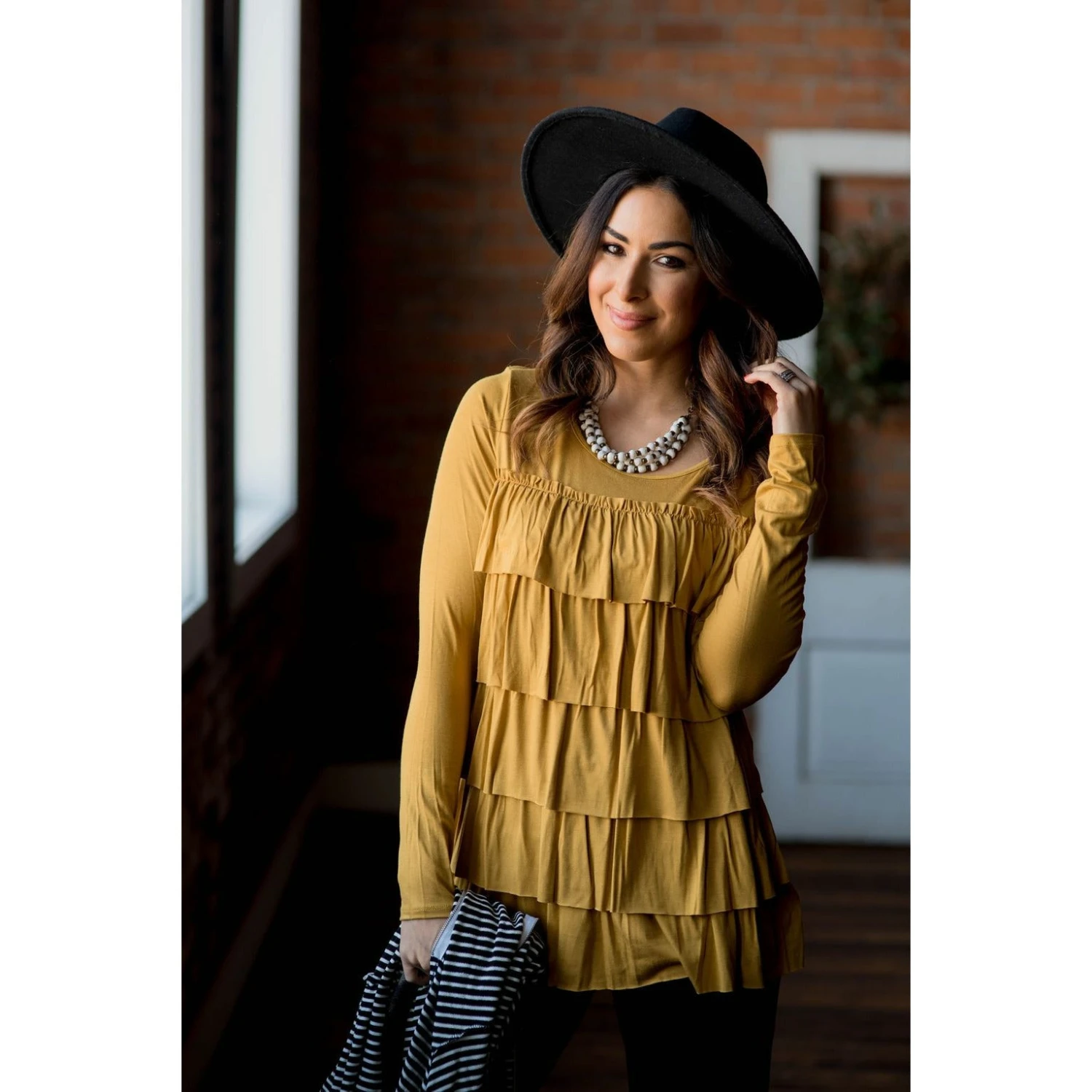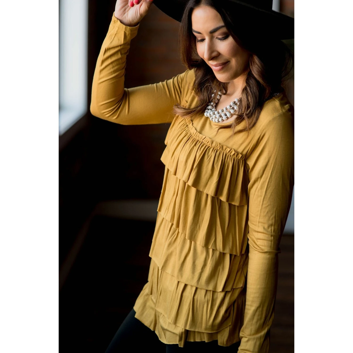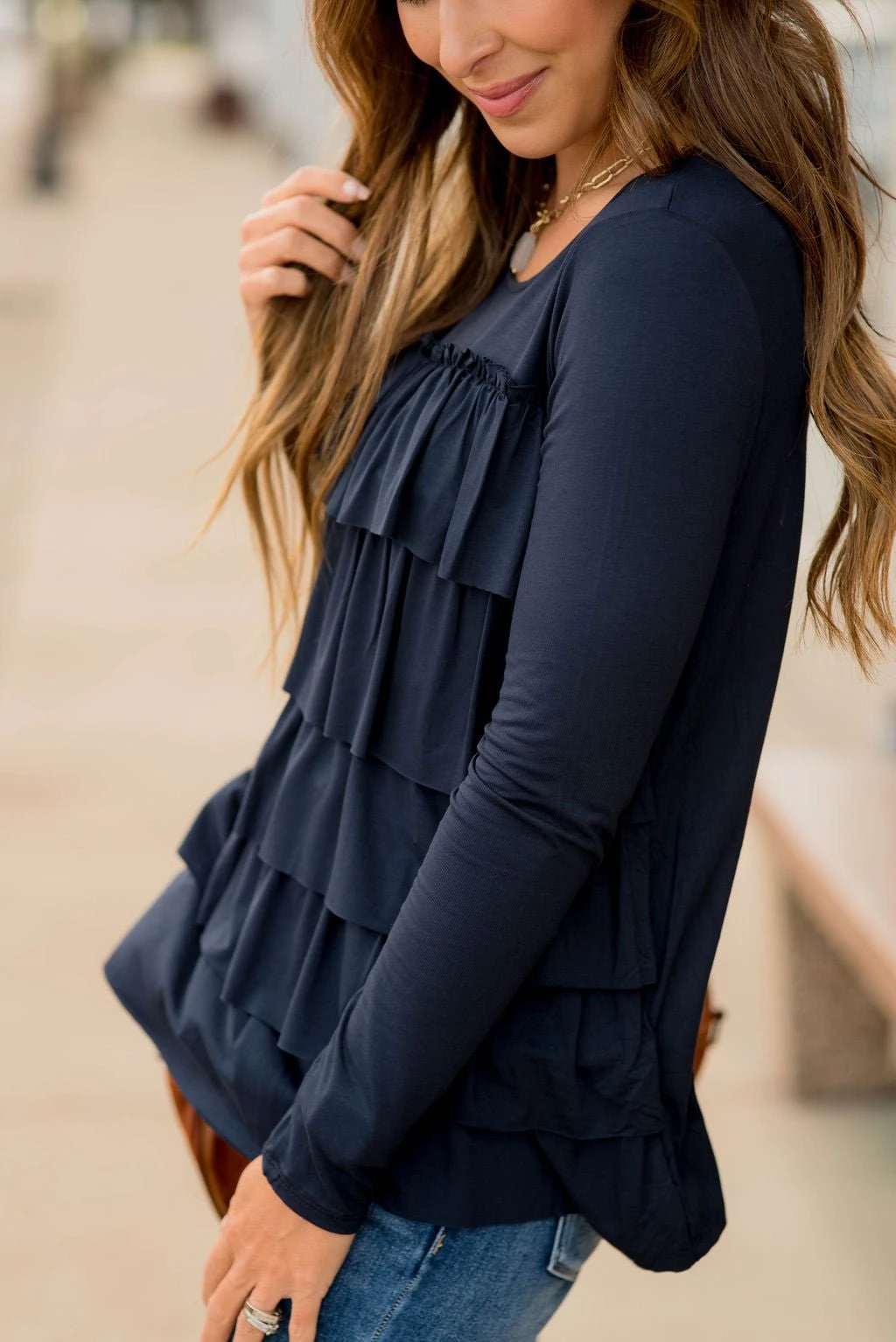 This ruffle long sleeve tee is just what you need! The multiple ruffles on the front give this tee a fun vibe!