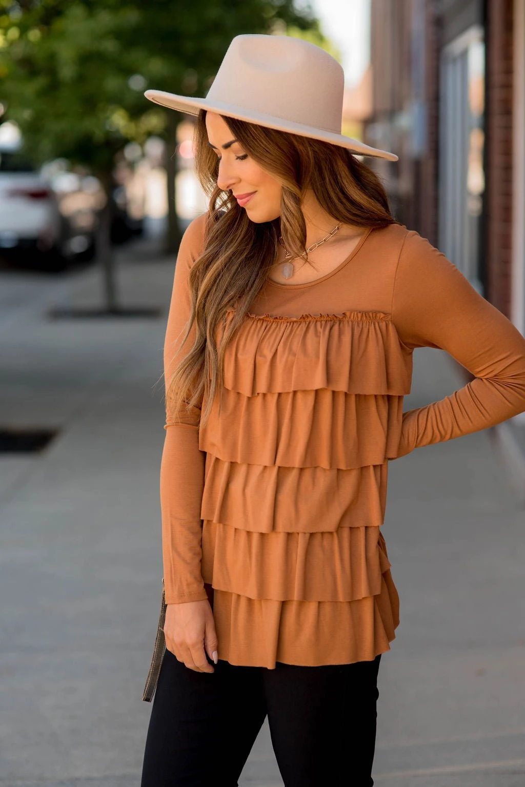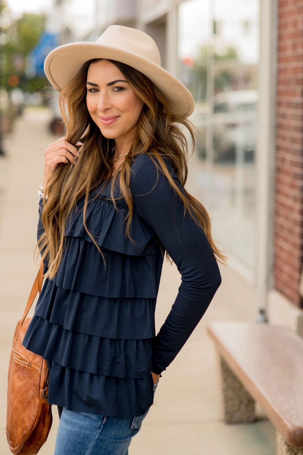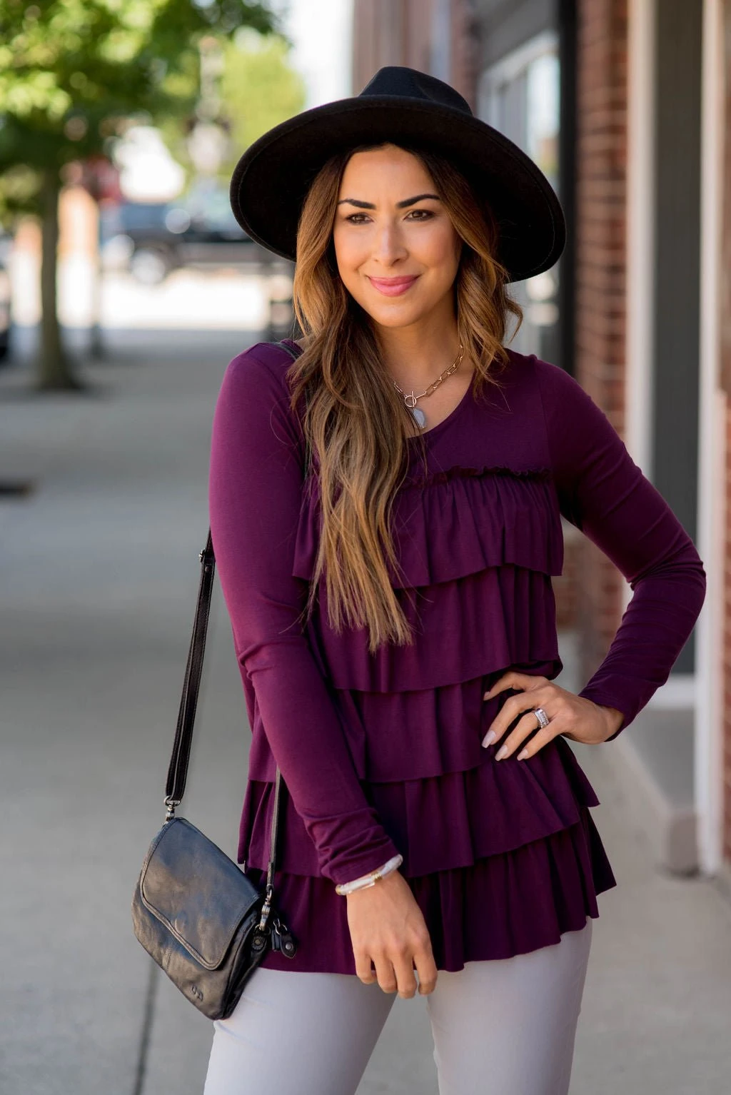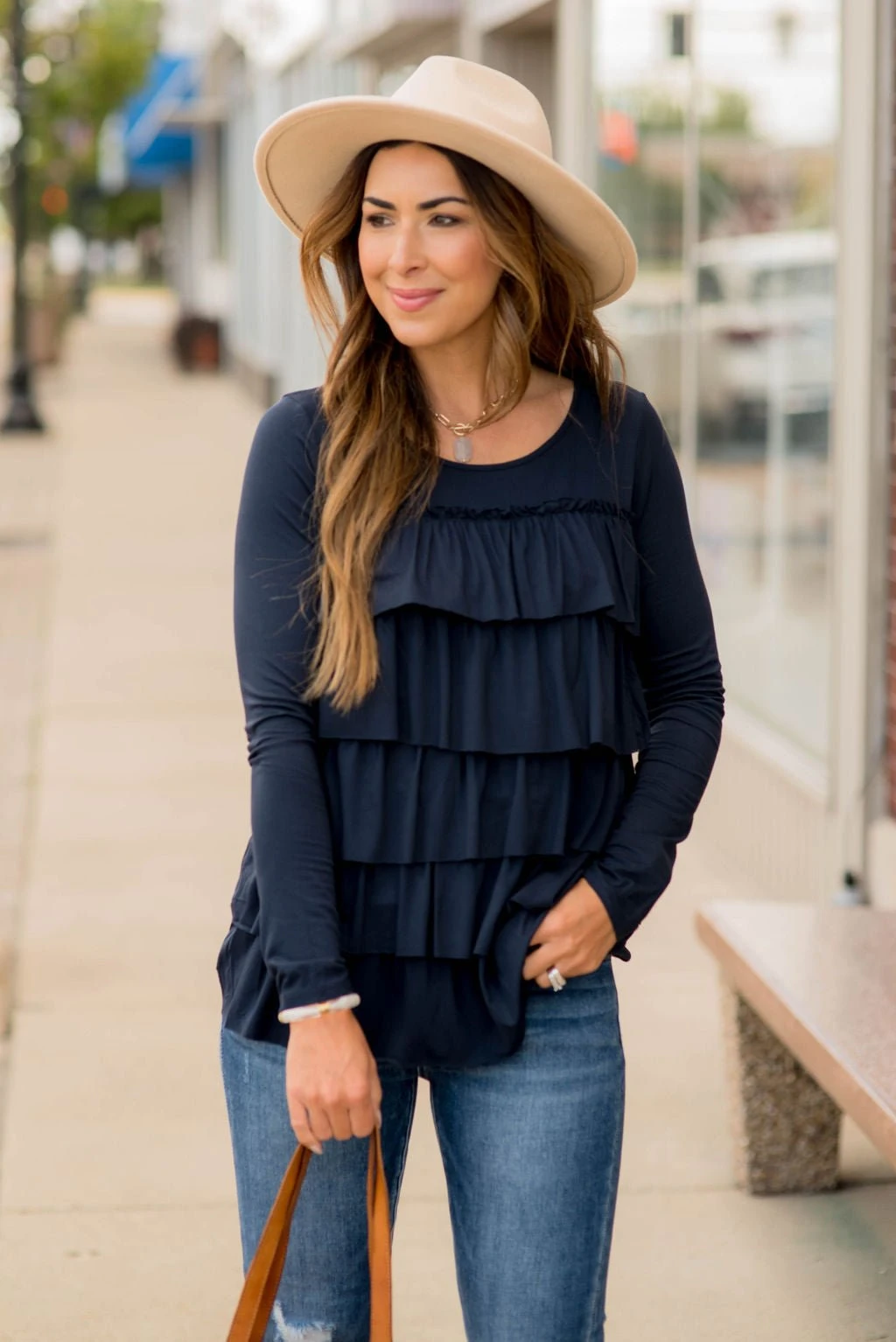 This ruffle long sleeve tee is just what you need! The multiple ruffles on the front give this tee a fun vibe!