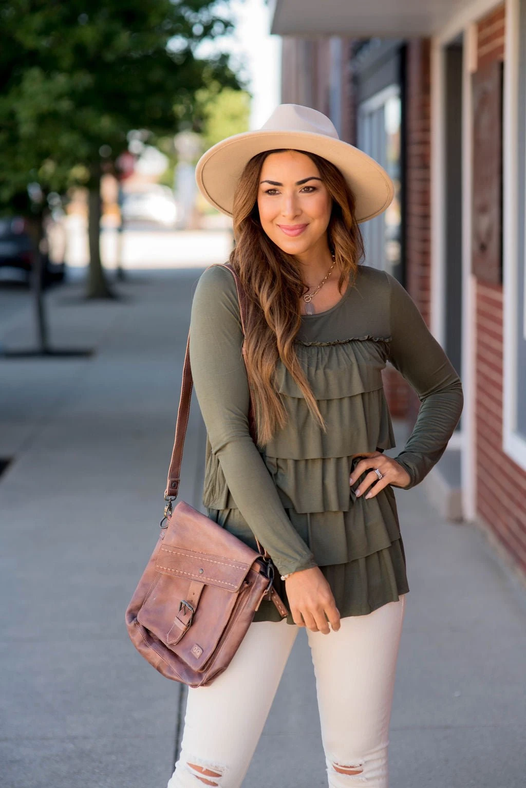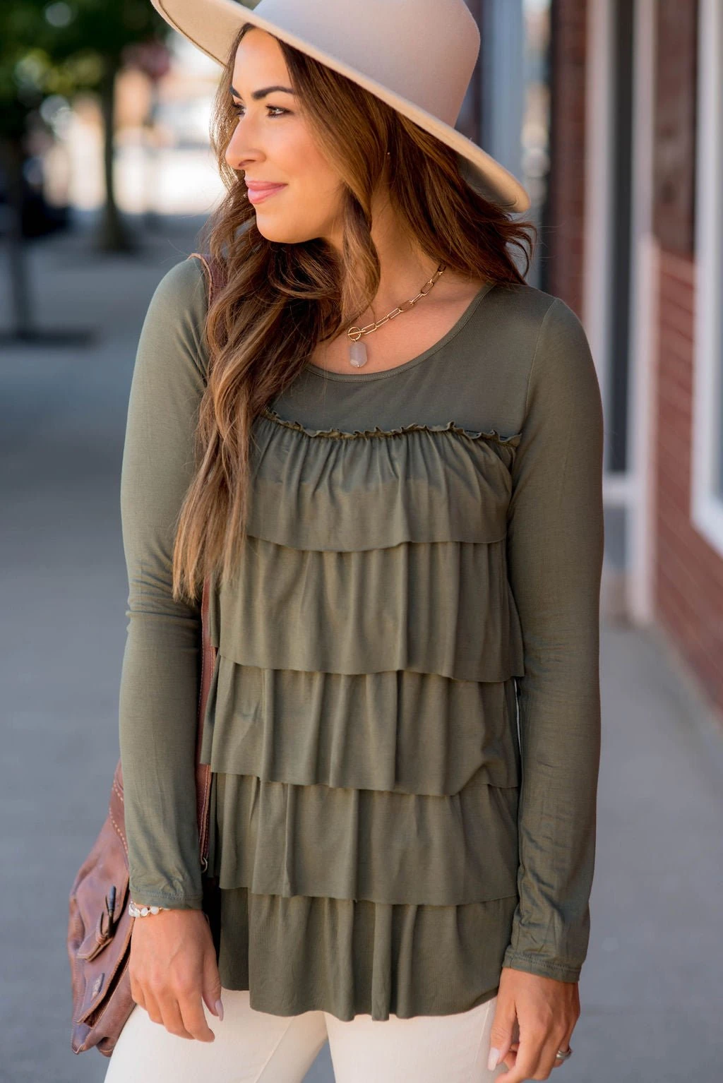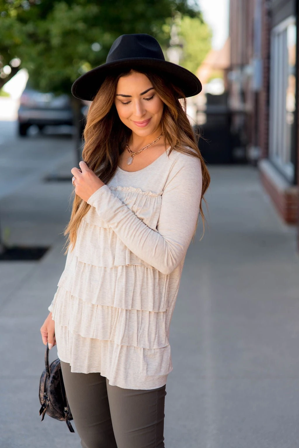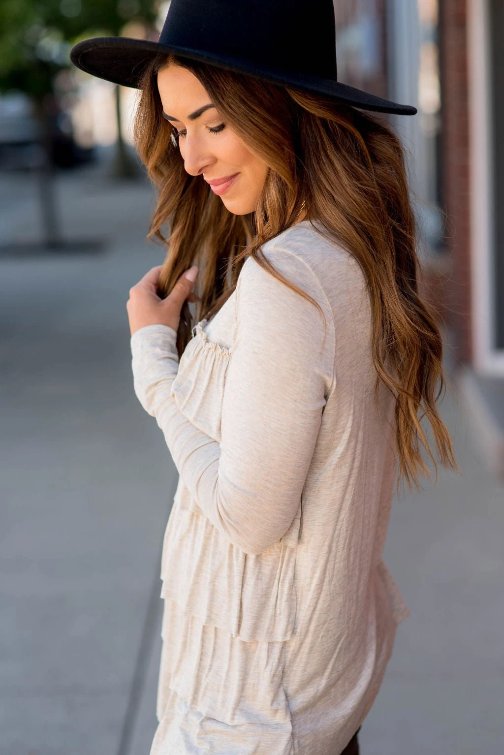 This ruffle long sleeve tee is just what you need! The multiple ruffles on the front give this tee a fun vibe!