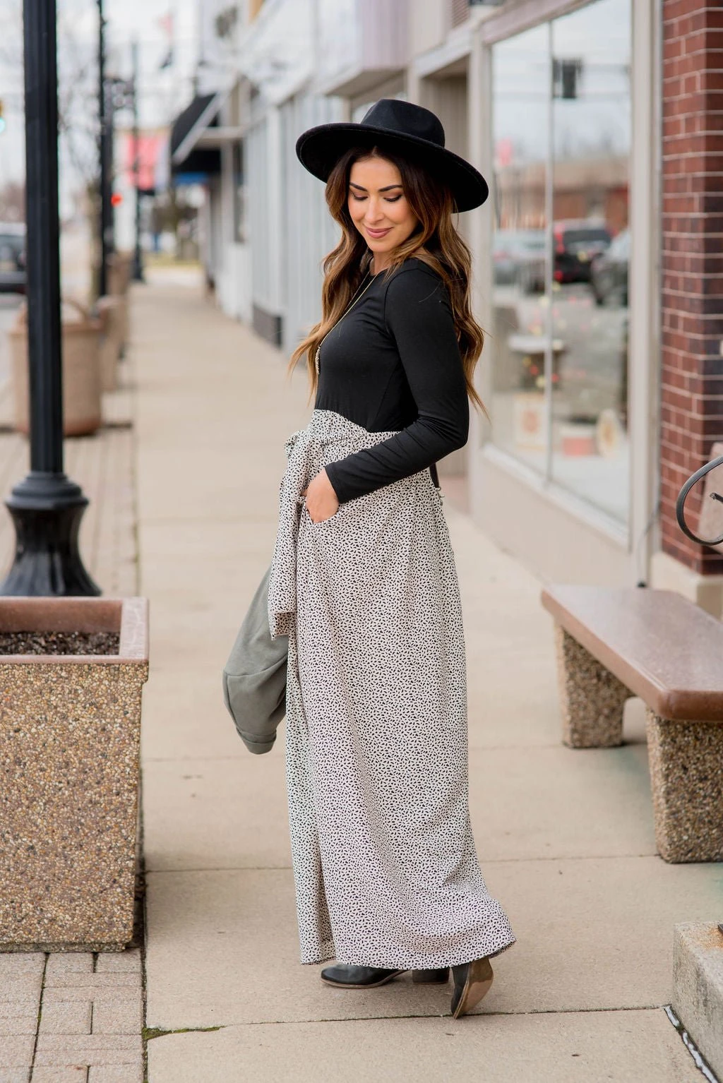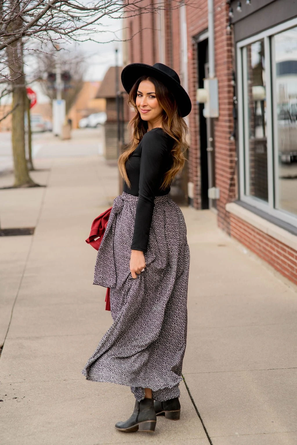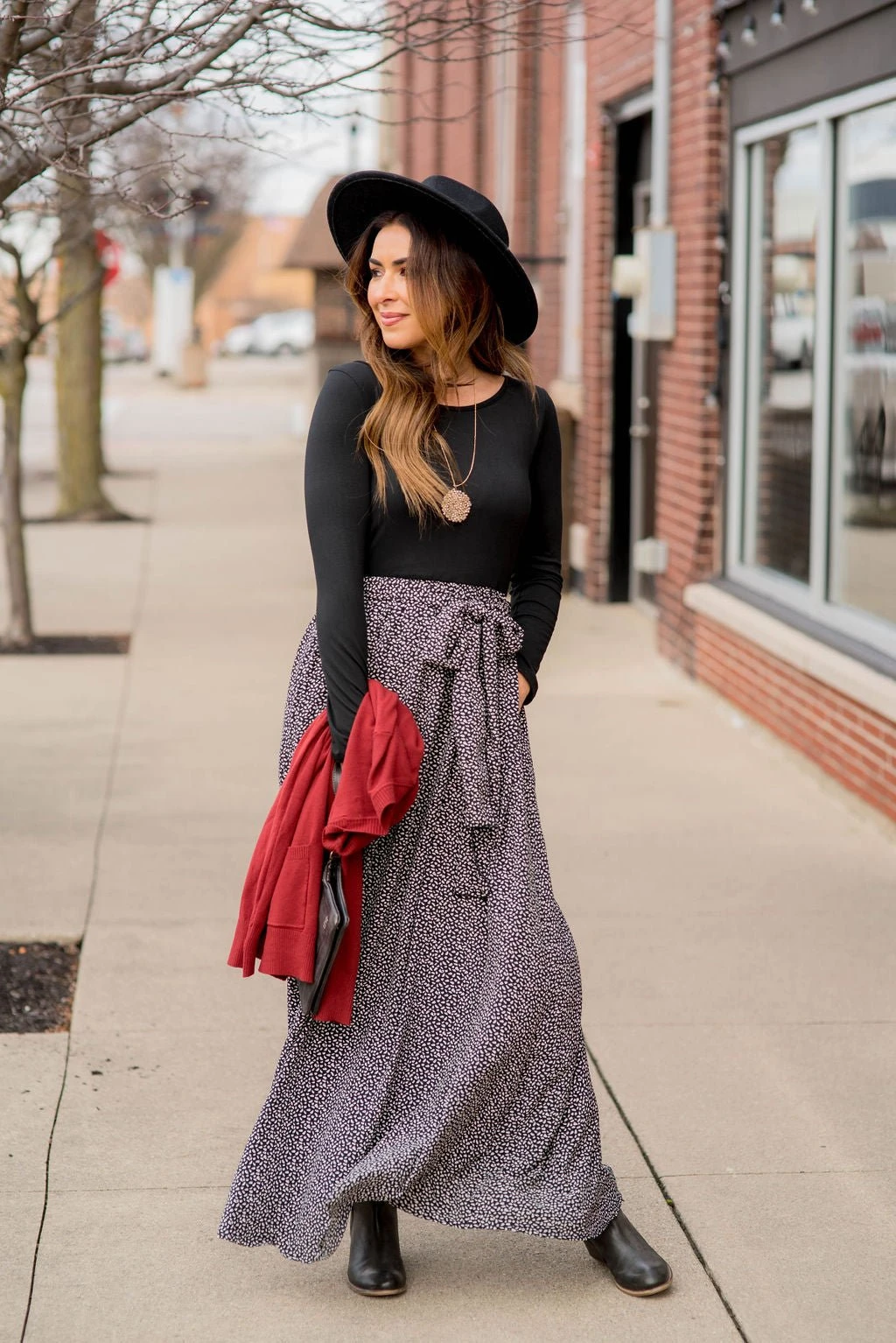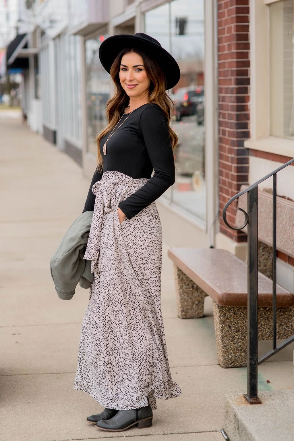We love that this maxi looks like a long sleeve tee tucked into a maxi skirt with a tie waist because it takes the hard work out of pairing an outfit for you! Lightweight enough to wear all year round but we love pairing this with booties and a jacket for those cooler days!