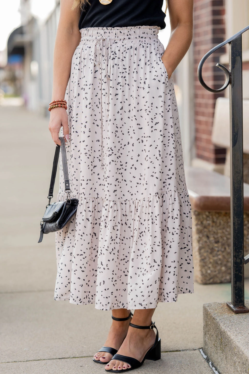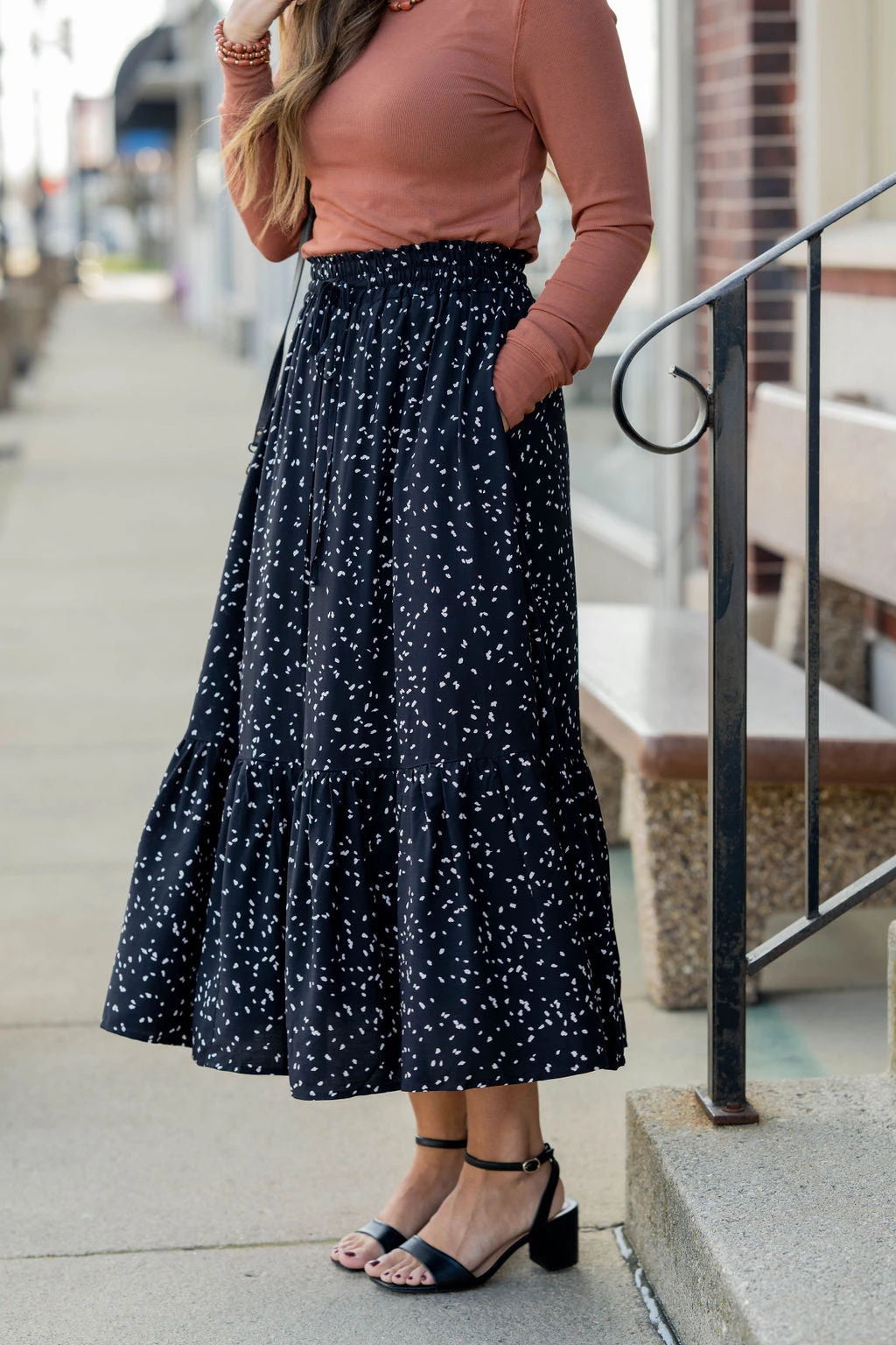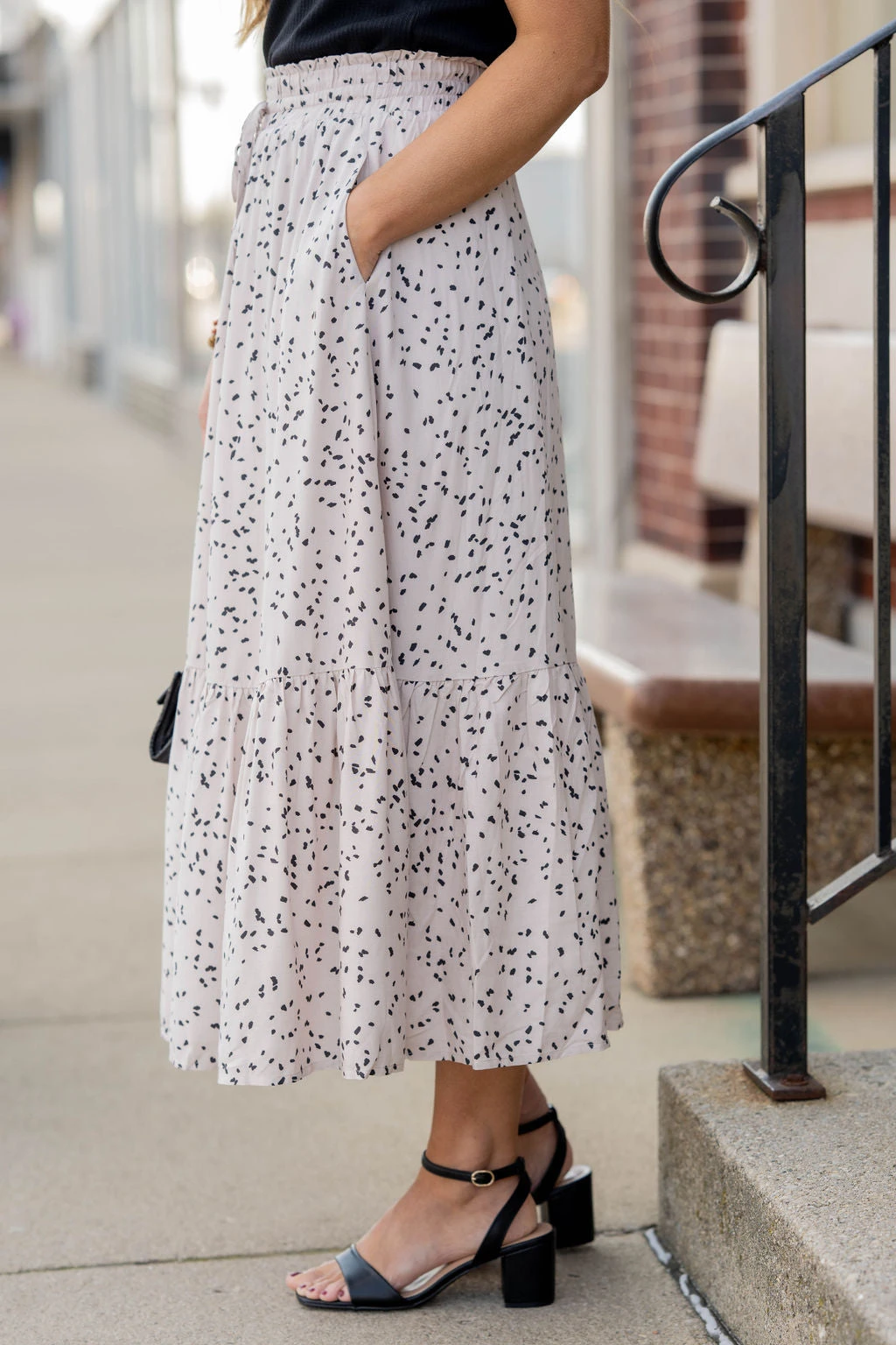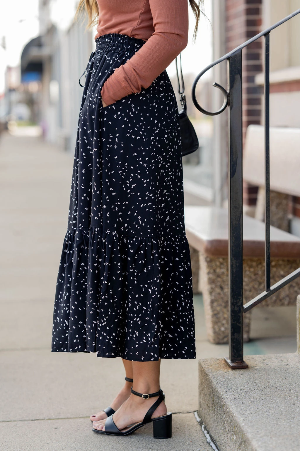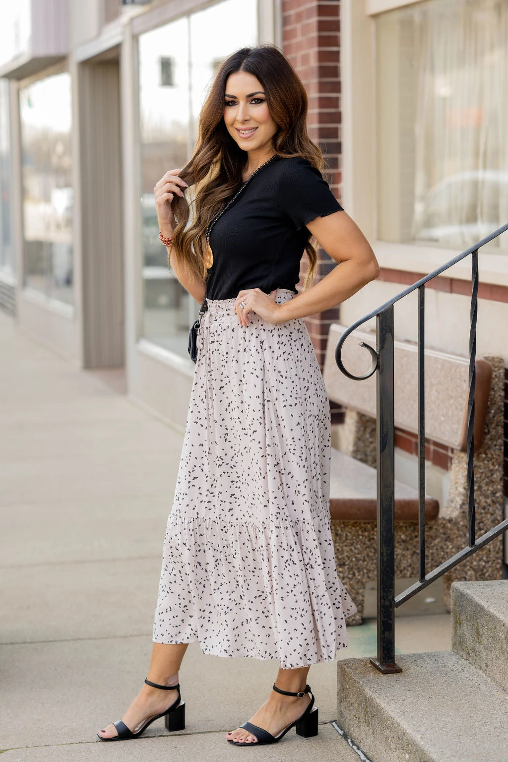 We cannot get over how stylish this skirt is! The fun print and ruffle bottom accent and tie waist make this such a cute, elegant look! Wear this skirt to any event and you are sure to receive compliments! We love tucking a blouse into this for a more elevated look or a basic or graphic tee for a casual feel!