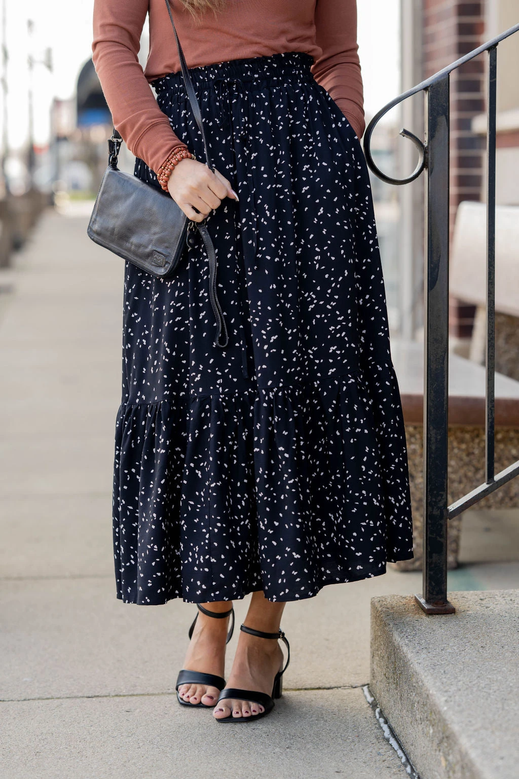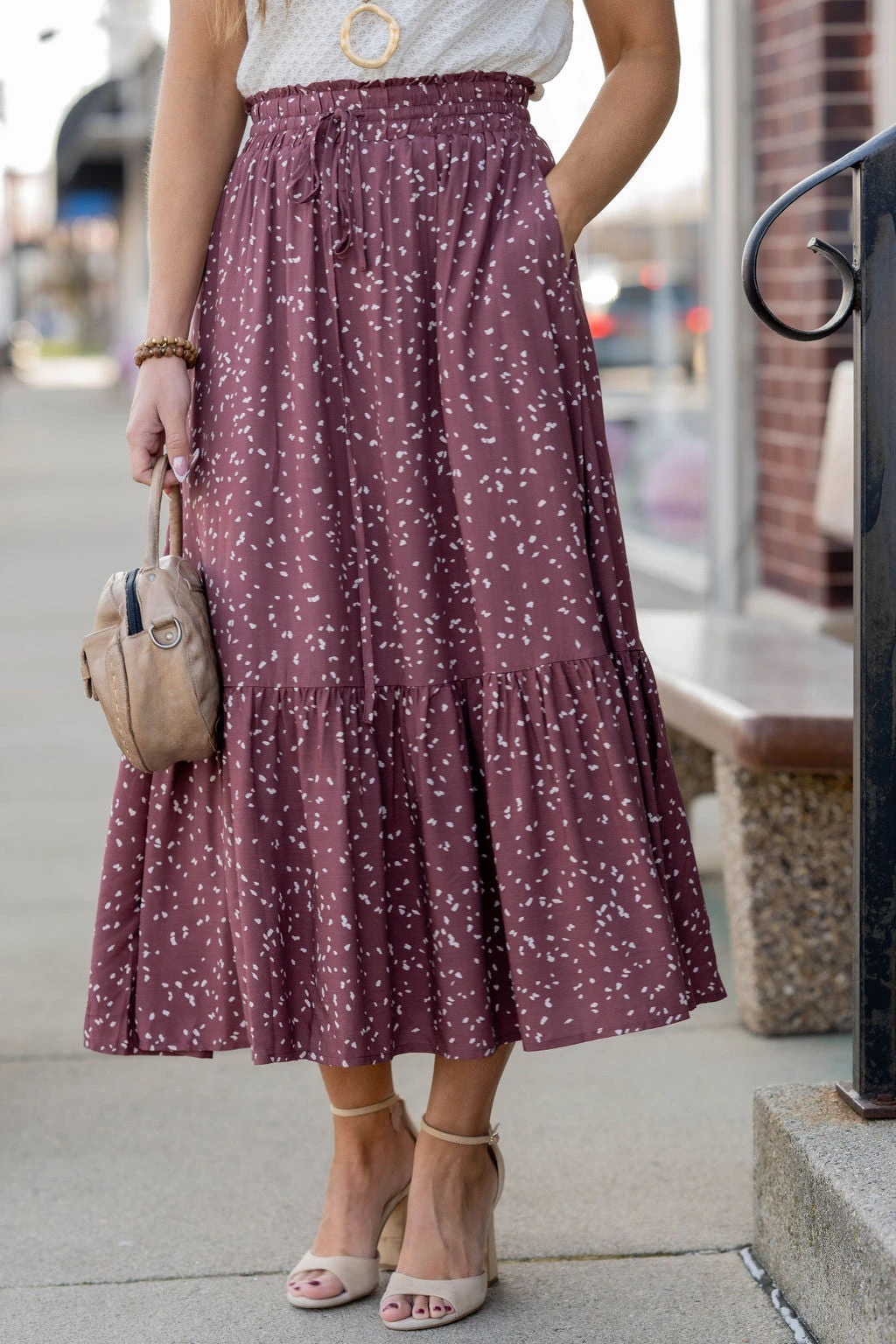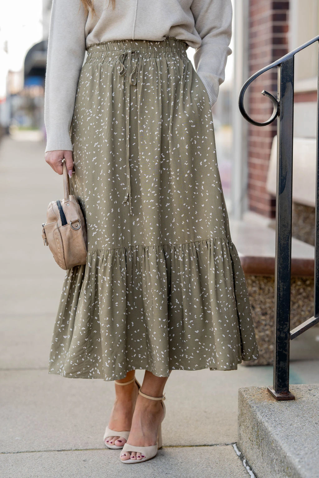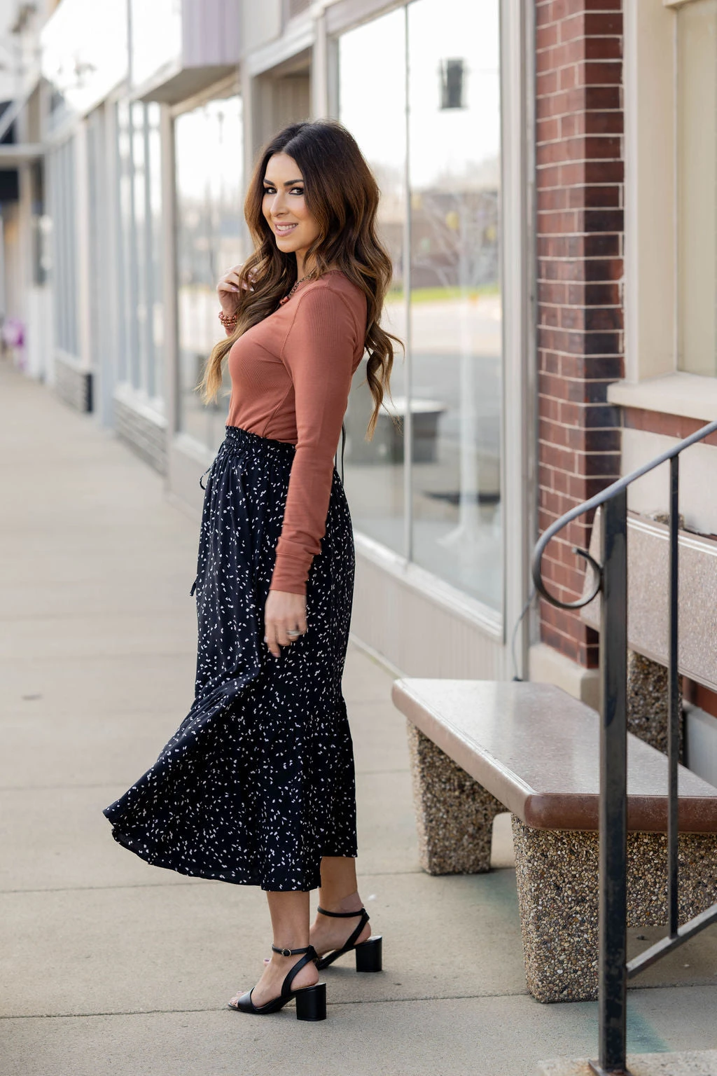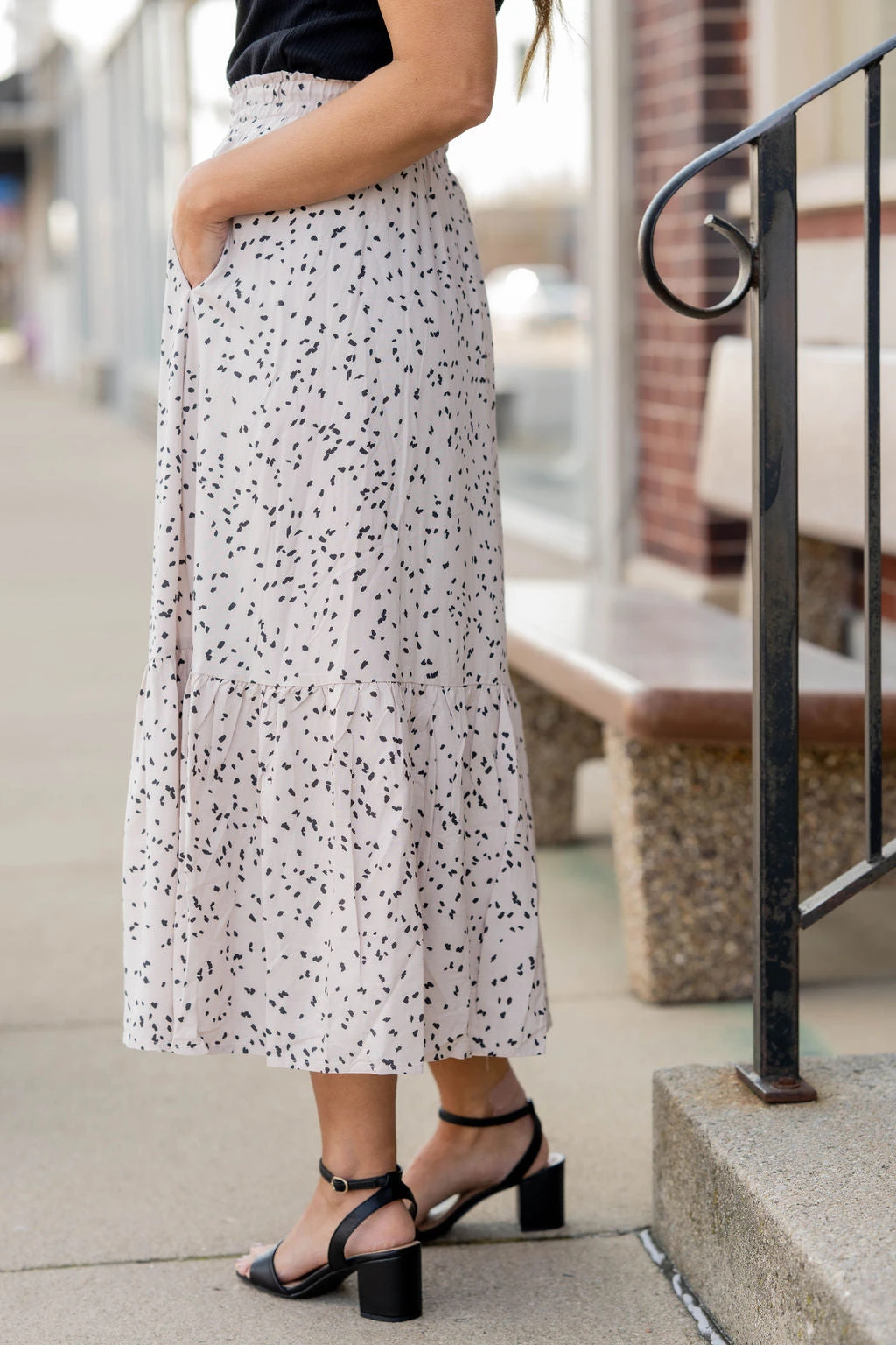 We cannot get over how stylish this skirt is! The fun print and ruffle bottom accent and tie waist make this such a cute, elegant look! Wear this skirt to any event and you are sure to receive compliments! We love tucking a blouse into this for a more elevated look or a basic or graphic tee for a casual feel!
