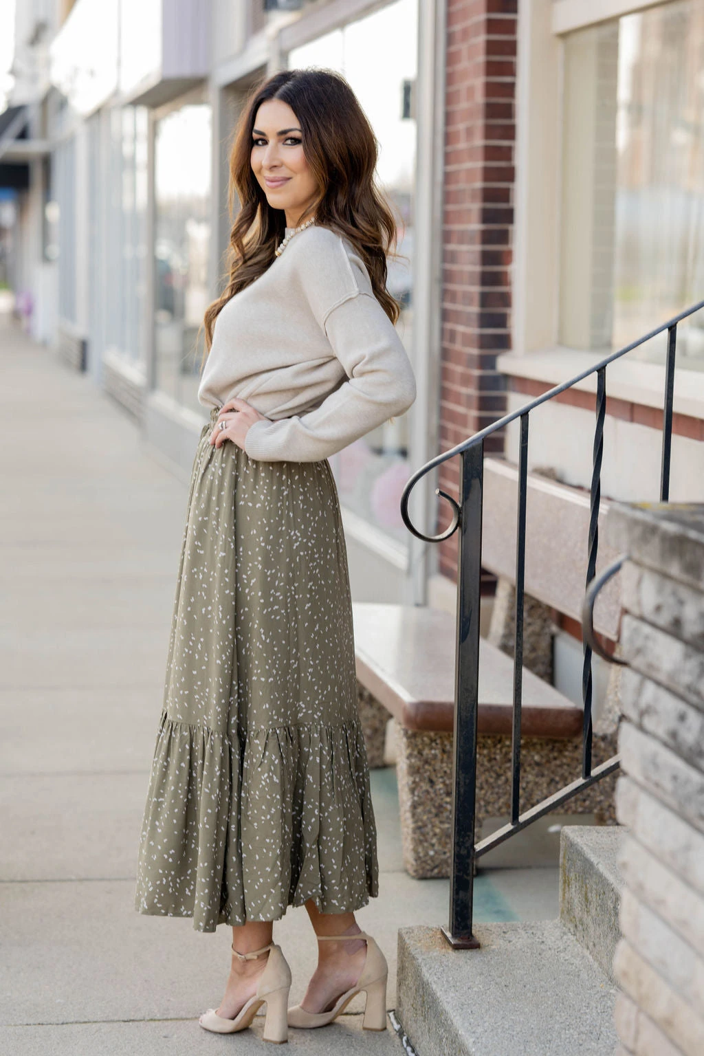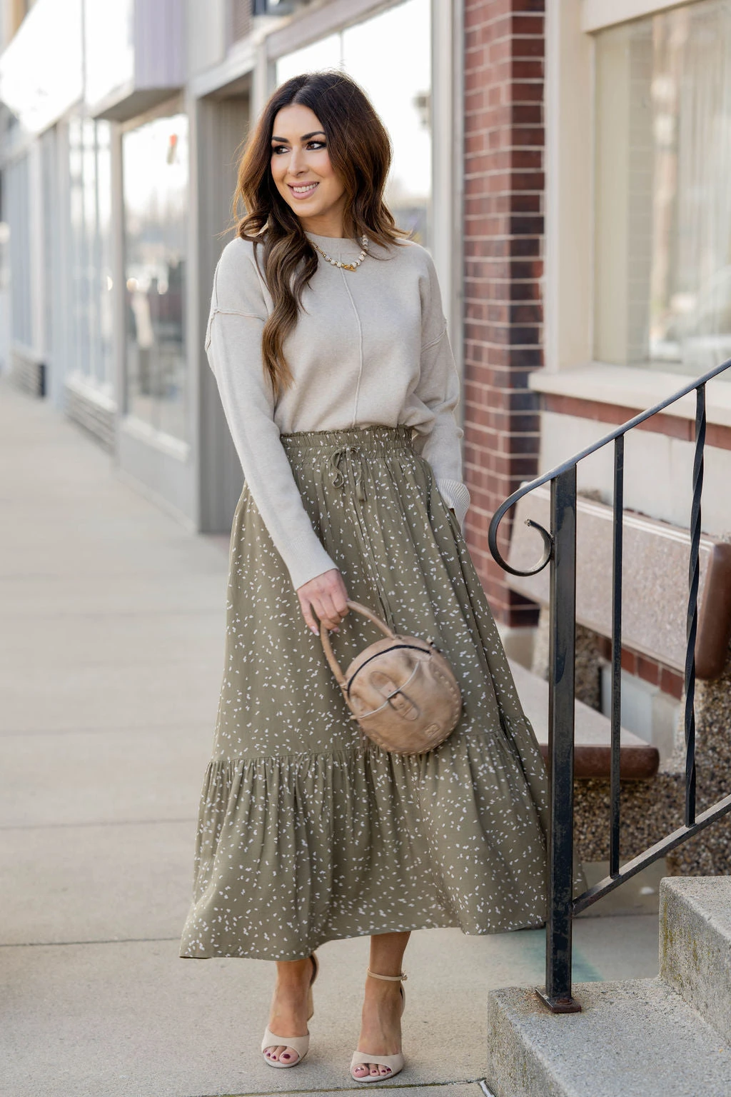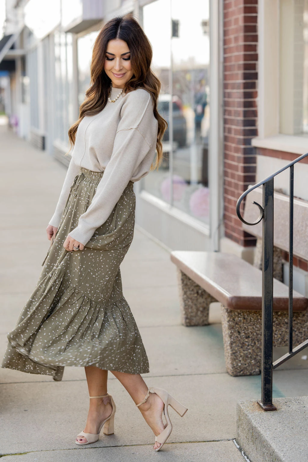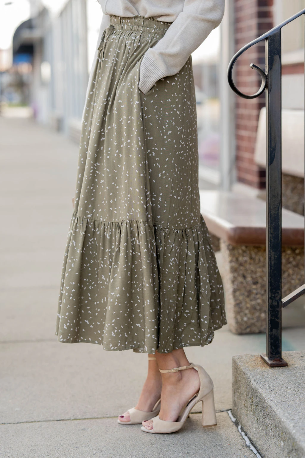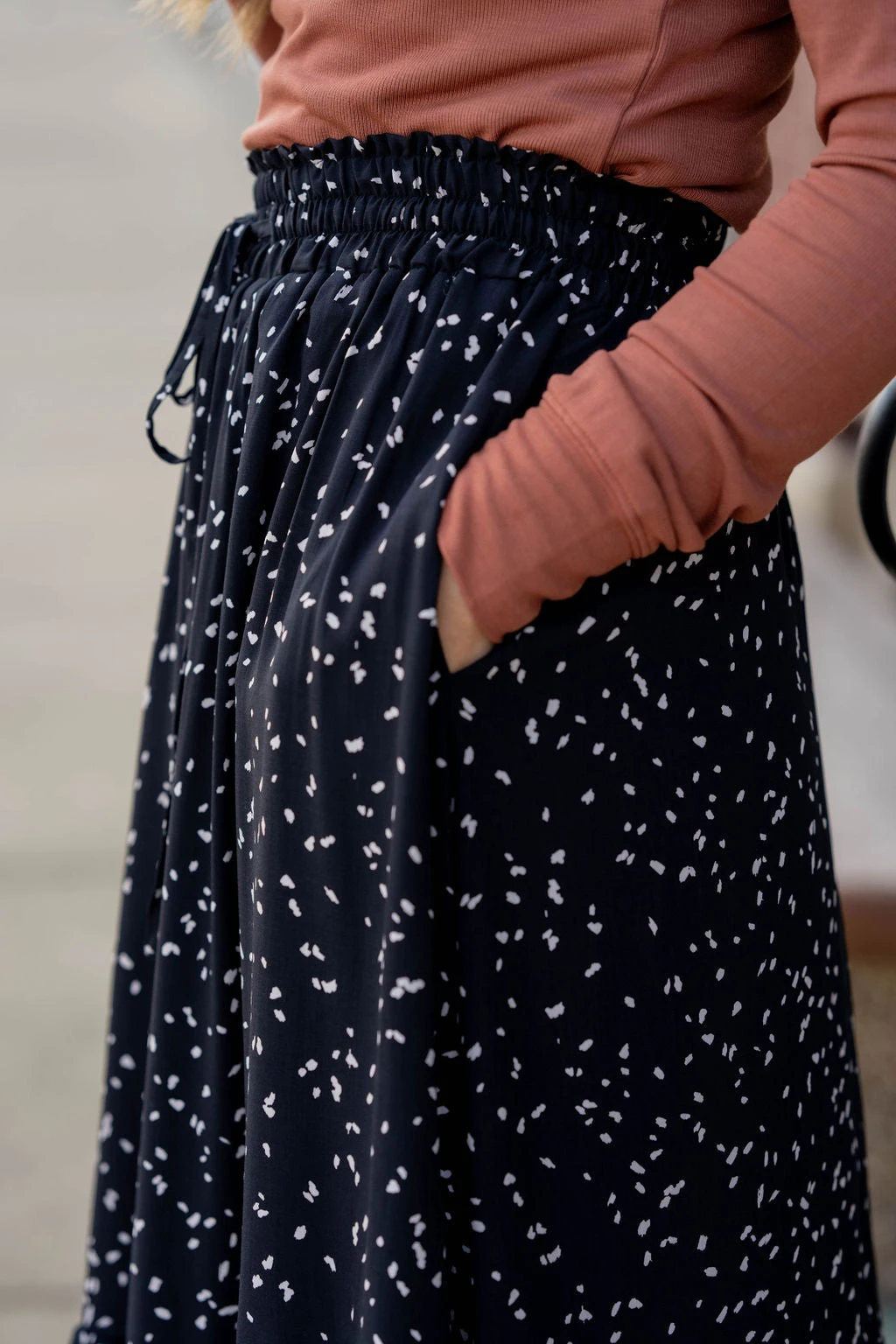 We cannot get over how stylish this skirt is! The fun print and ruffle bottom accent and tie waist make this such a cute, elegant look! Wear this skirt to any event and you are sure to receive compliments! We love tucking a blouse into this for a more elevated look or a basic or graphic tee for a casual feel!