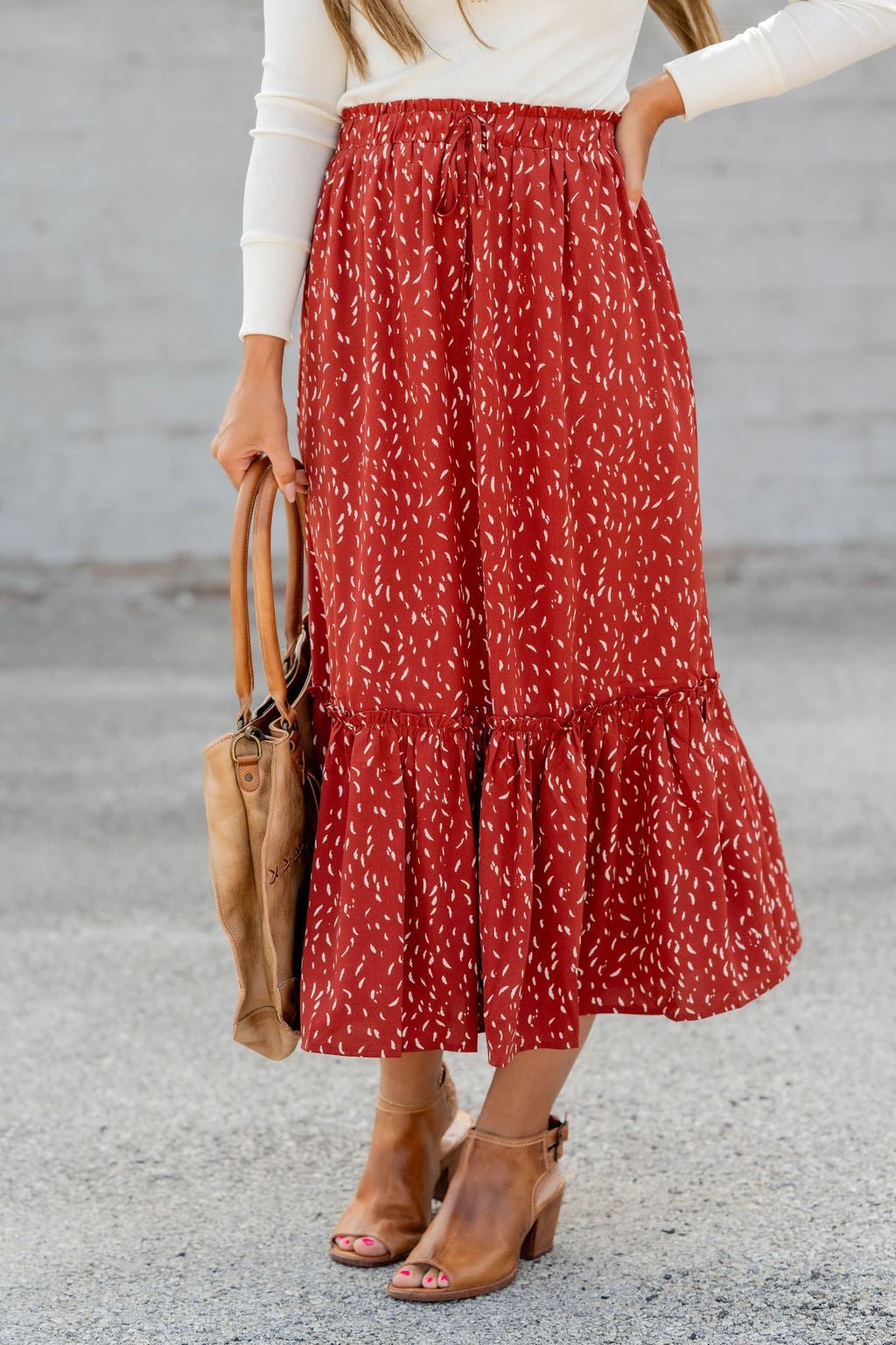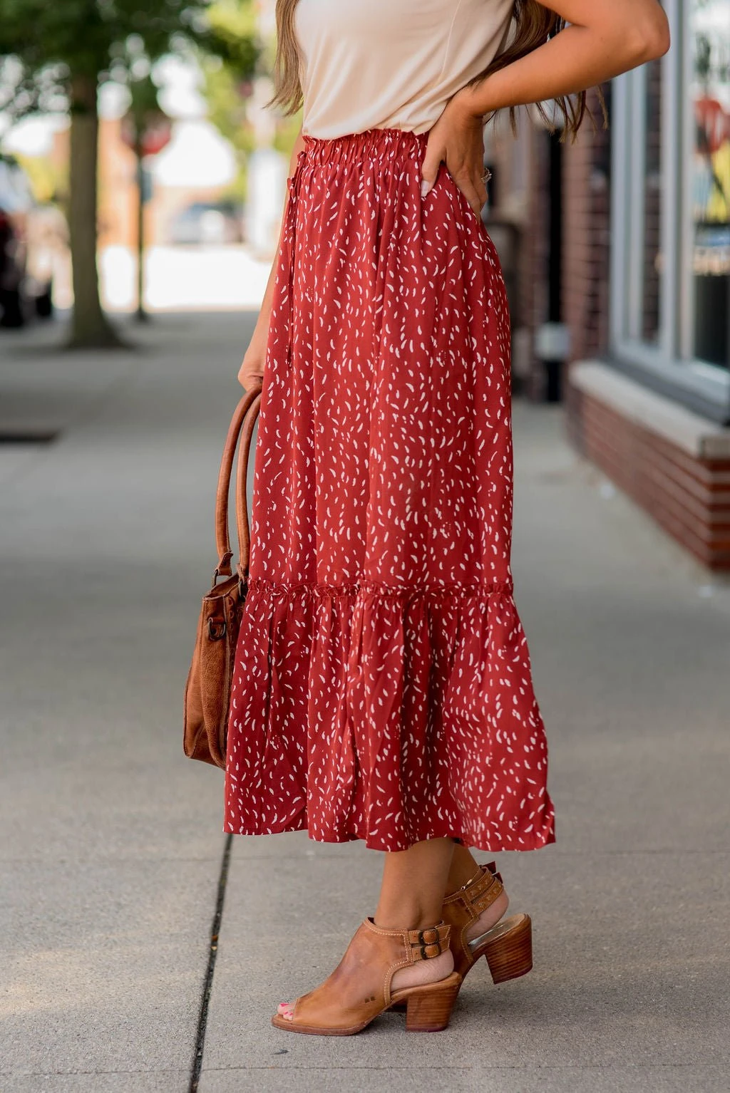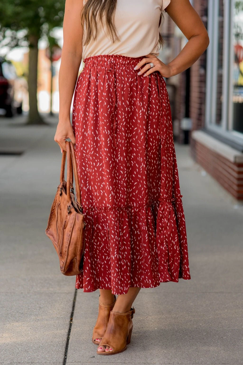 We cannot get over how stylish this skirt is! The fun print and ruffle-tier accents and tie waist make this such a cute, elegant look! Wear this skirt to any event and you are sure to receive compliments! We love tucking a blouse into this for a more elevated look or a basic or graphic tee for a casual feel!