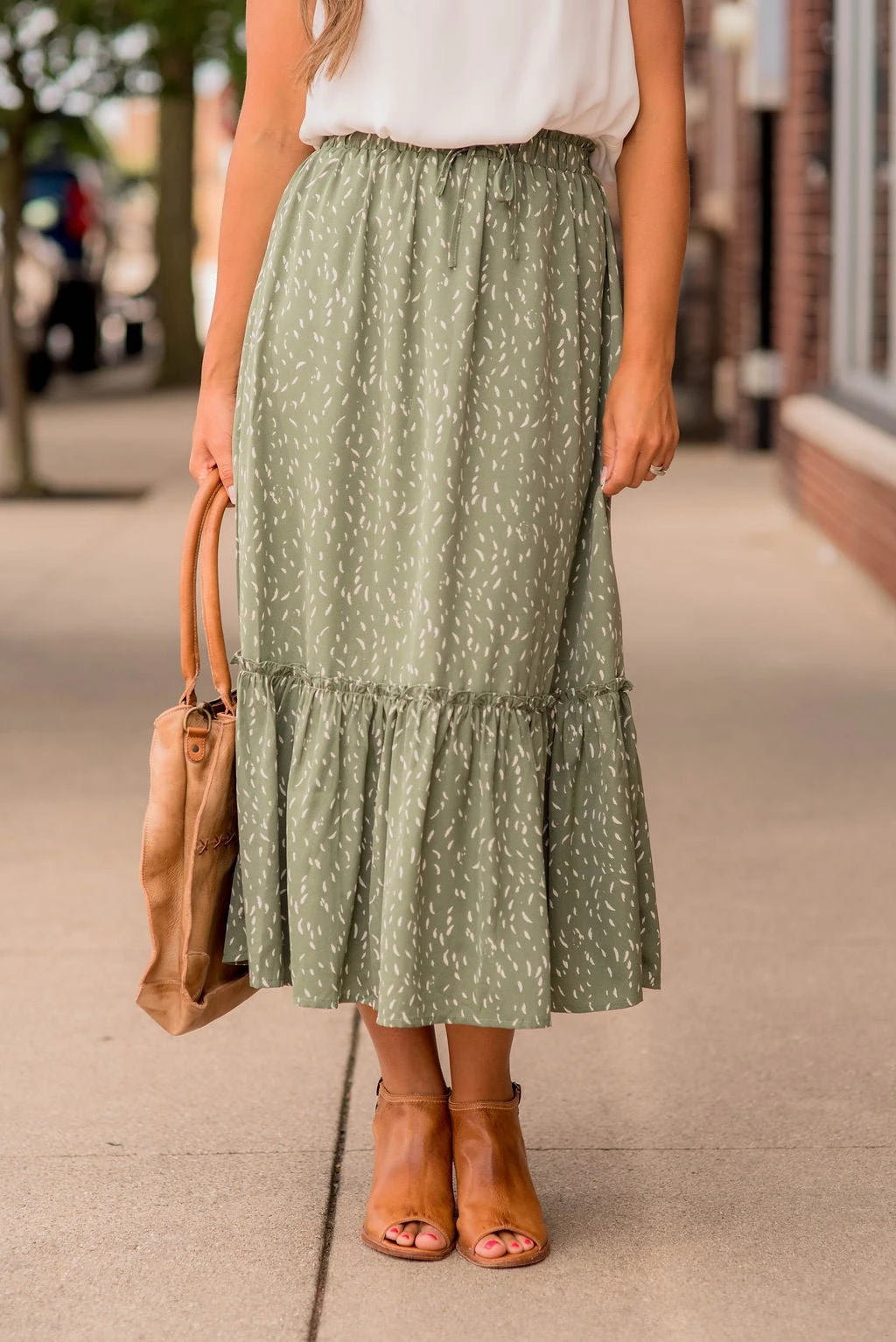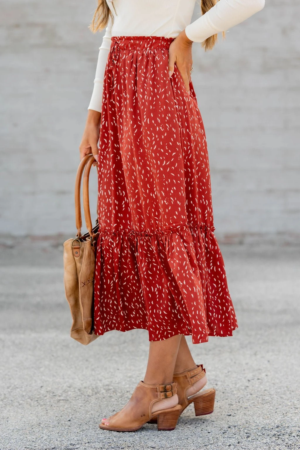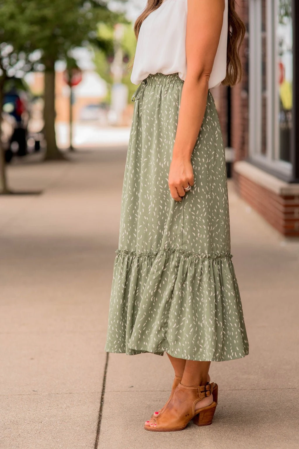 We cannot get over how stylish this skirt is! The fun print and ruffle-tier accents and tie waist make this such a cute, elegant look! Wear this skirt to any event and you are sure to receive compliments! We love tucking a blouse into this for a more elevated look or a basic or graphic tee for a casual feel!