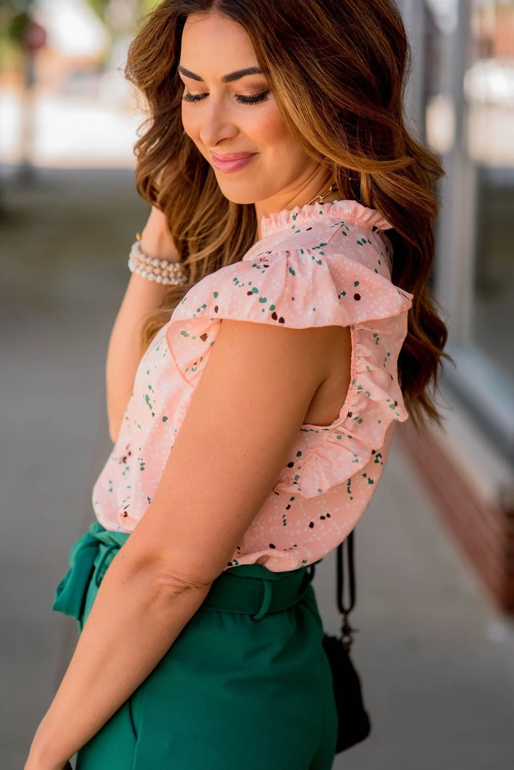 The bold colors and fun splattered print create such a unique and eye-catching look! The flutter accents surely take this over the top! Pair with shorts or a skirt in the warmer months or with a cardigan, blazer, or jacket in the cooler ones! This can be dressed up or down with your favorite accessories for wherever the day takes you!