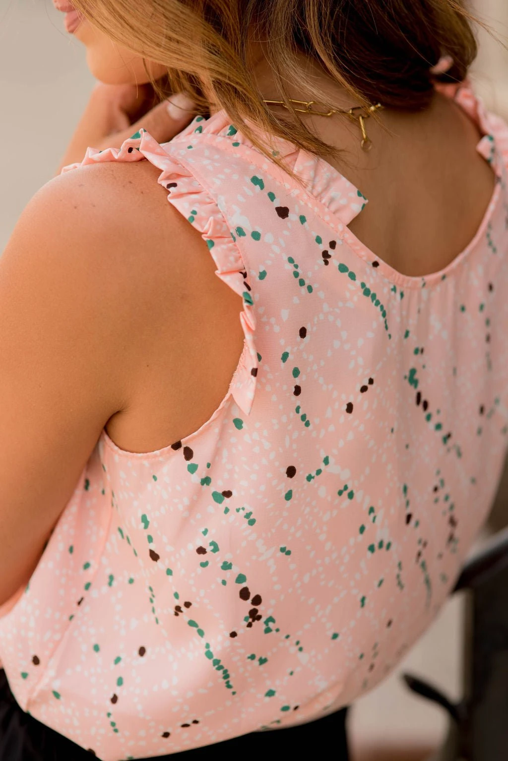 We love how unique this tank is! The colors, splattered print, and the ruffled trim are so fun and stylish! Pair this tank with jeans or joggers for a bold, unique look or layer up in the cooler months with a cardigan or shacket!