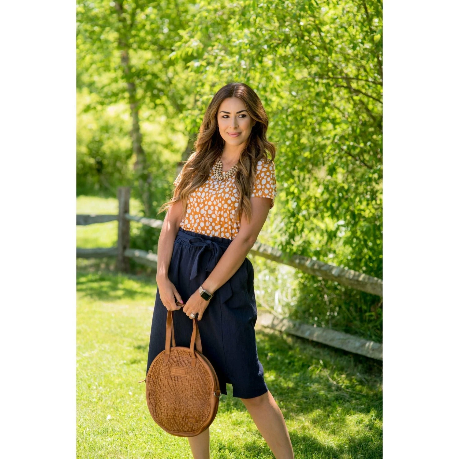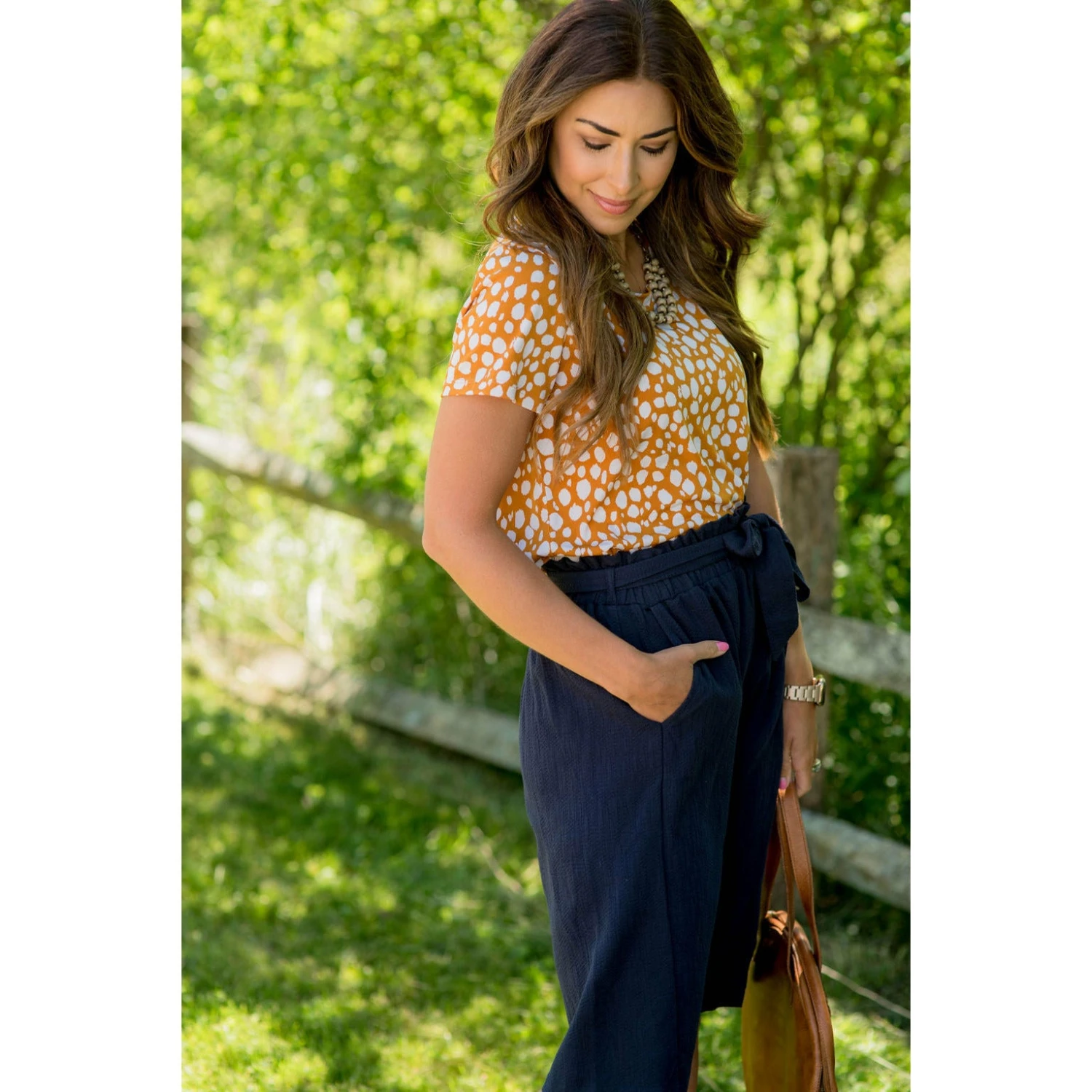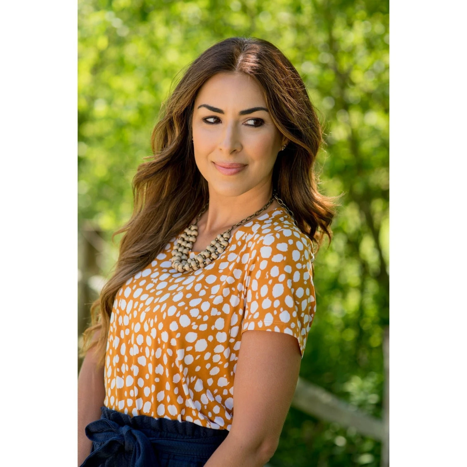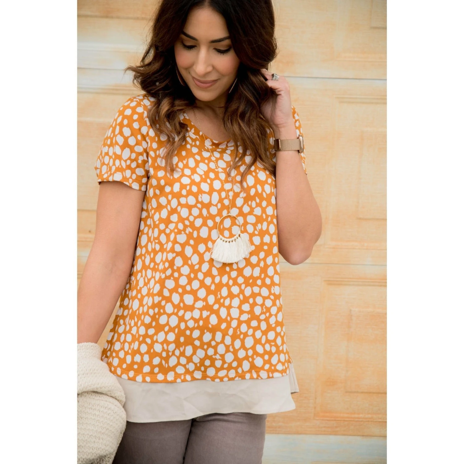 Do you like the layered look without actually having to layer tops? This Spotted Blouse Bottom Tee gives you that look! Pair it with jeggings and a Beaded Fringe Necklace for an amazing look!