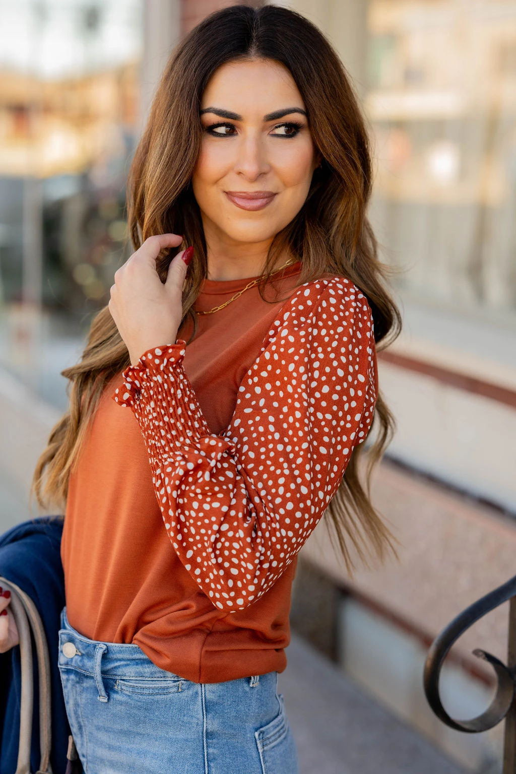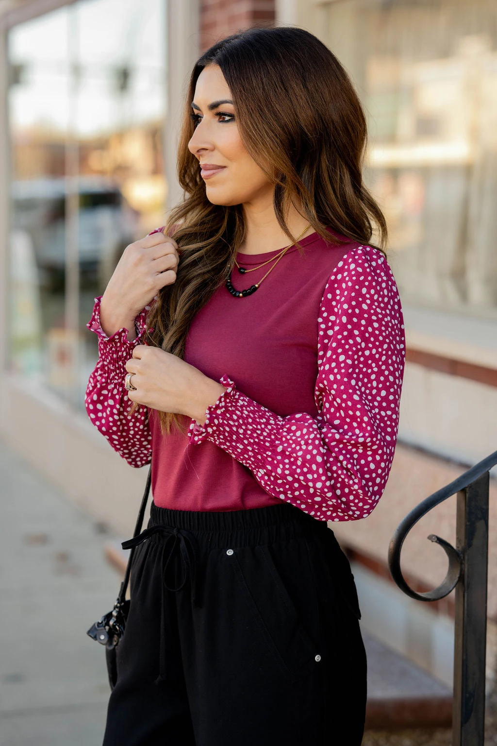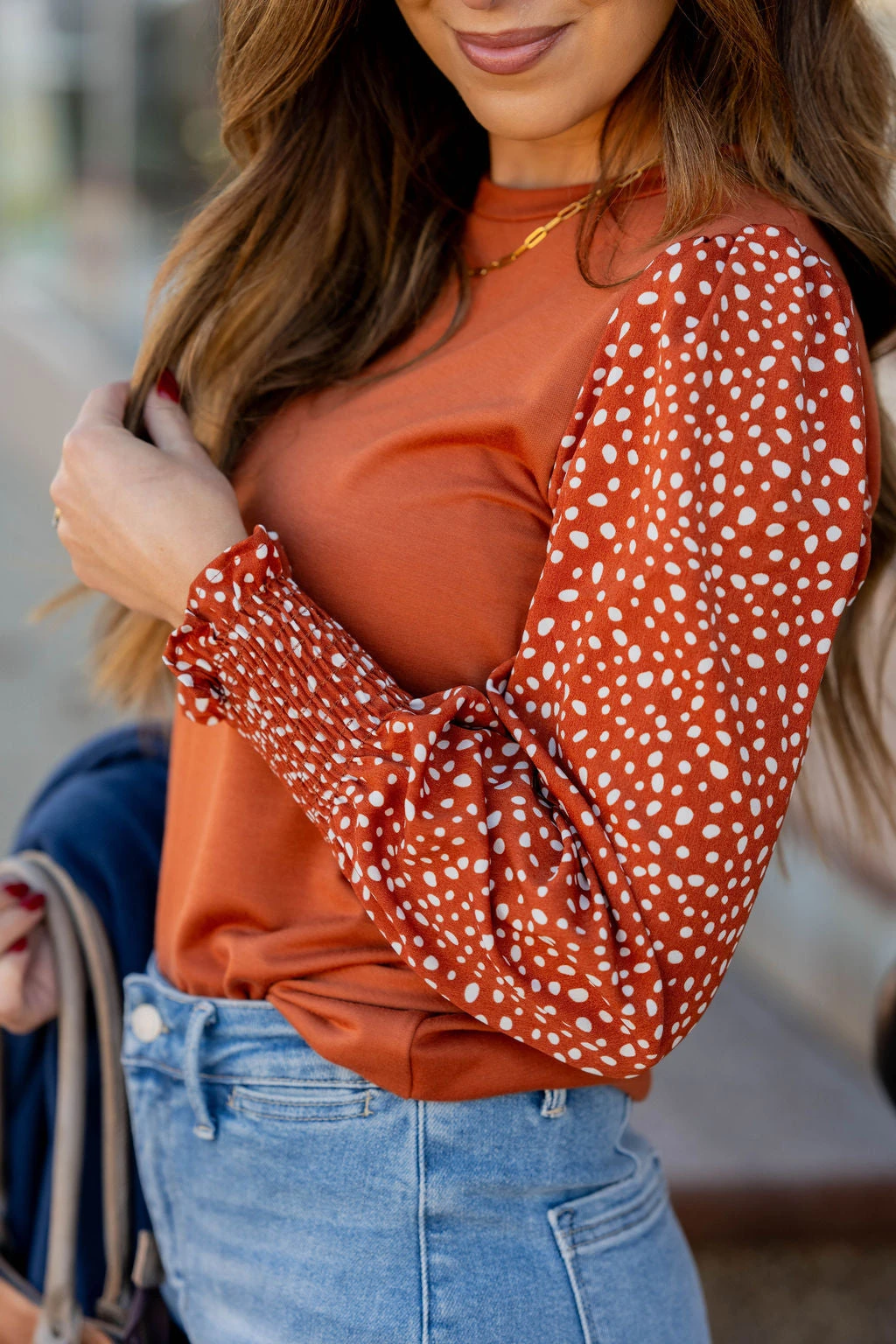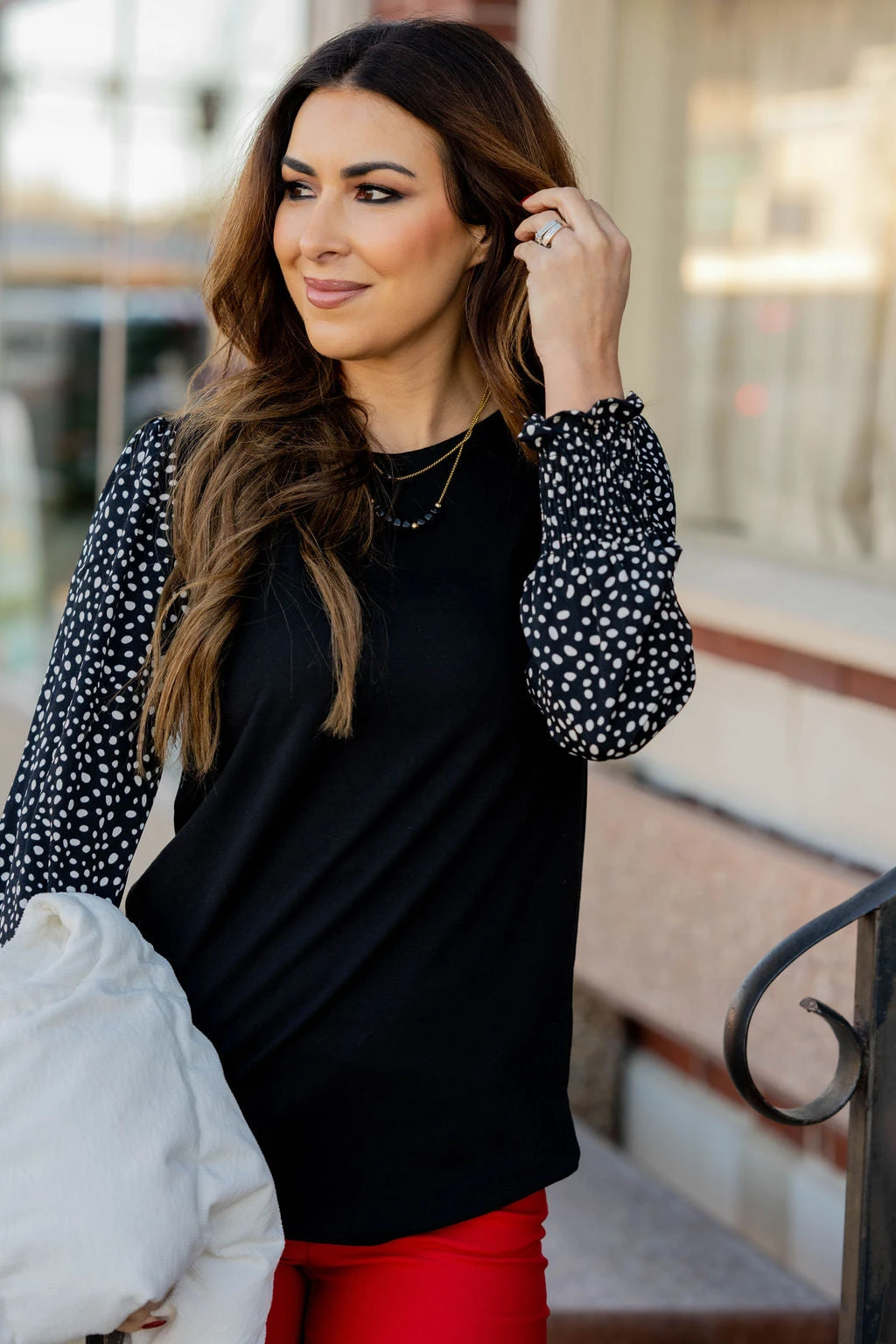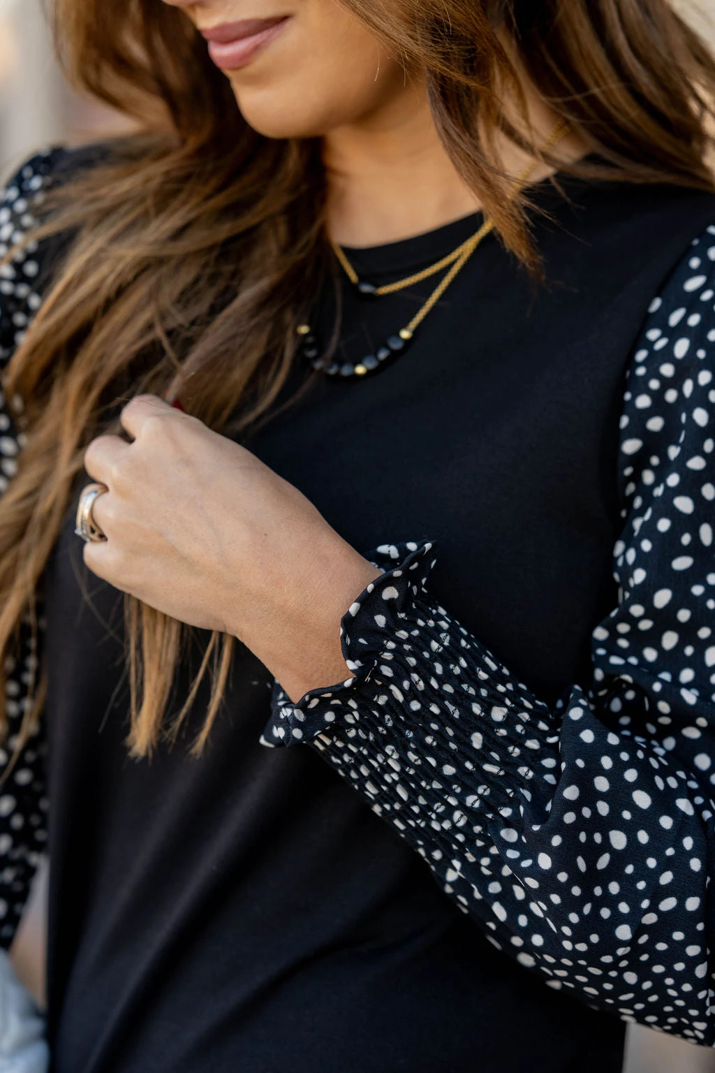 How cute is this blouse? With spotted sleeves and a solid body, this is a piece that you can dress up or down, depending on what you want! The cinched detailing on the sleeves elevates this top. It also looks great with a cardigan, vest, blazer, or jacket over it!