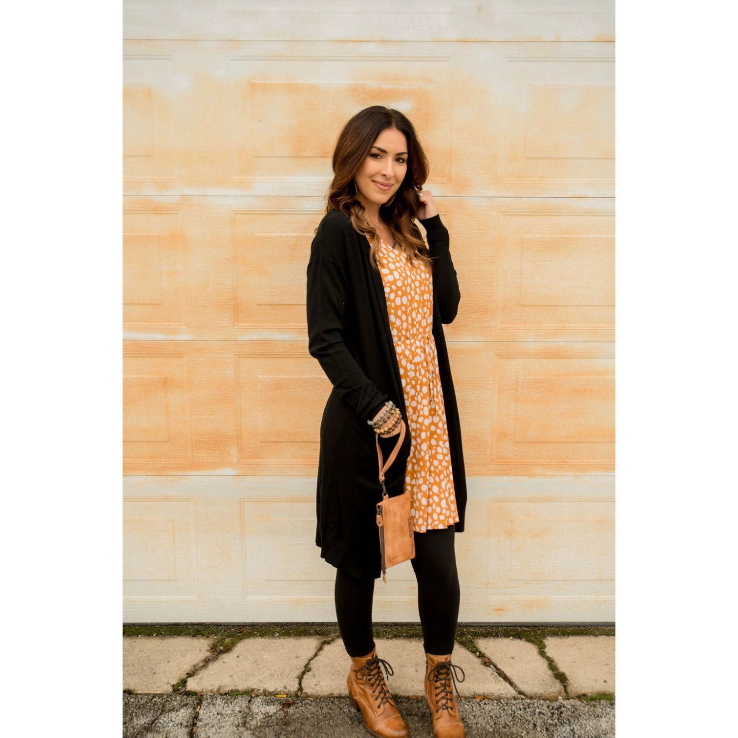 This mustard dress has the perfect detailing of white leopard print and cinched waisted line. Could be paired with a denim jacket or a cardigan with/without leggings.Â