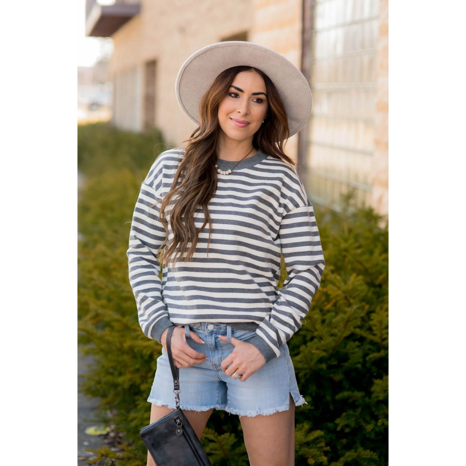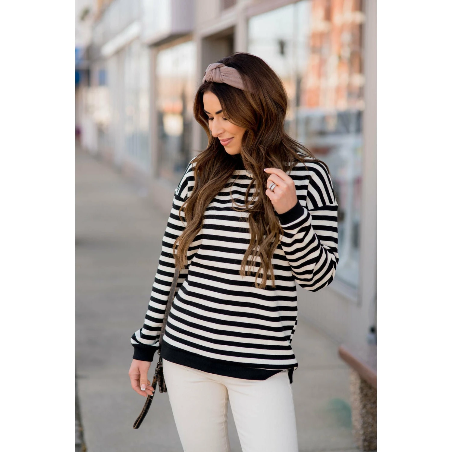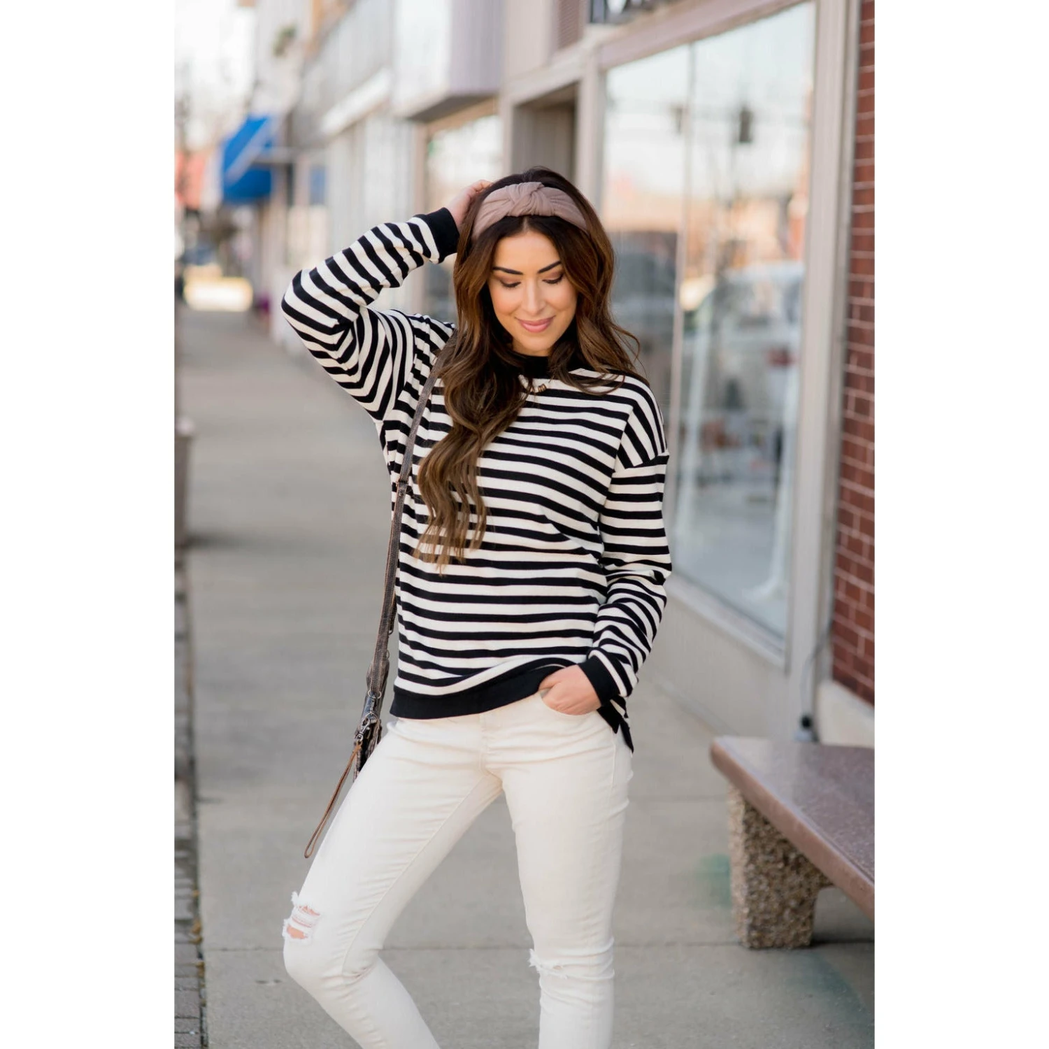 Striped sweaters never go out of fashion! This particular sweater is warm, and has light and dark stripes made to stand out. You can throw it on with a pair of jeans, or even dress it up with skirt, If you are in need of a warm sweater, this is the one for you!