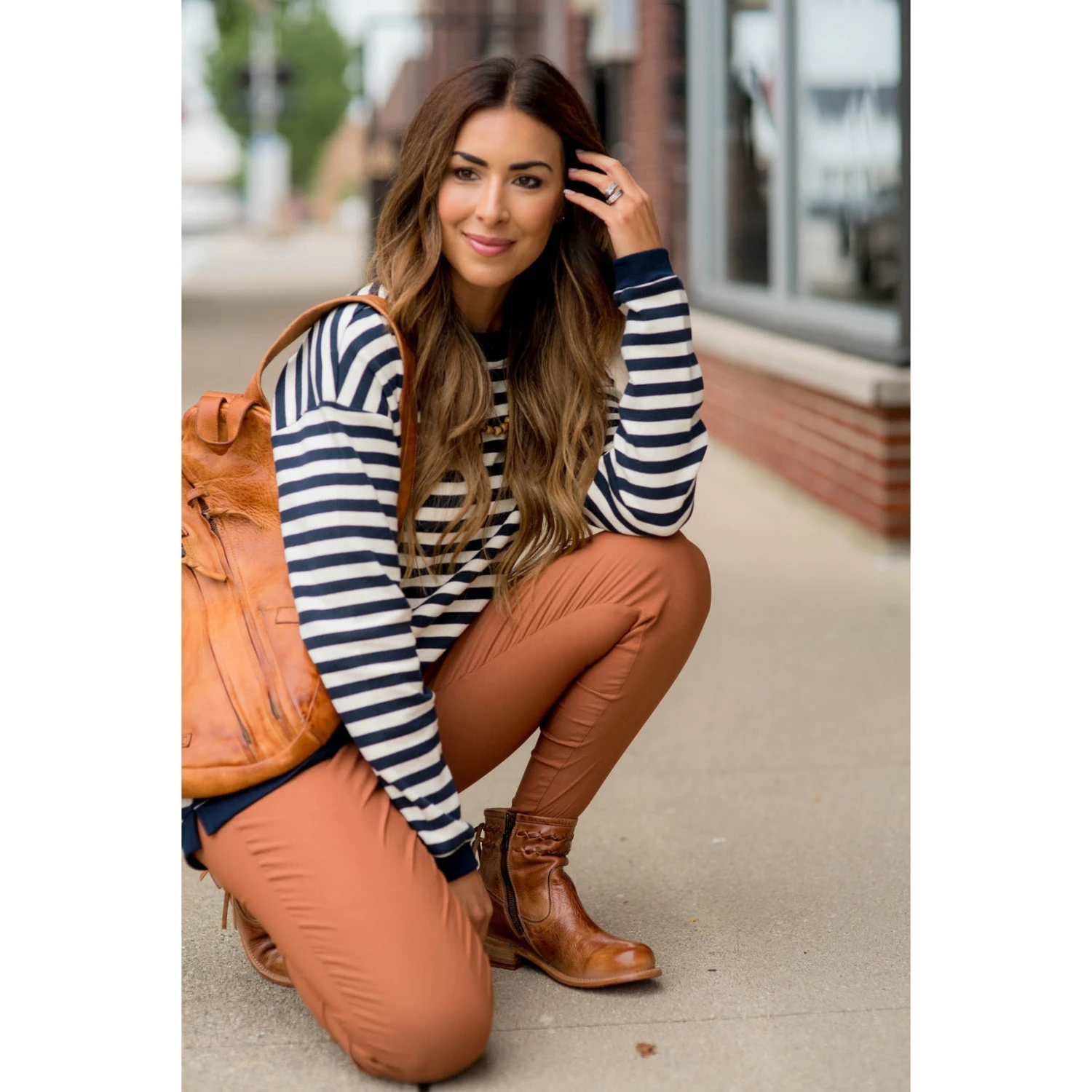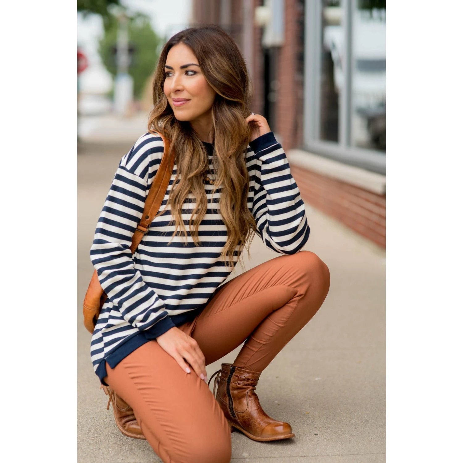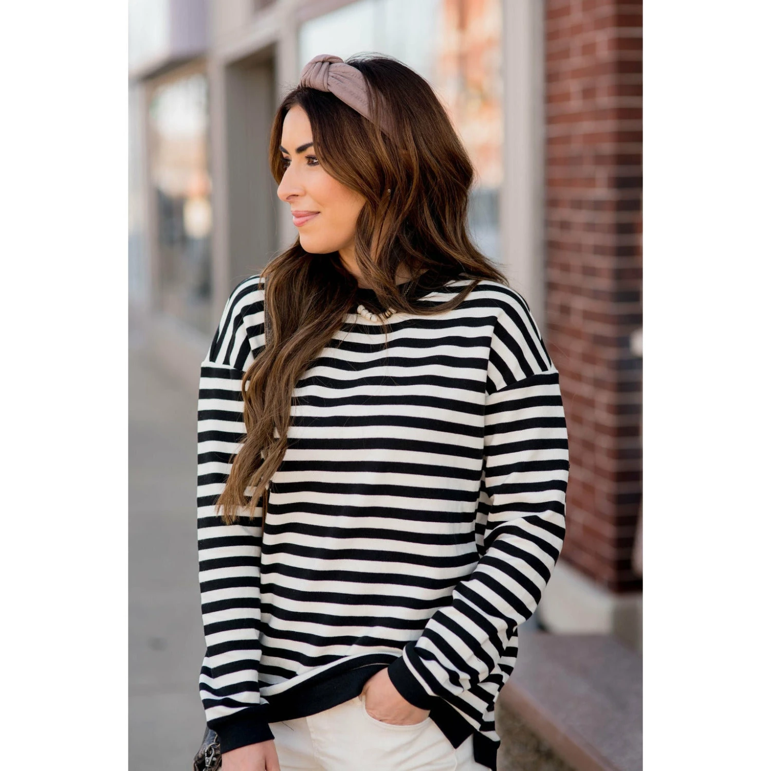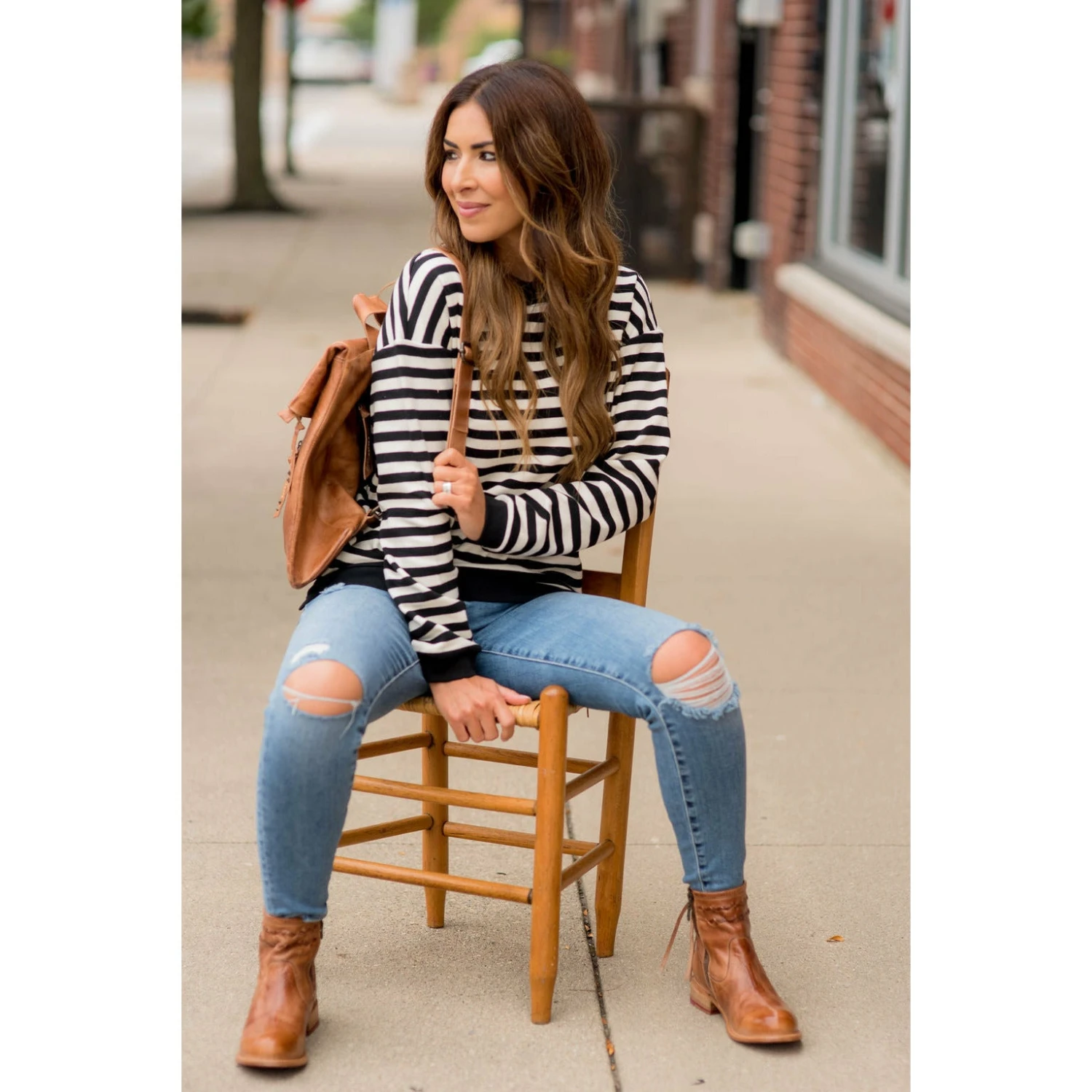 Striped sweaters never go out of fashion! This particular sweater is warm, and has light and dark stripes made to stand out. You can throw it on with a pair of jeans, or even dress it up with skirt, If you are in need of a warm sweater, this is the one for you!