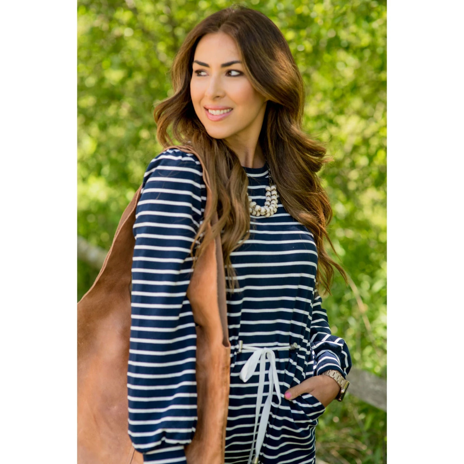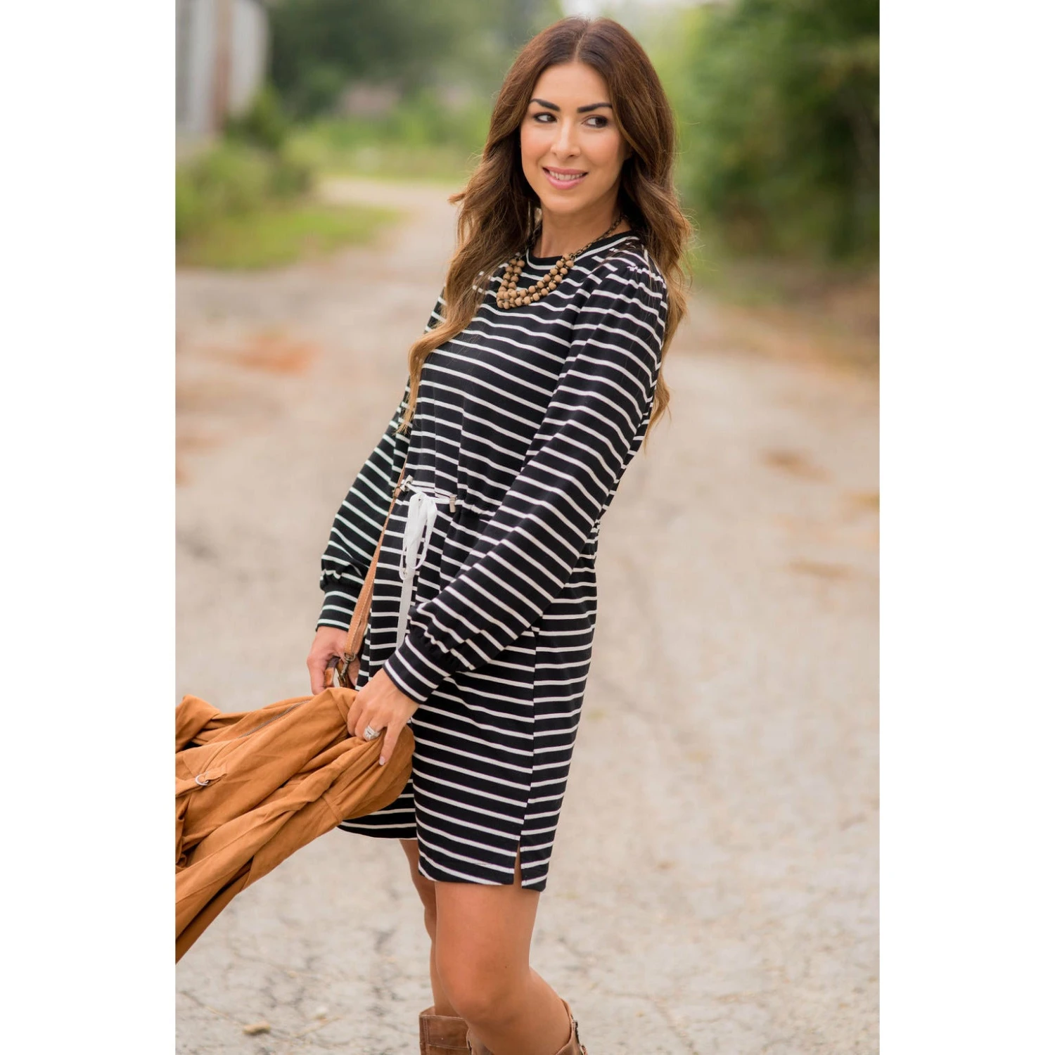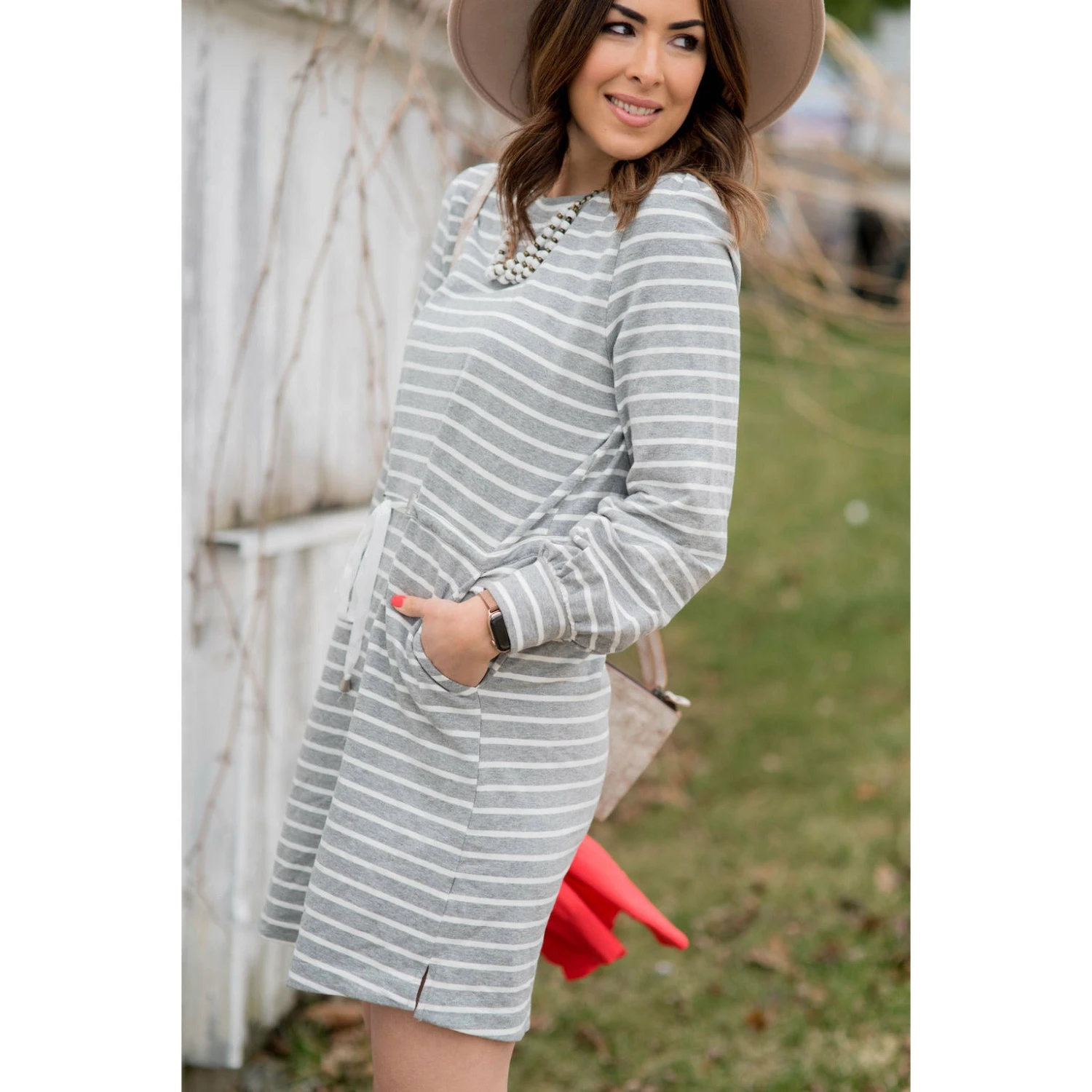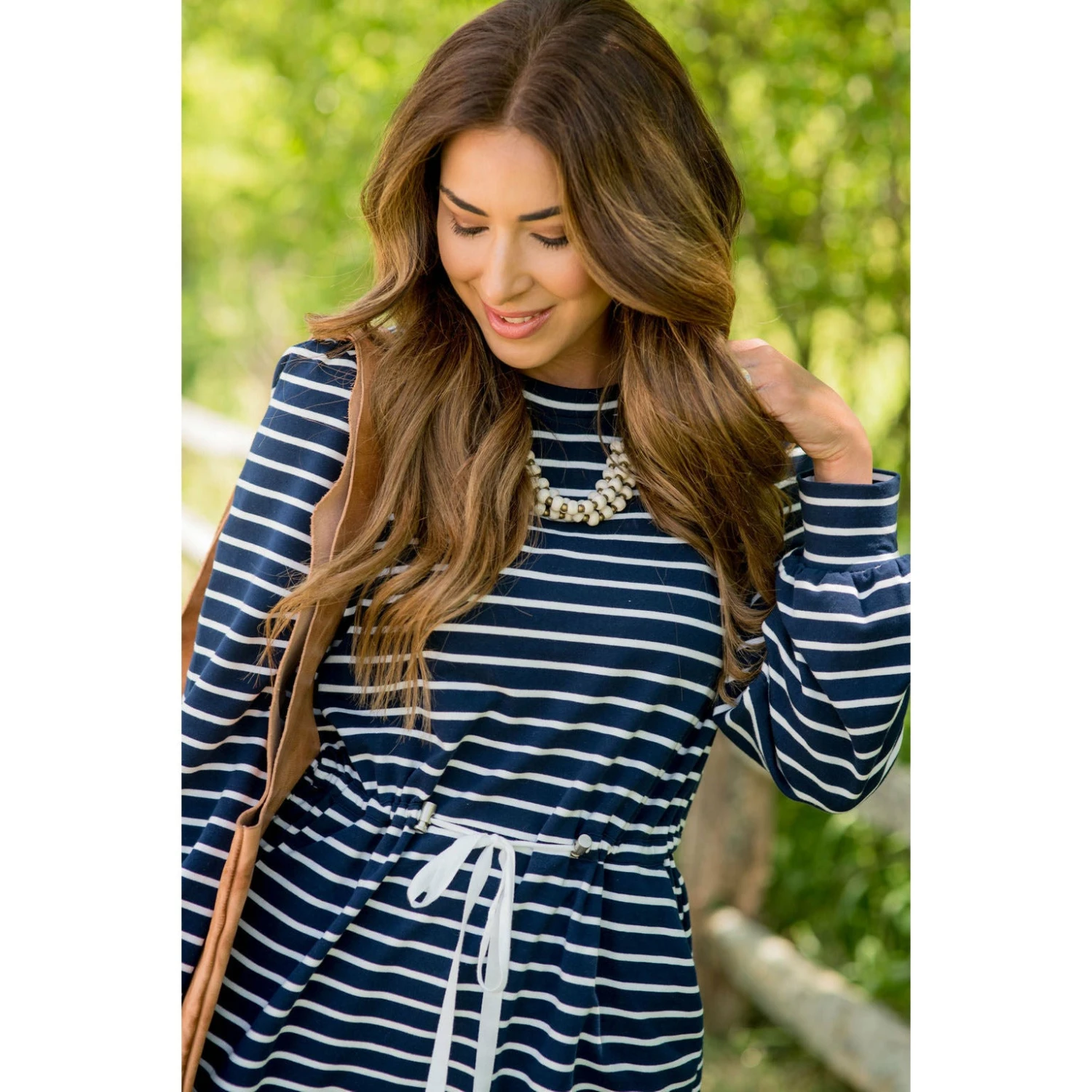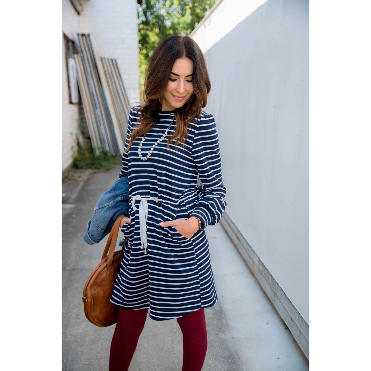 If stripes are your thing, then this sweatshirt dress is for you! Long sleeves and a cinched waist with a tie, add a pair of leggings to finish with the style you are looking for! Add a long multi necklace to finish your perfect look