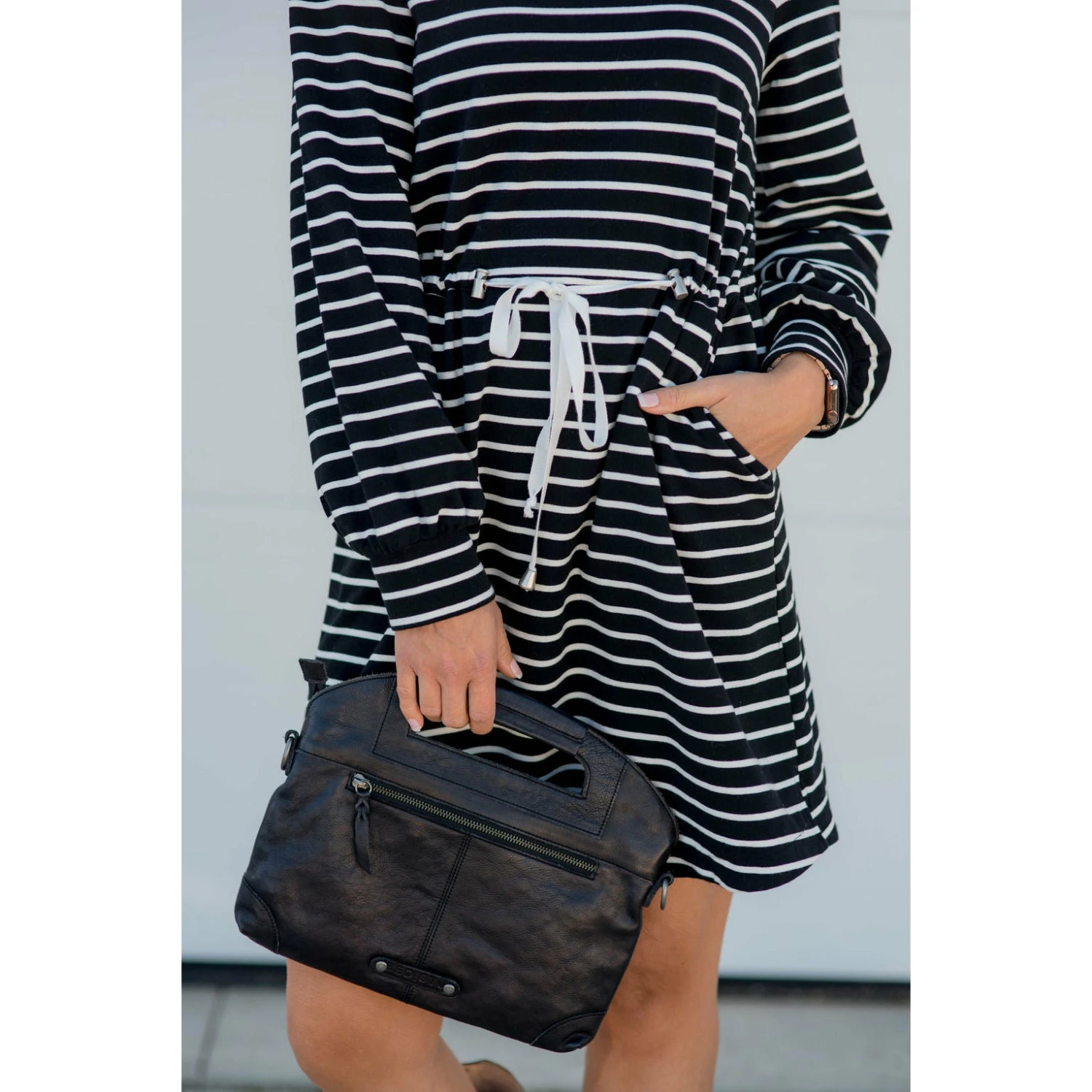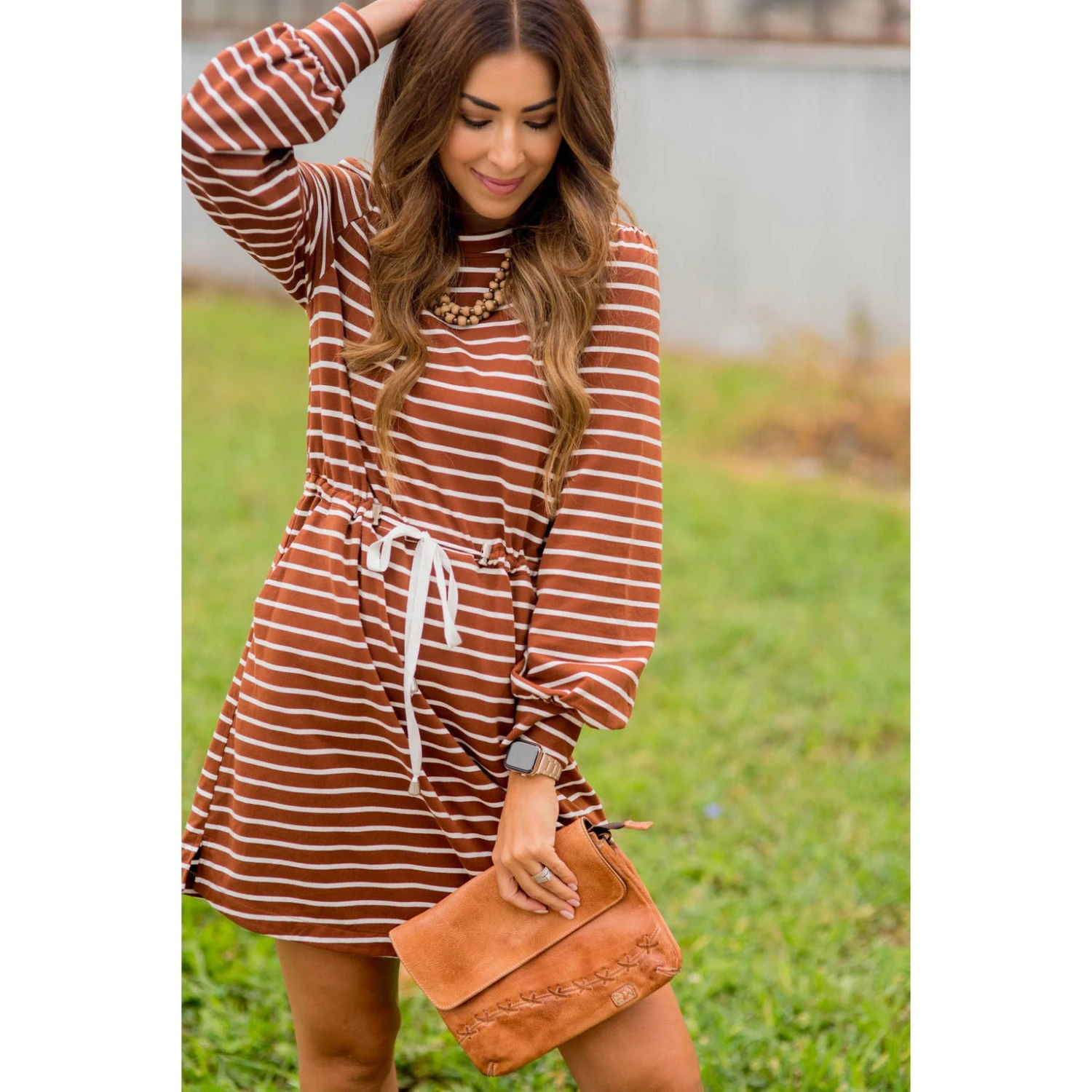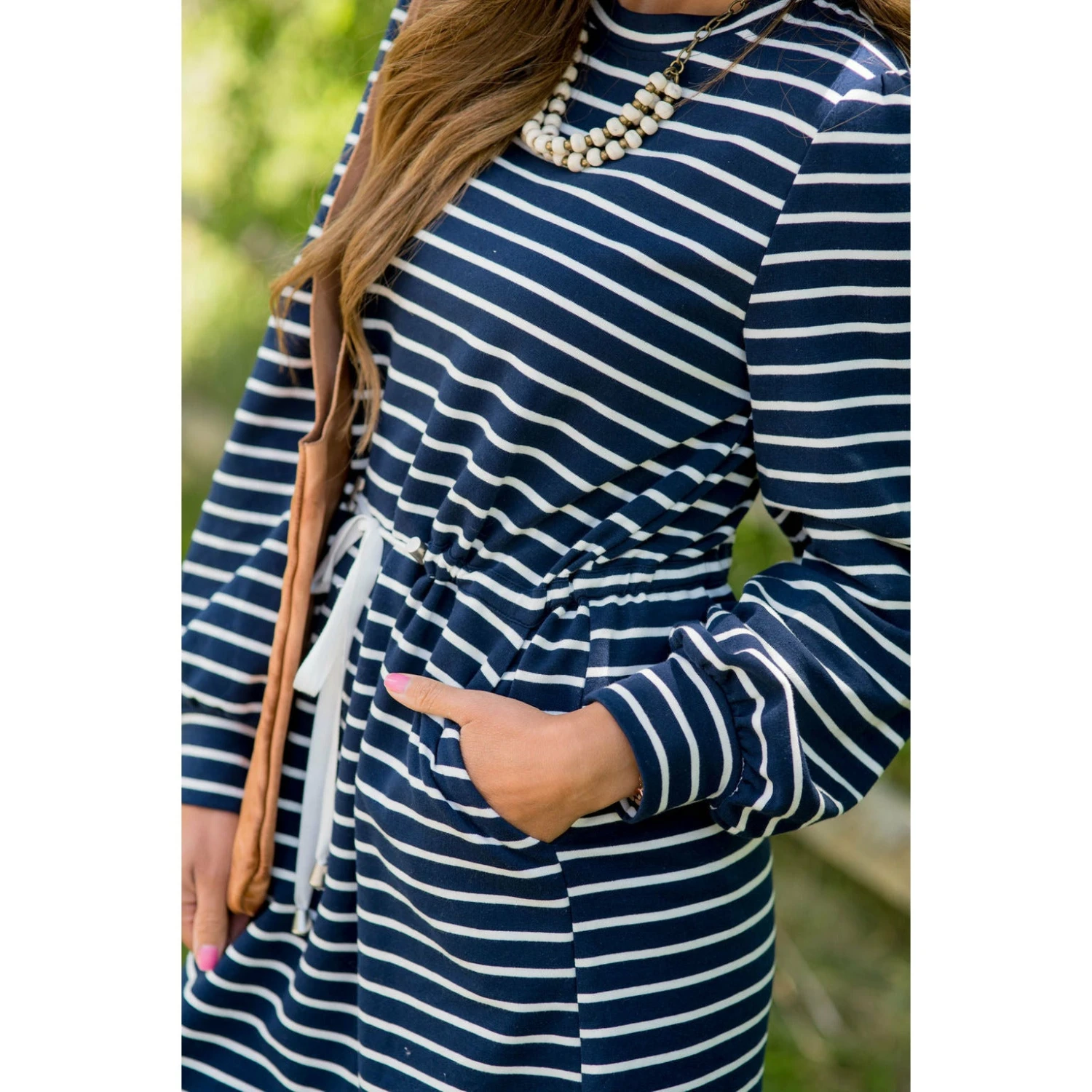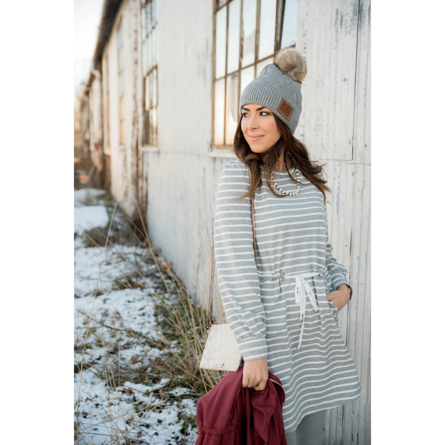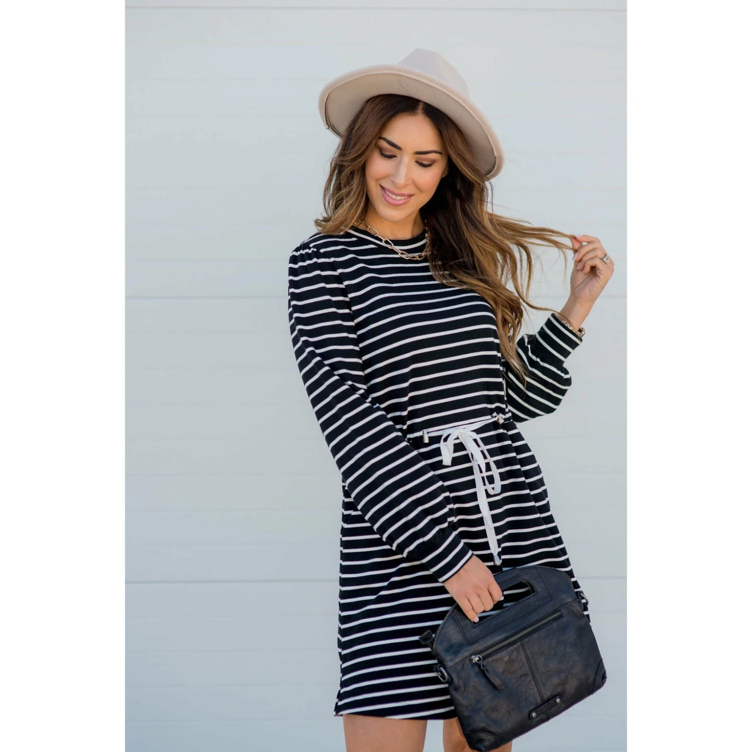 If stripes are your thing, then this sweatshirt dress is for you! Long sleeves and a cinched waist with a tie, add a pair of leggings to finish with the style you are looking for! Add a long multi necklace to finish your perfect look