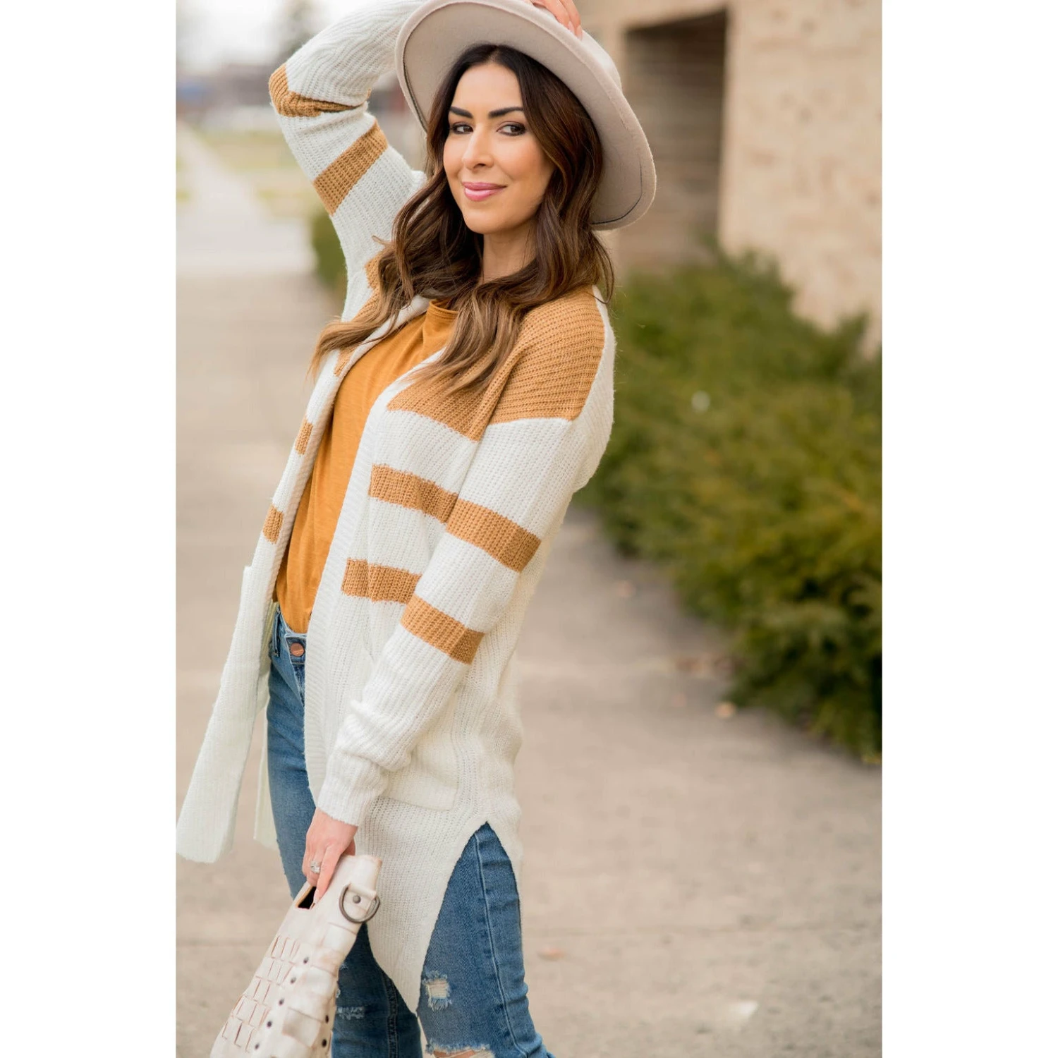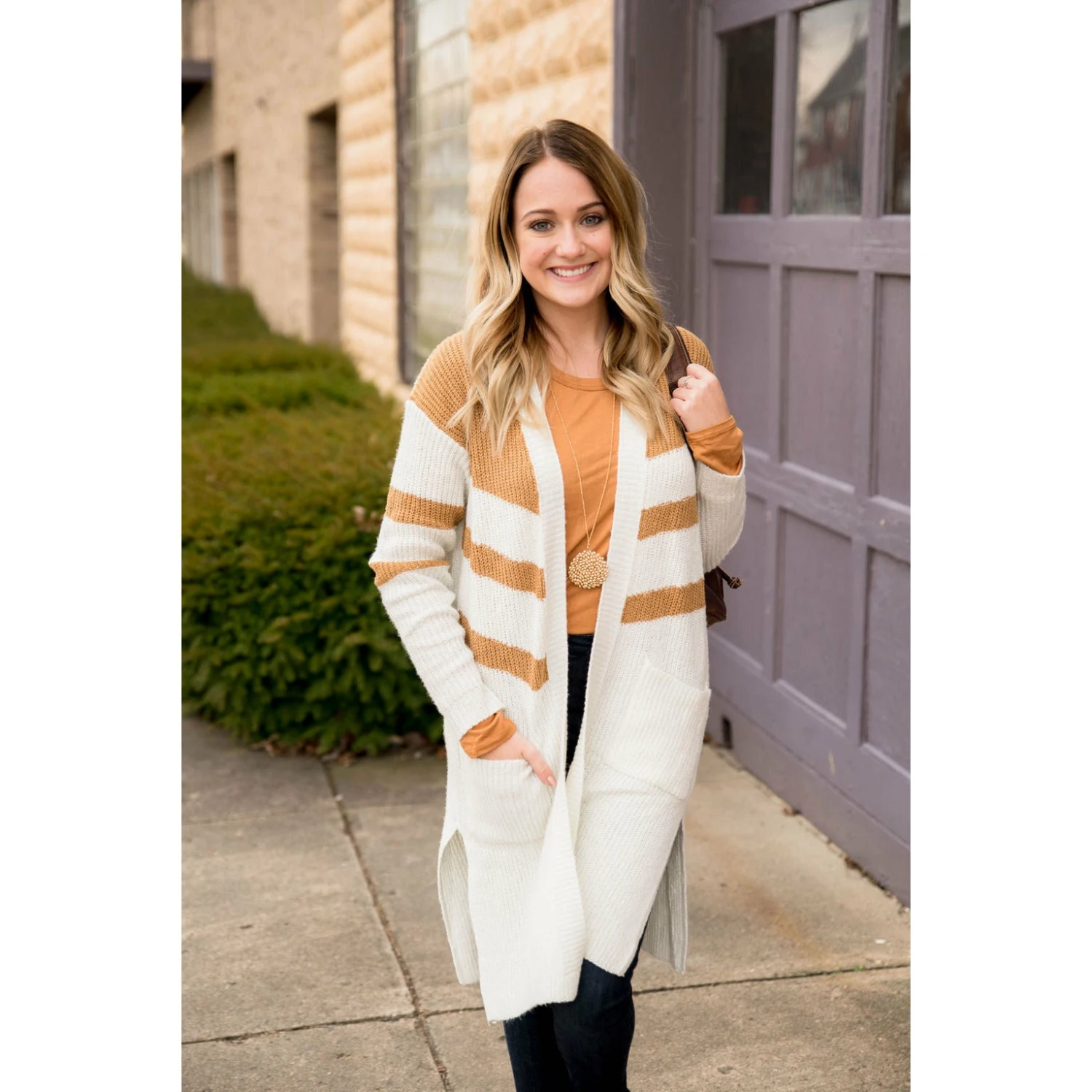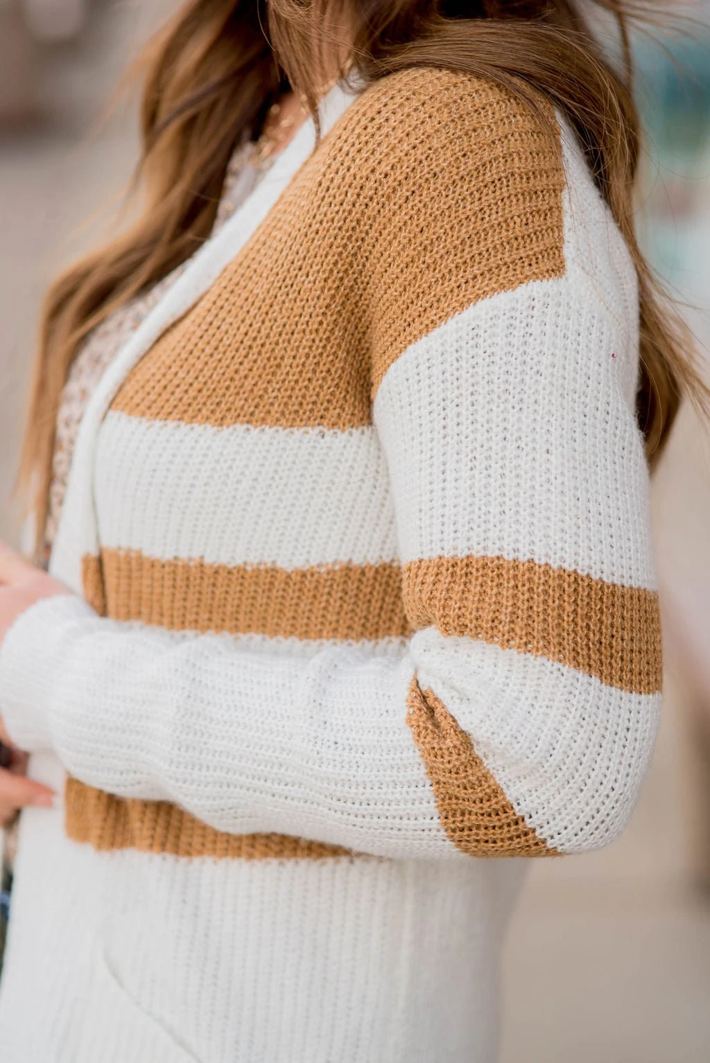 This is perfect for any cold day! Our striped accent knit tunic cardigan has pockets and is long to keep you warm and cozy!