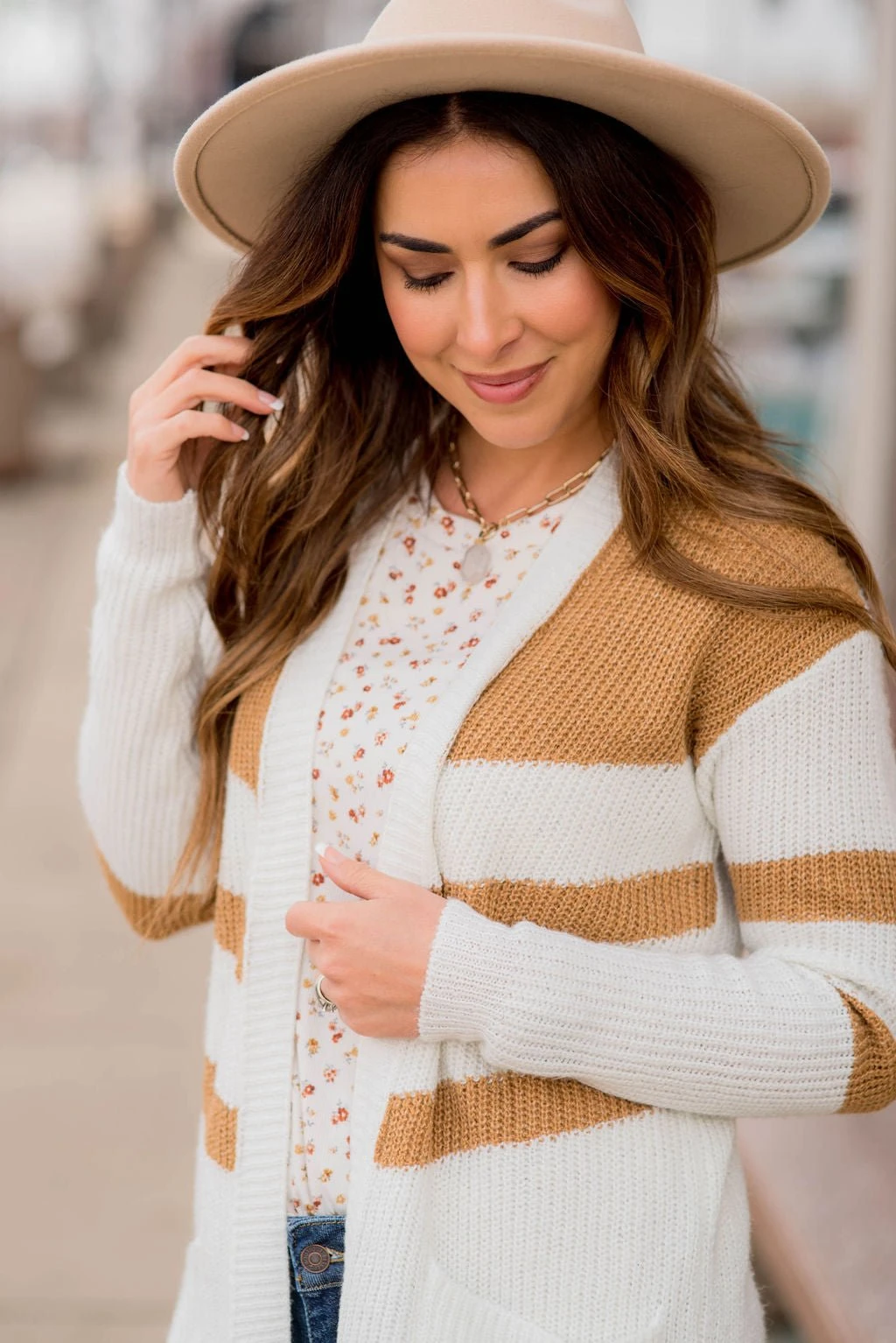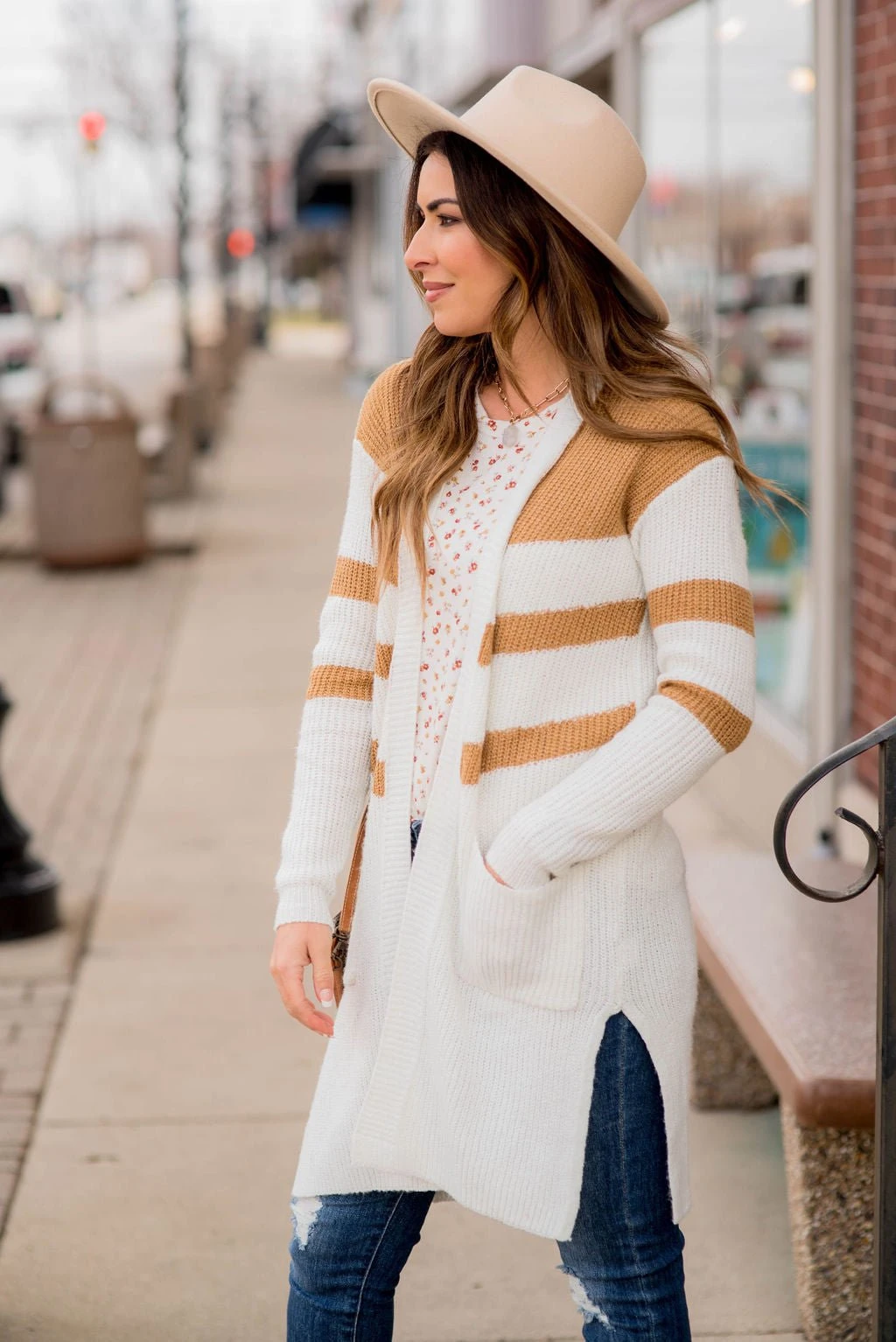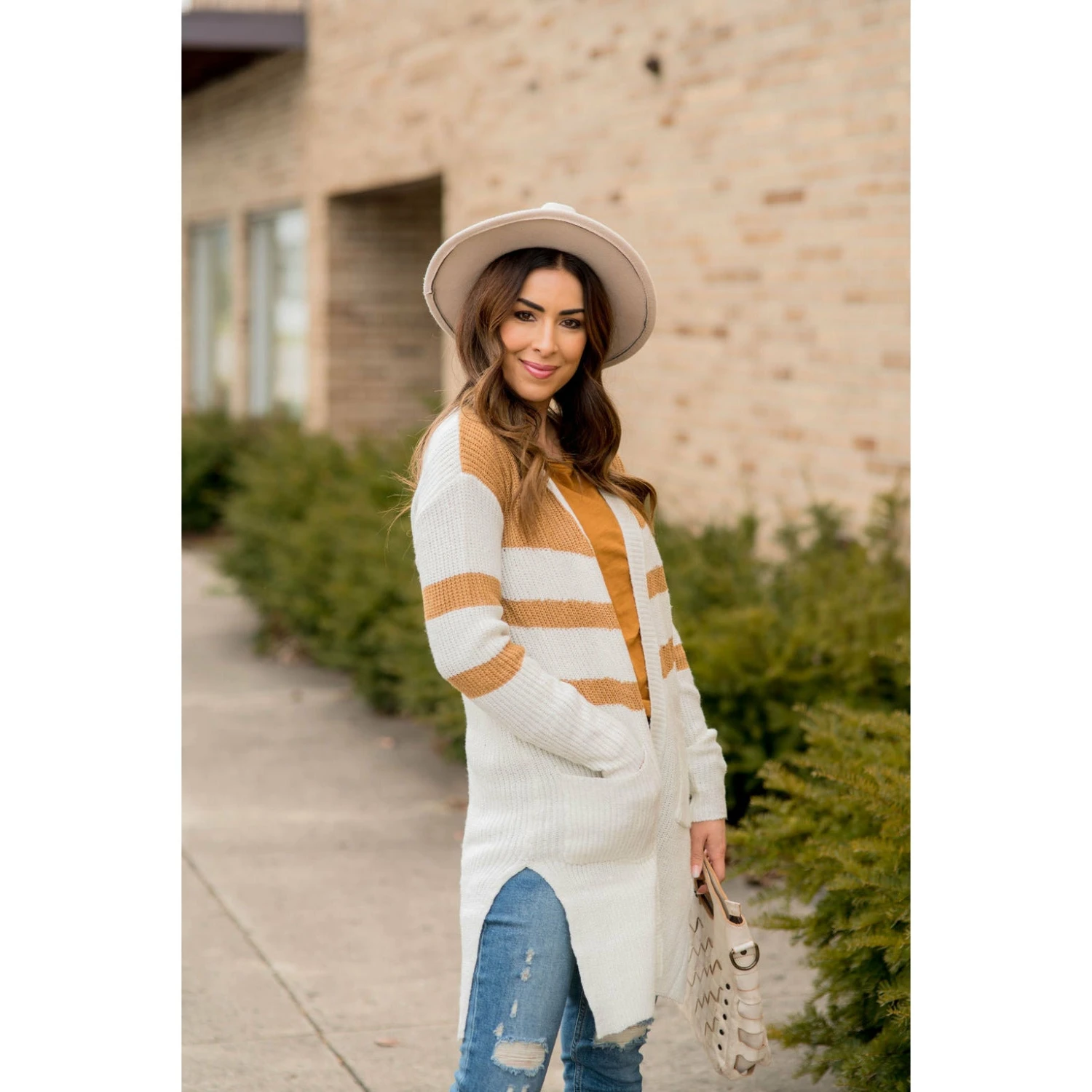This is perfect for any cold day! Our striped accent knit tunic cardigan has pockets and is long to keep you warm and cozy!