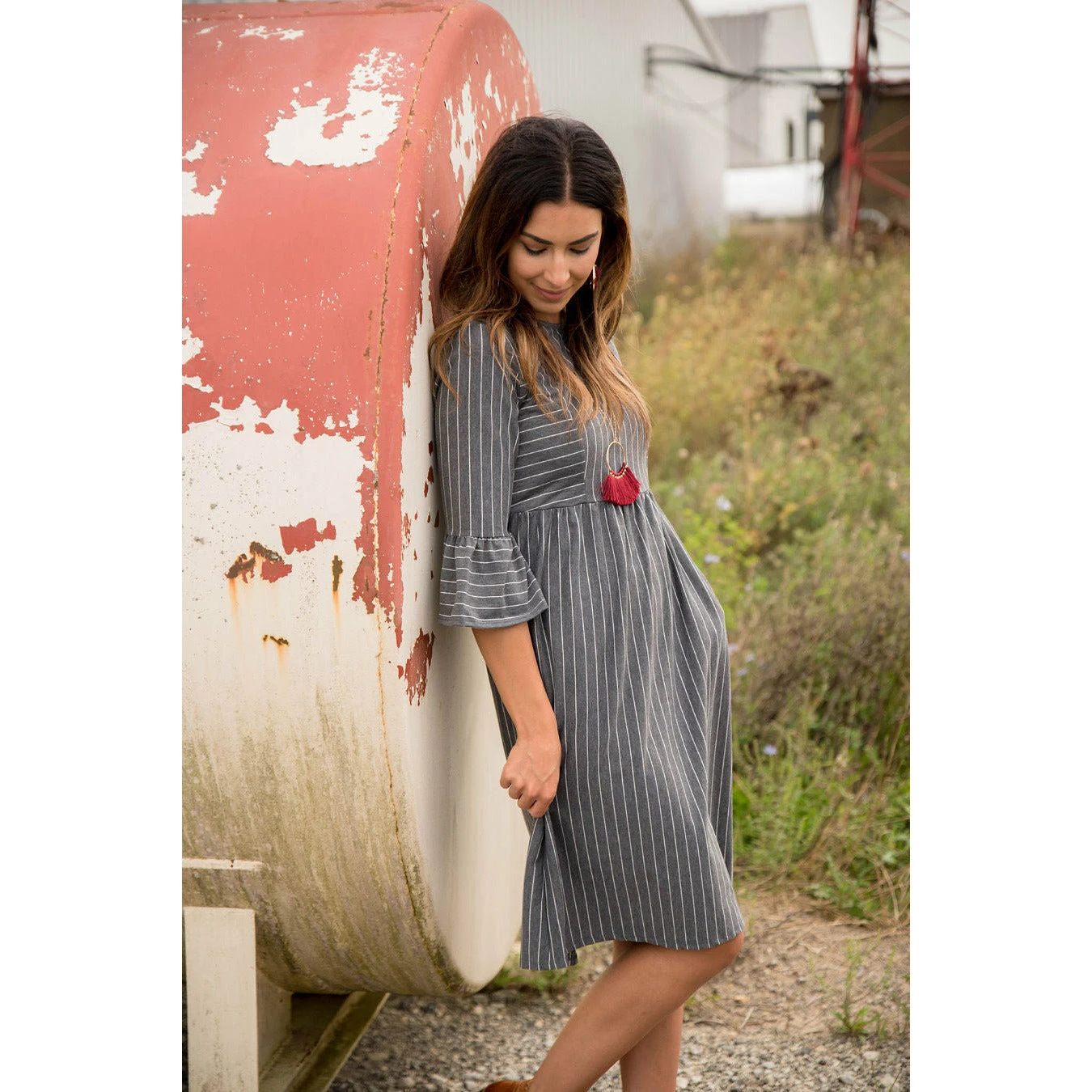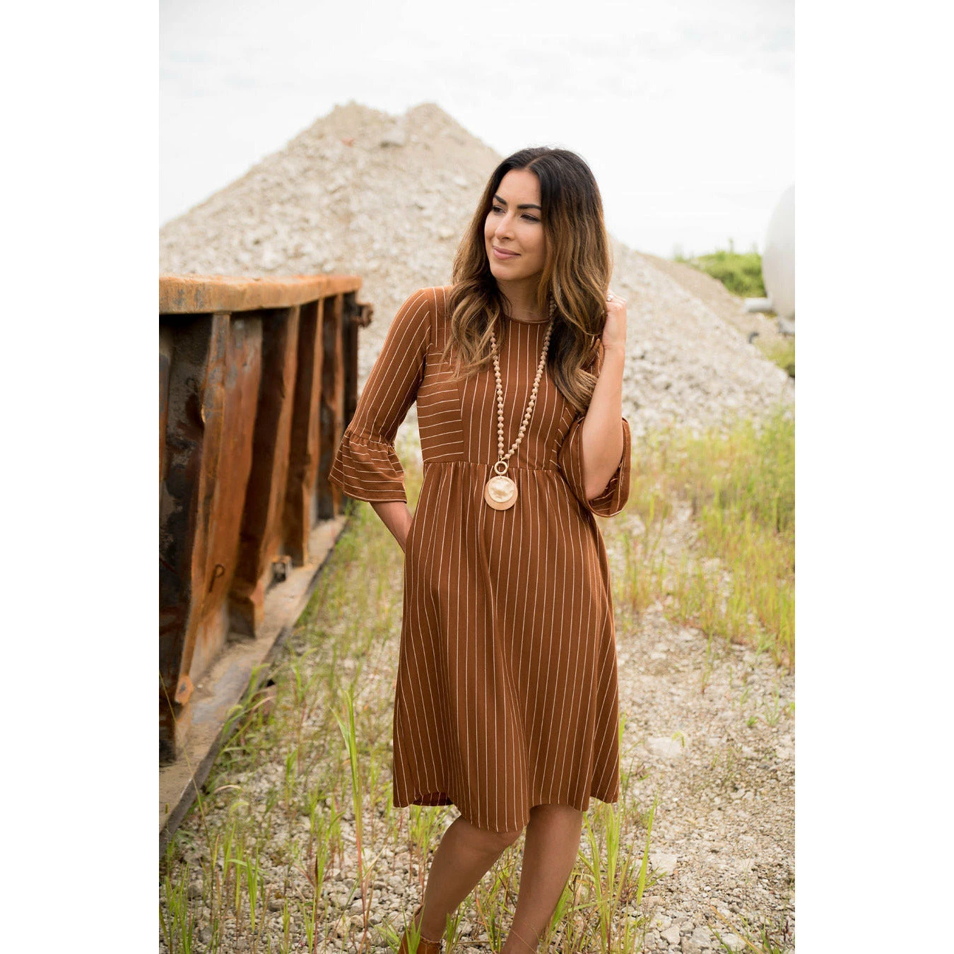 From the mixture of stripes, to the flattering cinched waist, to the unique bell sleeves, we are OBSESSED with this dress! Just add a statement necklace and you’re ready to turn heads at any event or occasion!Â