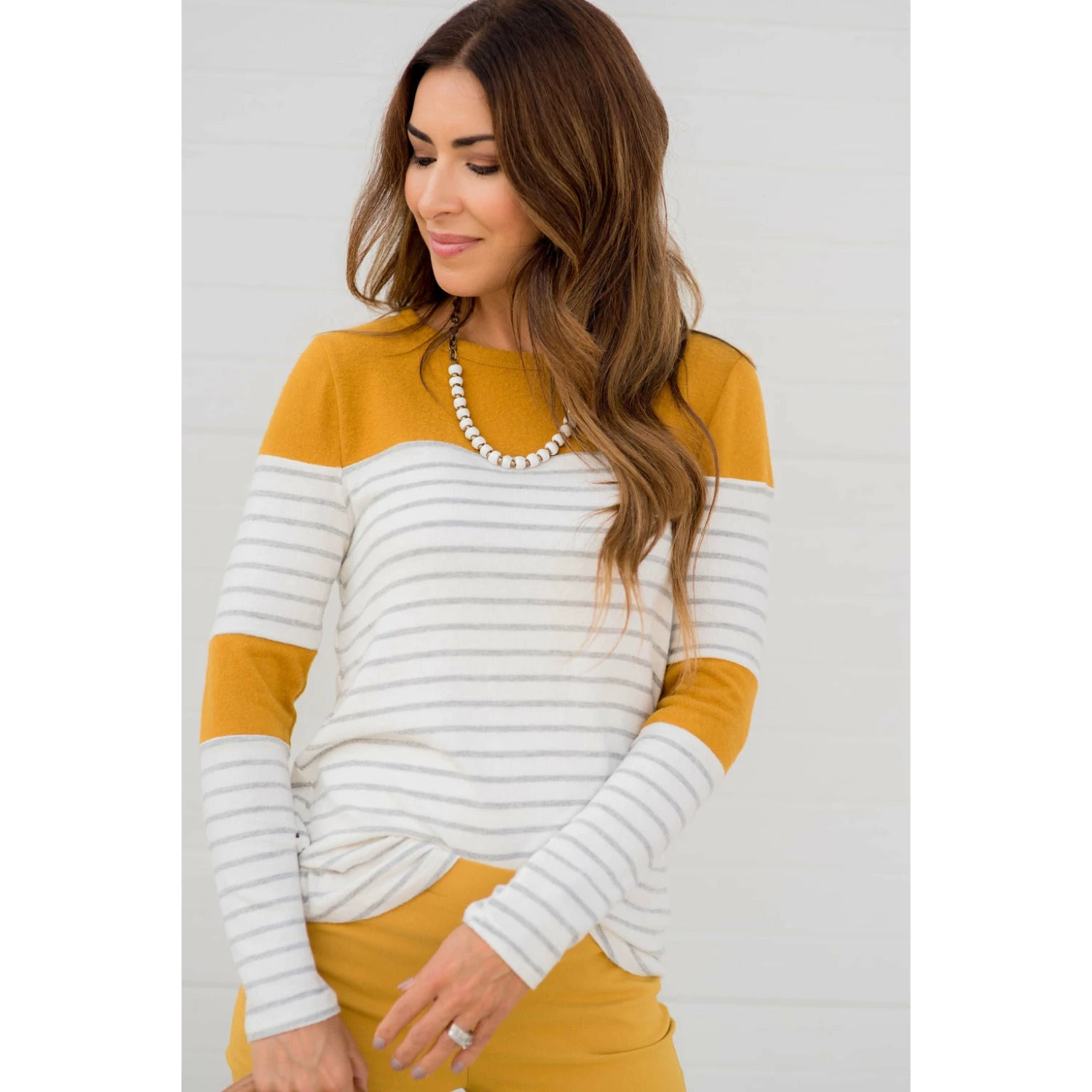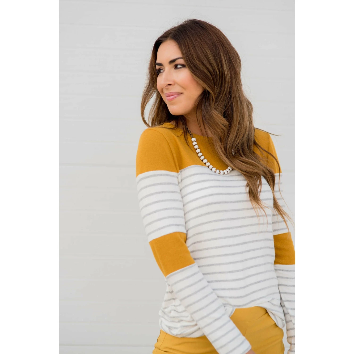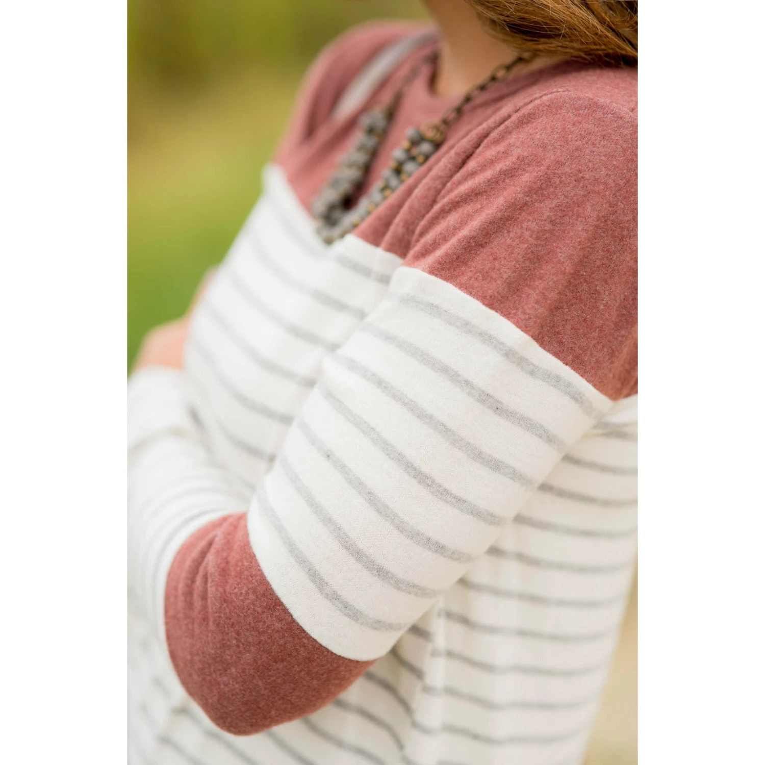 Looking for one of those tees that you will want to wear over again and again? This is an adorable go to! Stripes and color blocked sections near the elbows and shoulders. It looks great with a vest, or if you want something a bit warmer, go for a cardigan!
