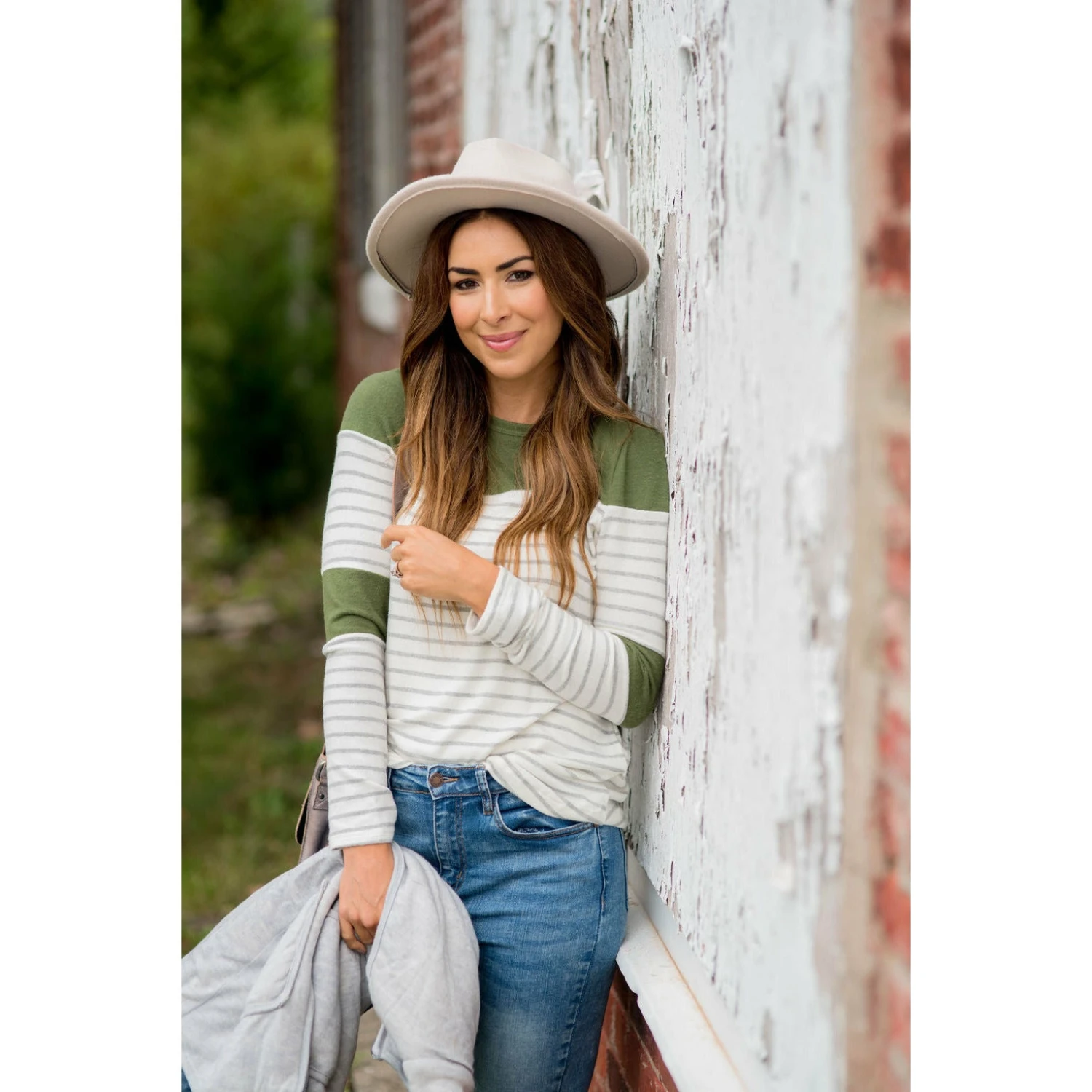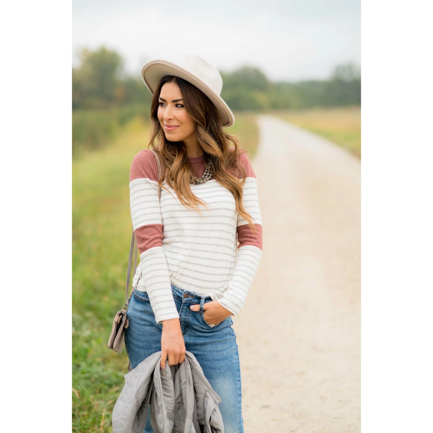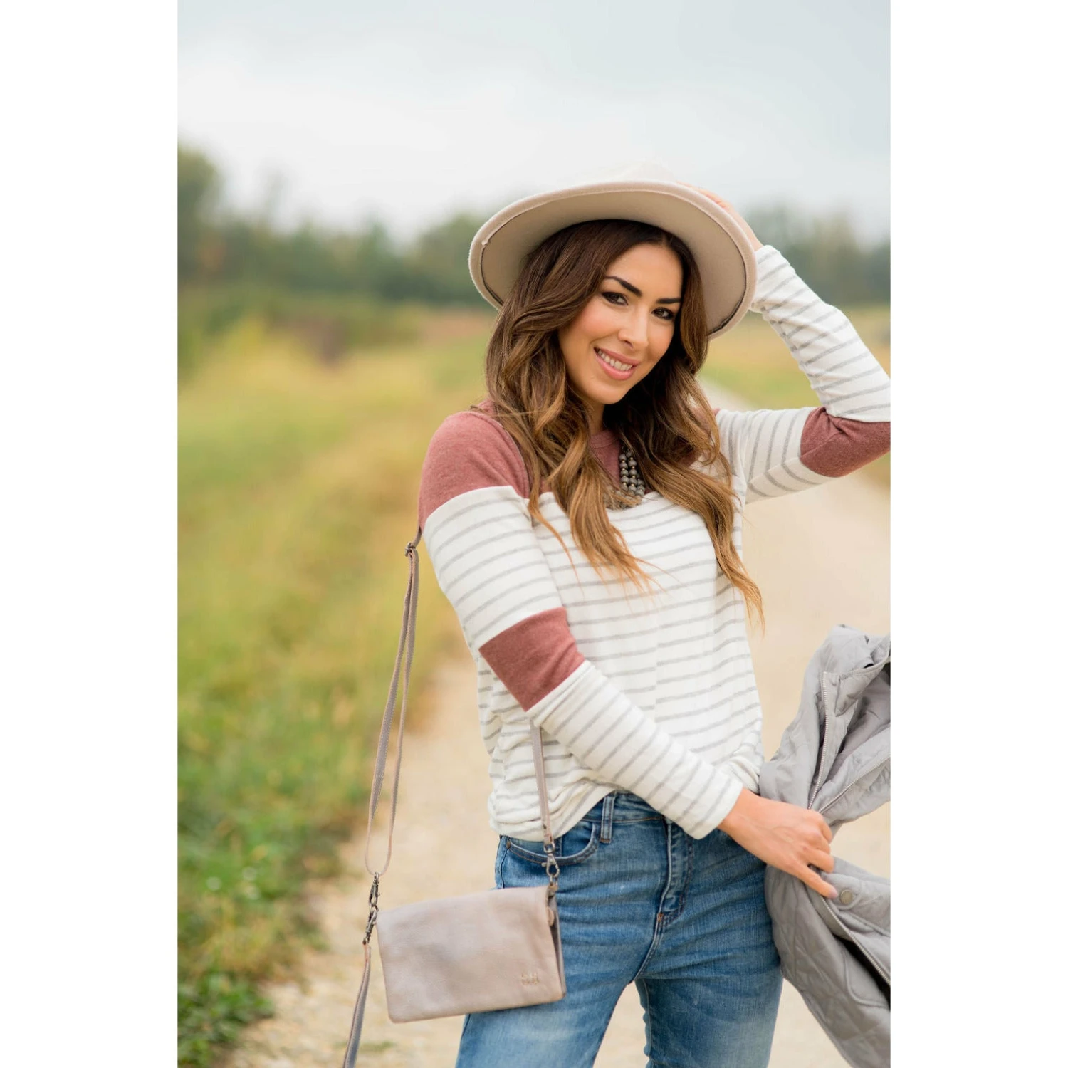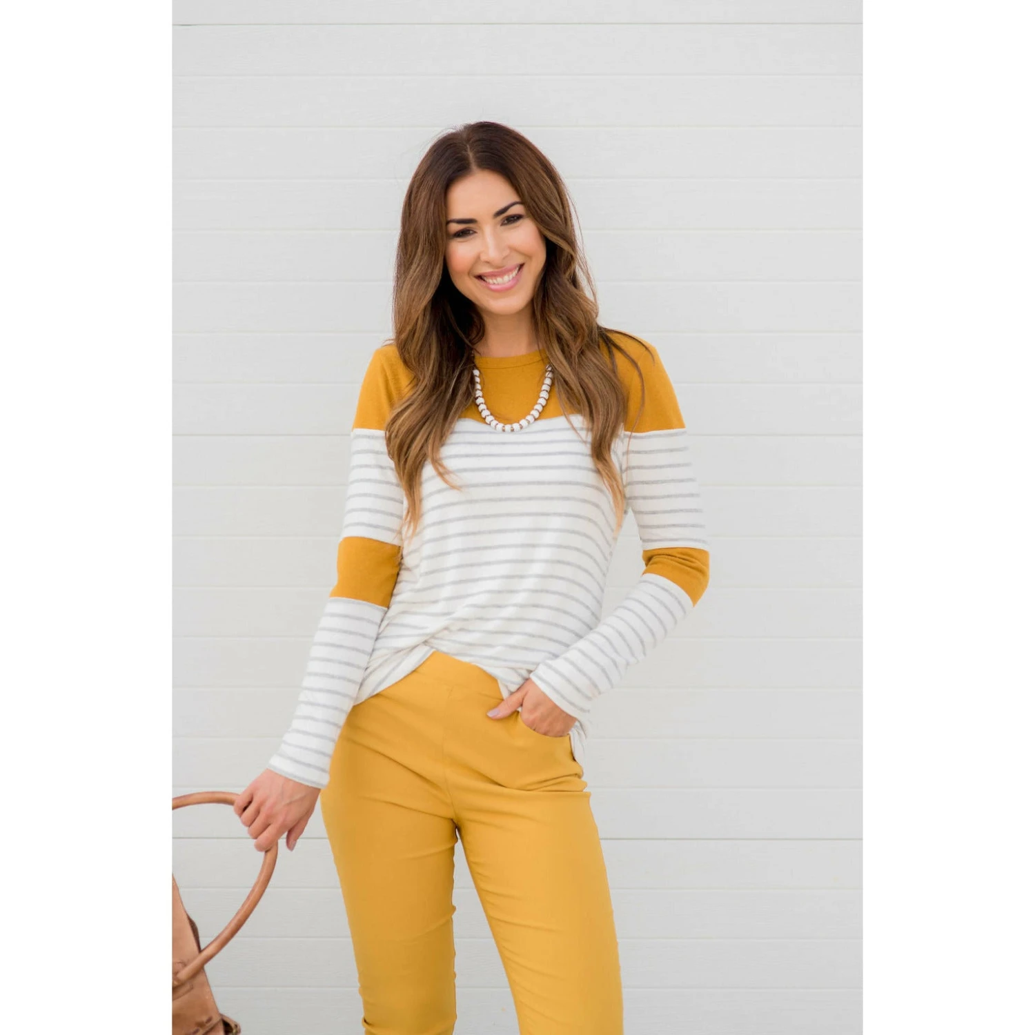 Looking for one of those tees that you will want to wear over again and again? This is an adorable go to! Stripes and color blocked sections near the elbows and shoulders. It looks great with a vest, or if you want something a bit warmer, go for a cardigan!