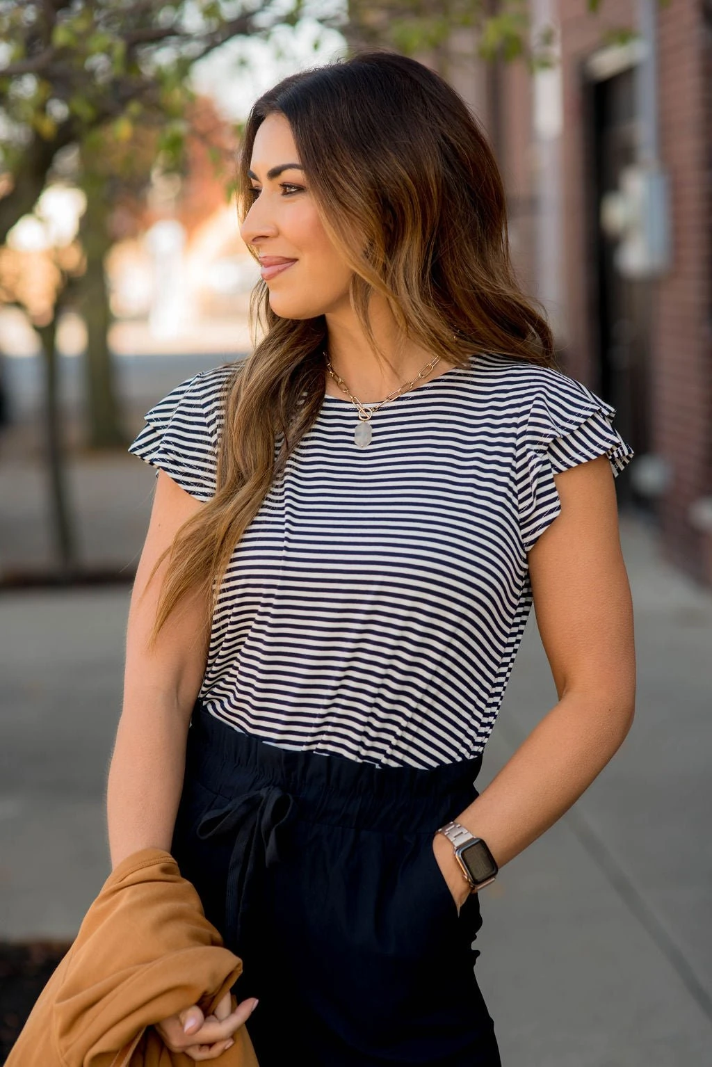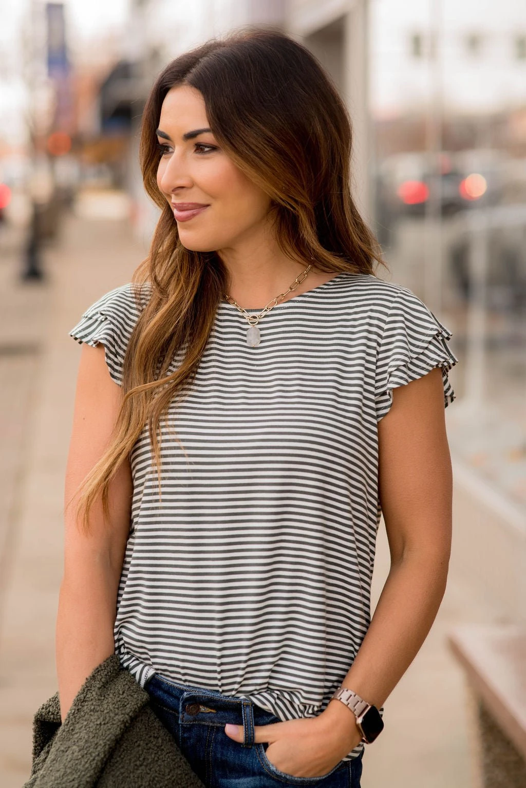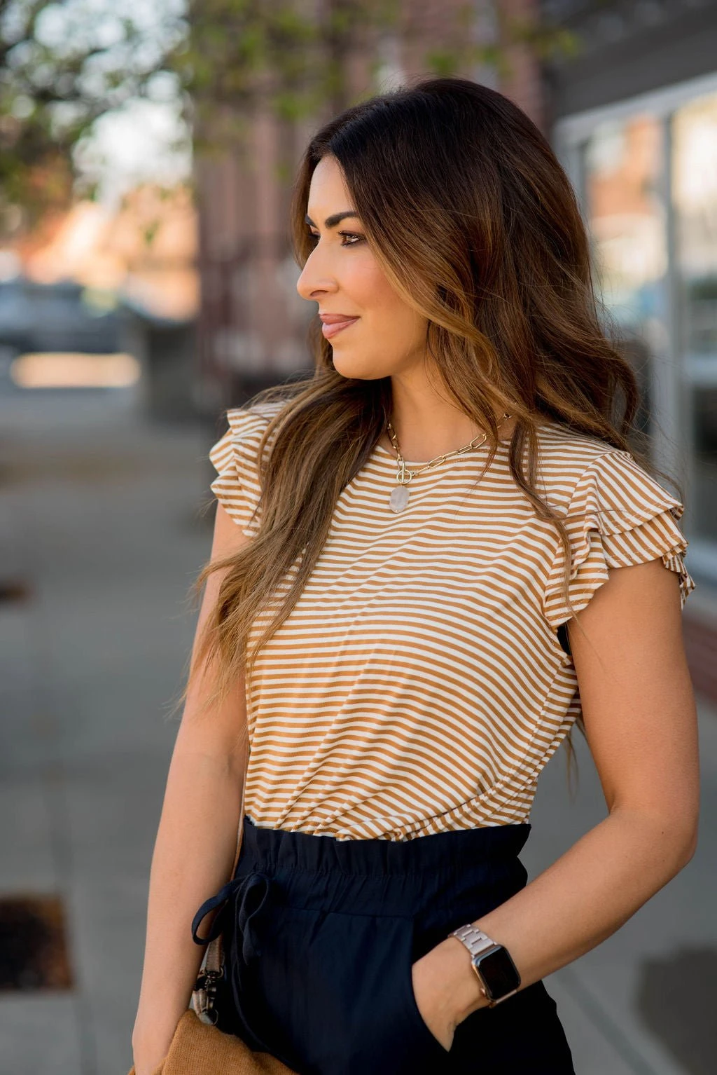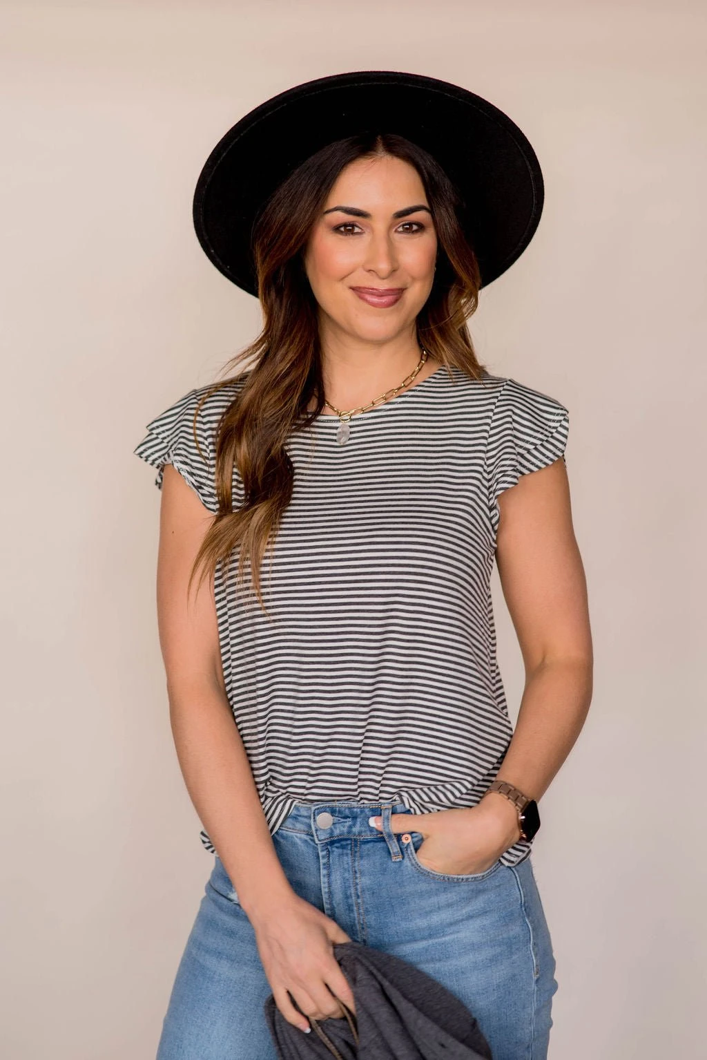 A simple soft and lightweight tee elevated with fun stripes and double flutter sleeves! We love that this can be worn in the summer with short or a high-waisted skirt in the warmer months or with denim, leggings, joggers, or our Betsey’s Jeggings in the cooler months! This can also be dressed up or down for wherever the day takes you!
