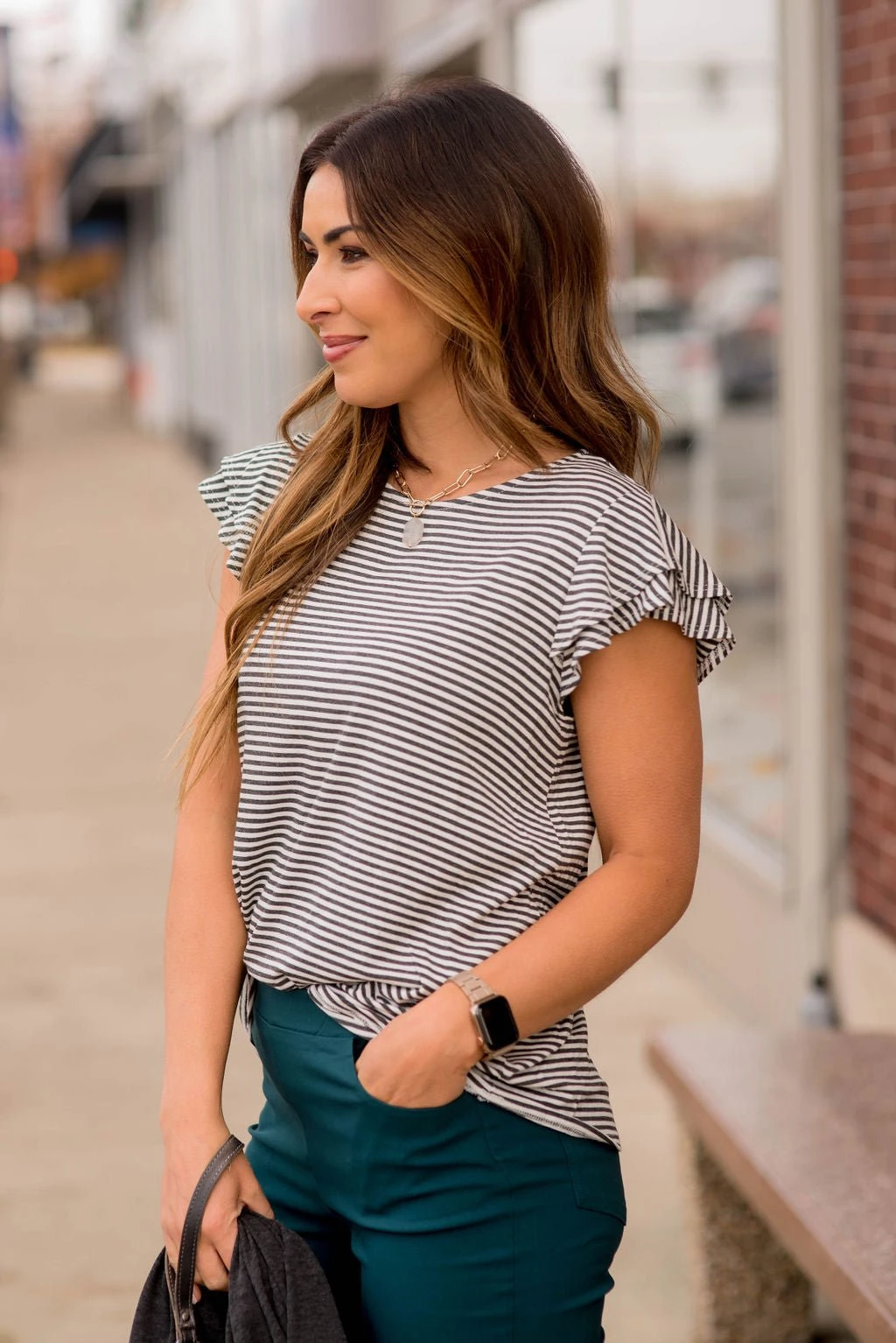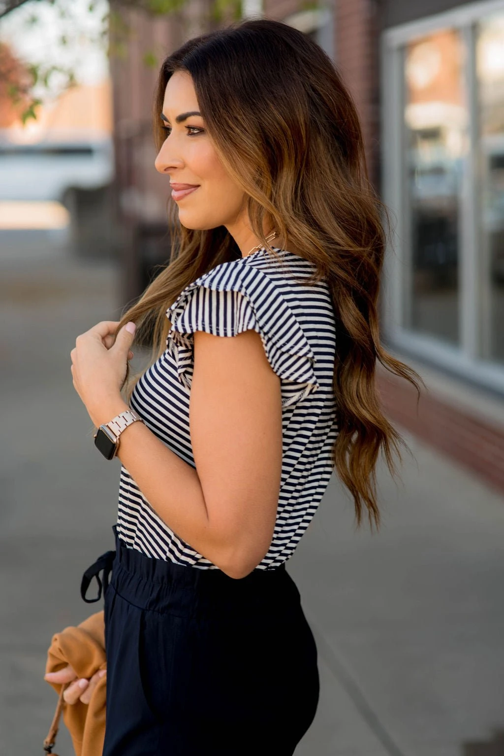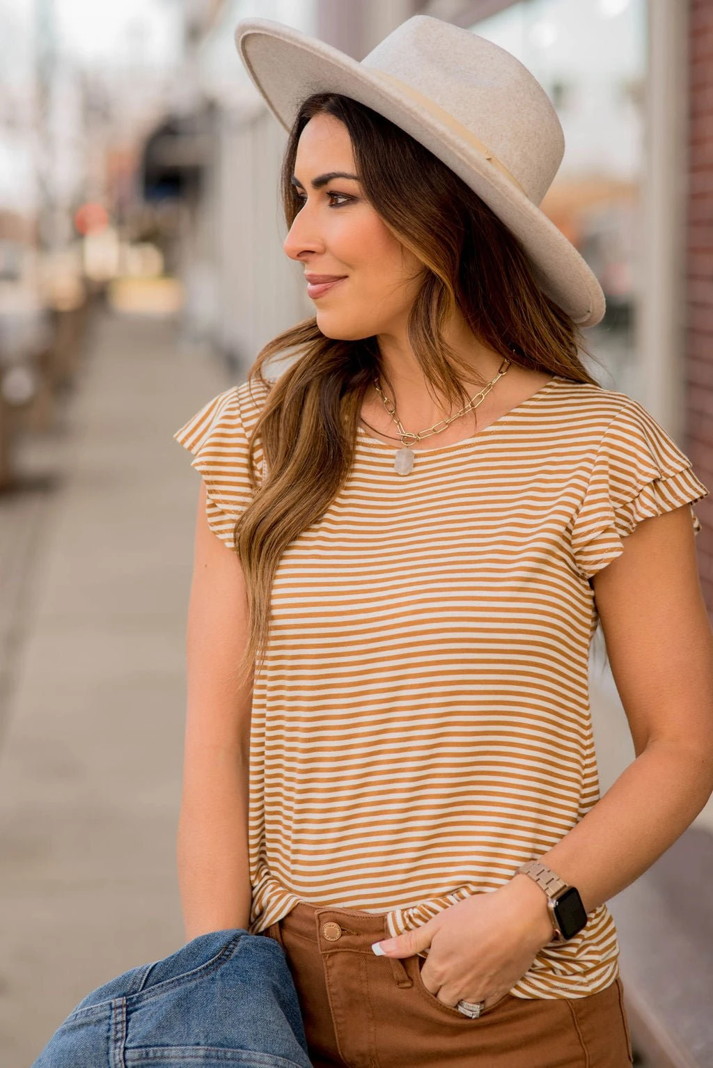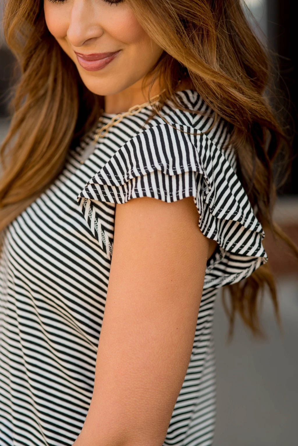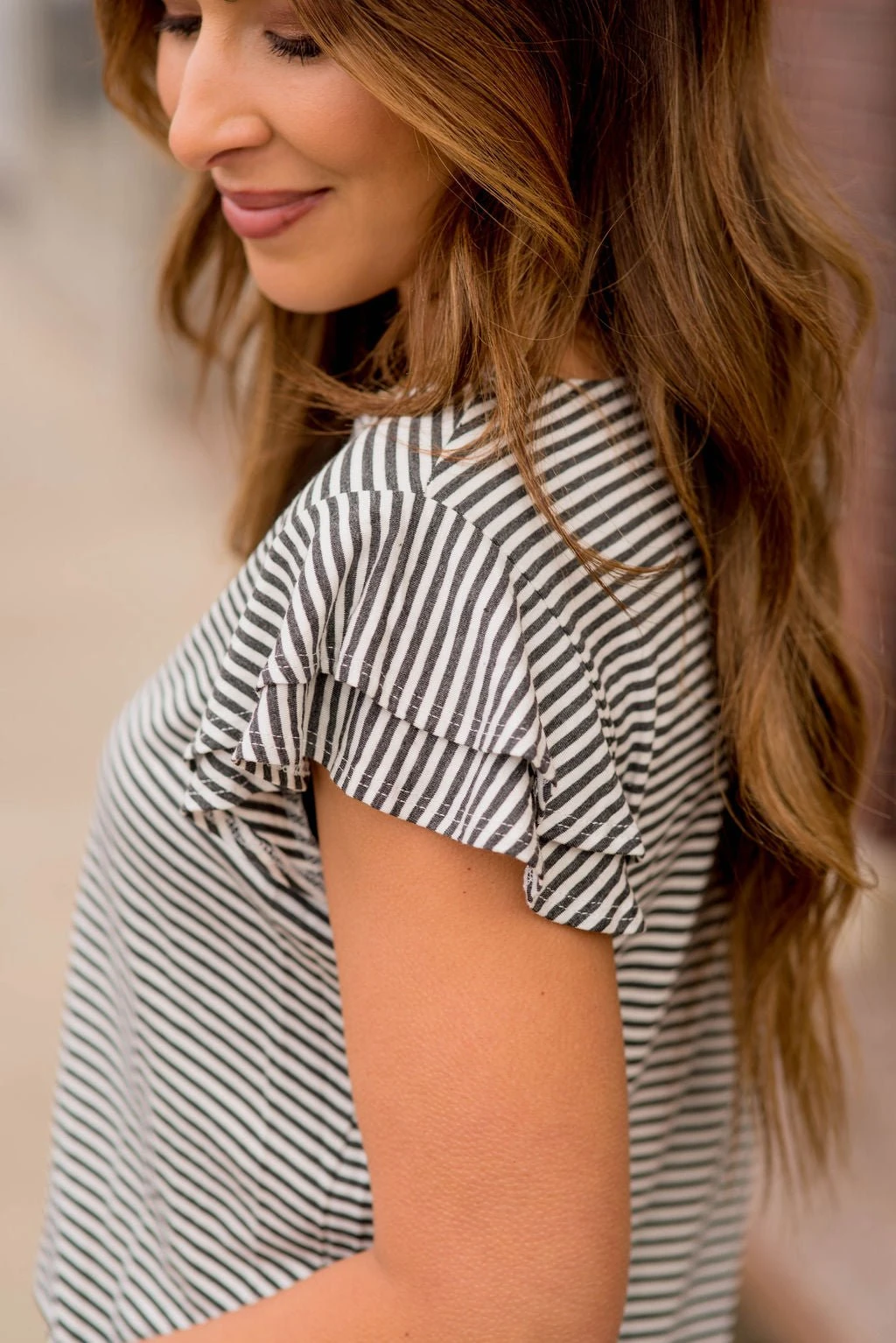 A simple soft and lightweight tee elevated with fun stripes and double flutter sleeves! We love that this can be worn in the summer with short or a high-waisted skirt in the warmer months or with denim, leggings, joggers, or our Betsey’s Jeggings in the cooler months! This can also be dressed up or down for wherever the day takes you!