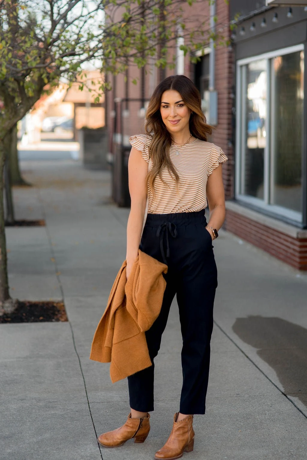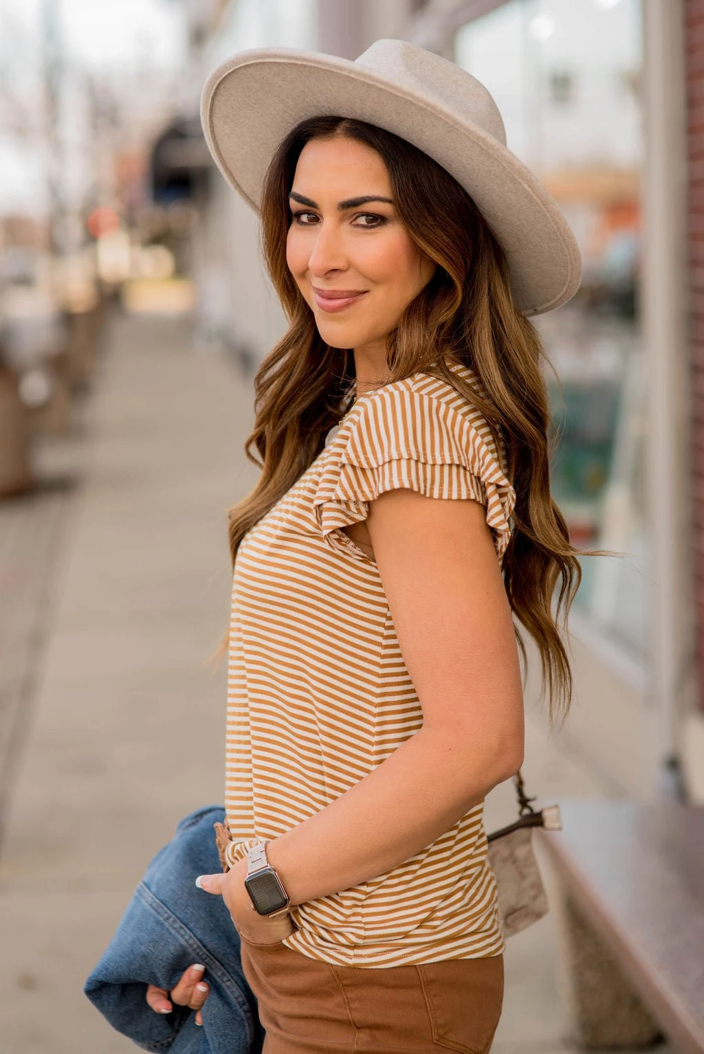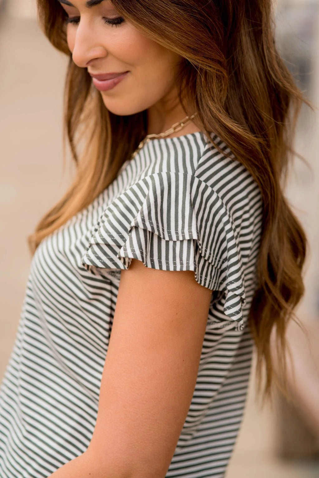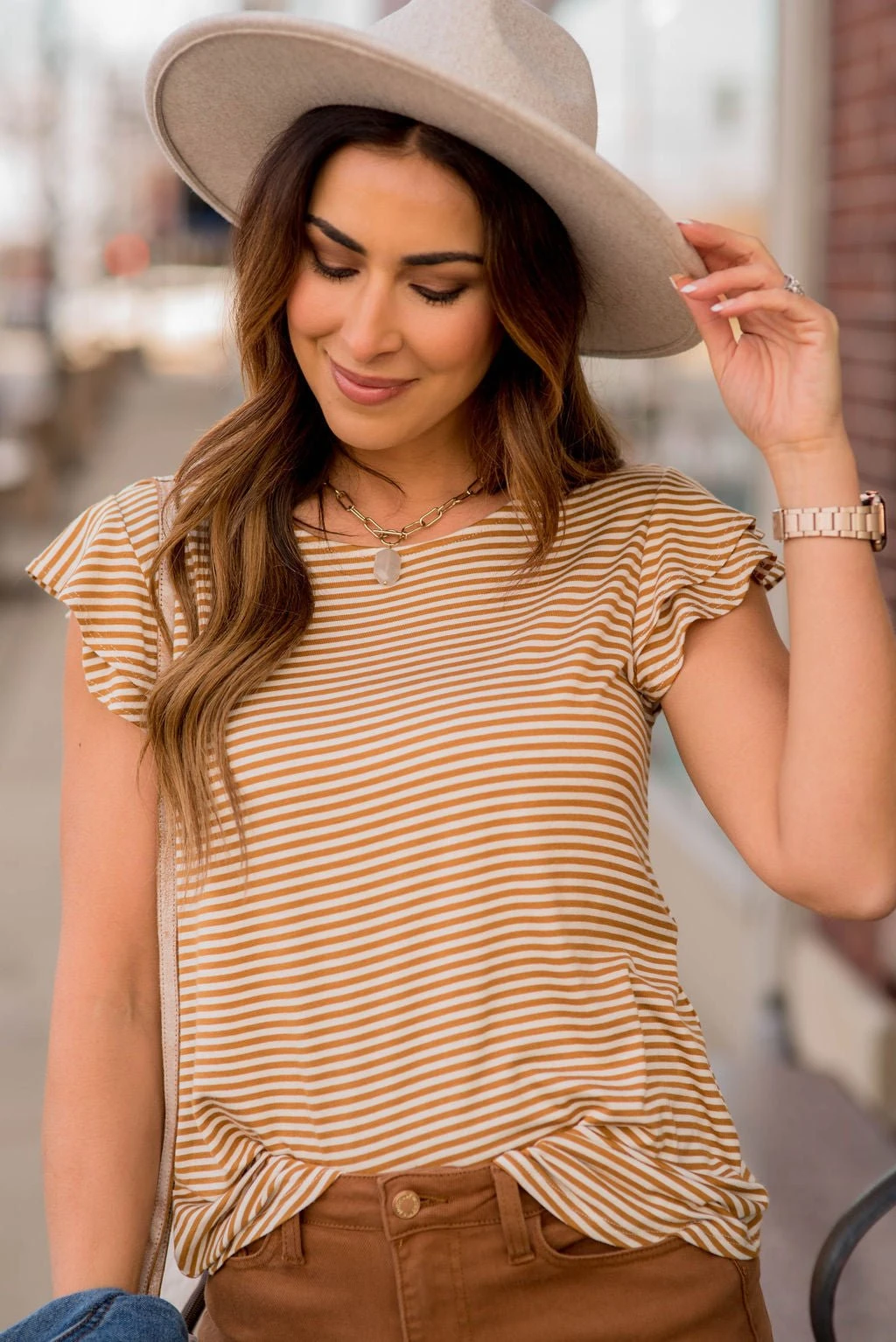 A simple soft and lightweight tee elevated with fun stripes and double flutter sleeves! We love that this can be worn in the summer with short or a high-waisted skirt in the warmer months or with denim, leggings, joggers, or our Betsey’s Jeggings in the cooler months! This can also be dressed up or down for wherever the day takes you!