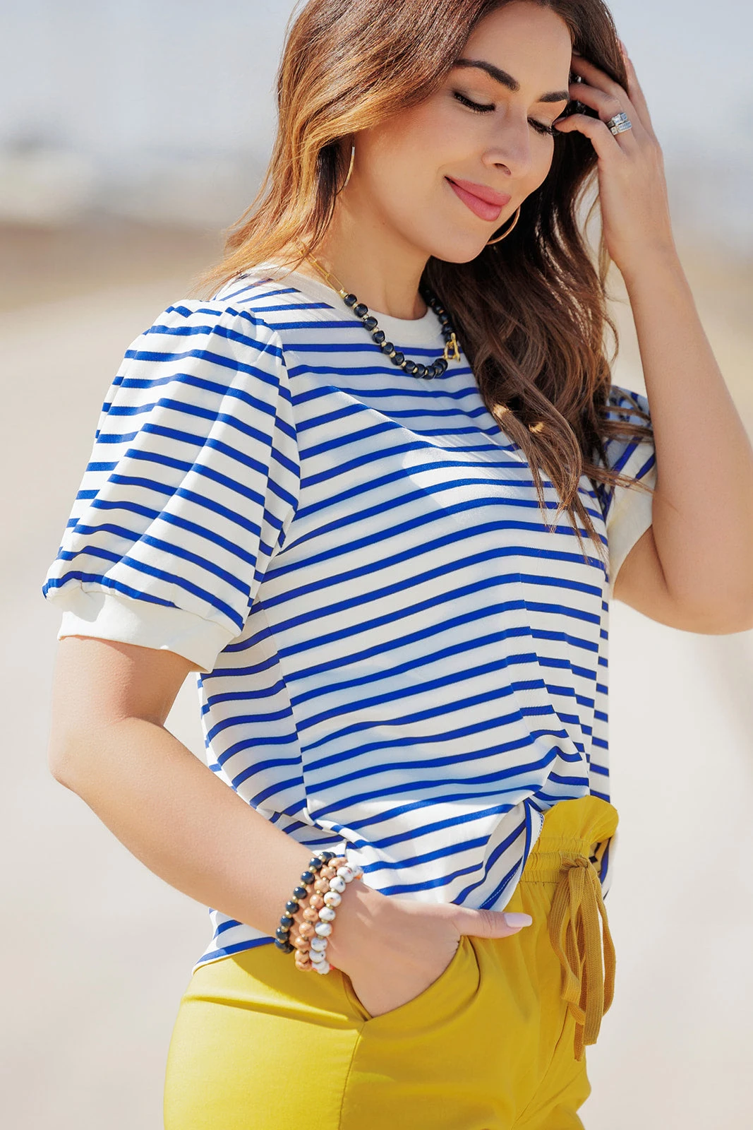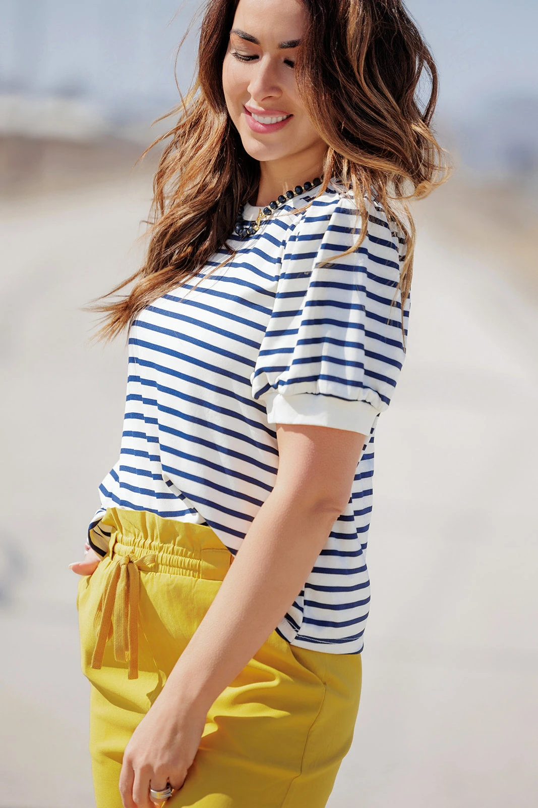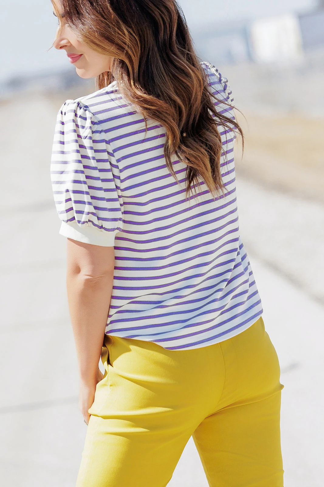 How cute is this tee?! We’re loving the puffed sleeves and the classic stripes! Pair with a bold-colored Betsey’s Jegging and a statement necklace for the office or the classroom, or with your favorite denim for a cute on-the-go look! Chilly? Add a cardigan, blazer, or jacket!Â