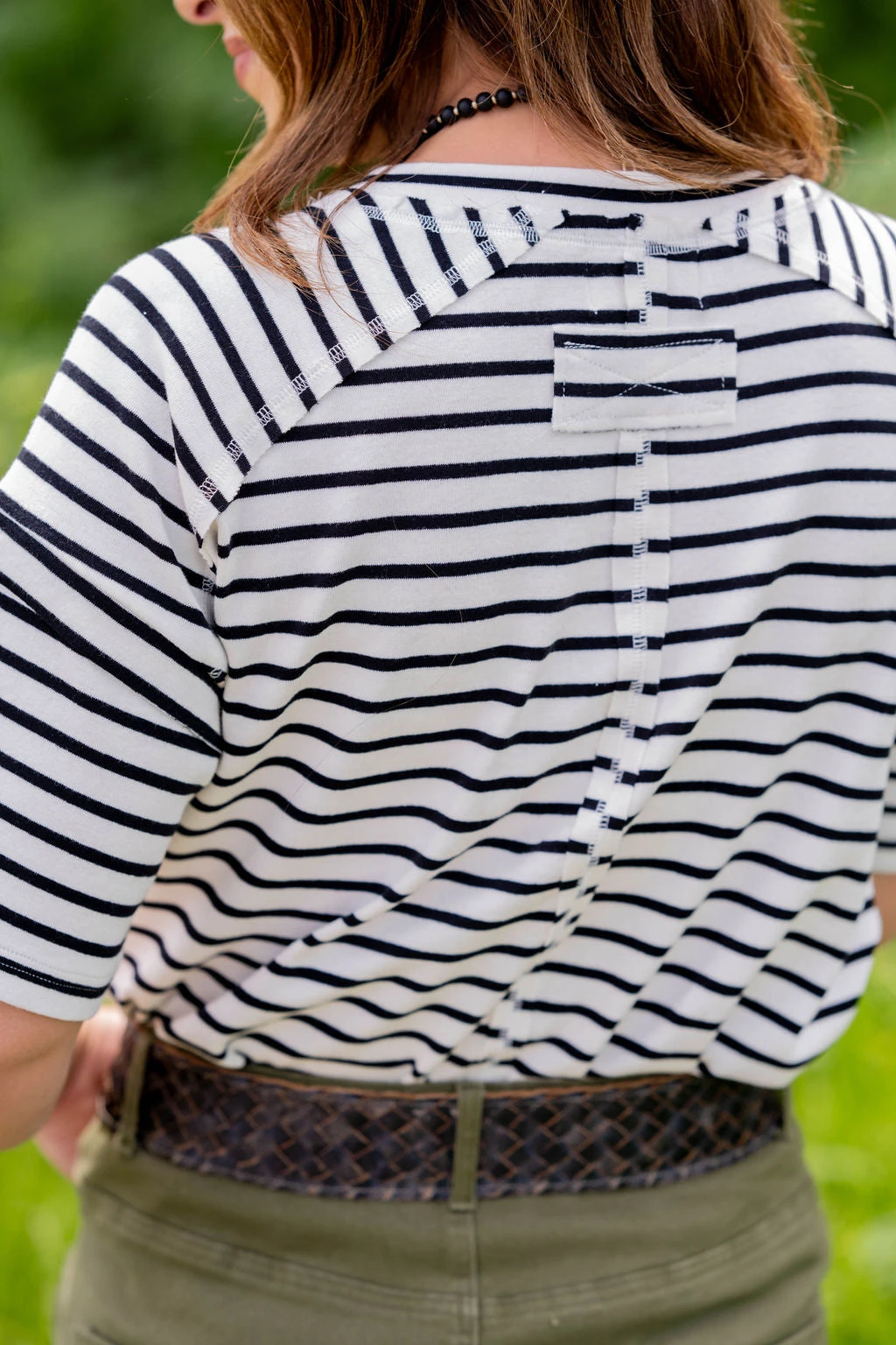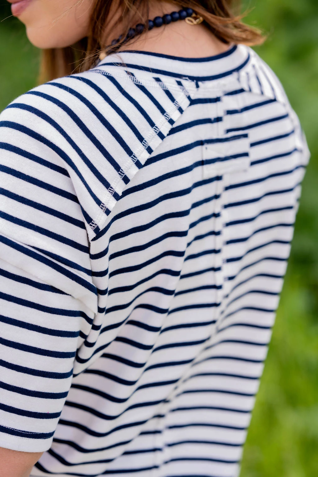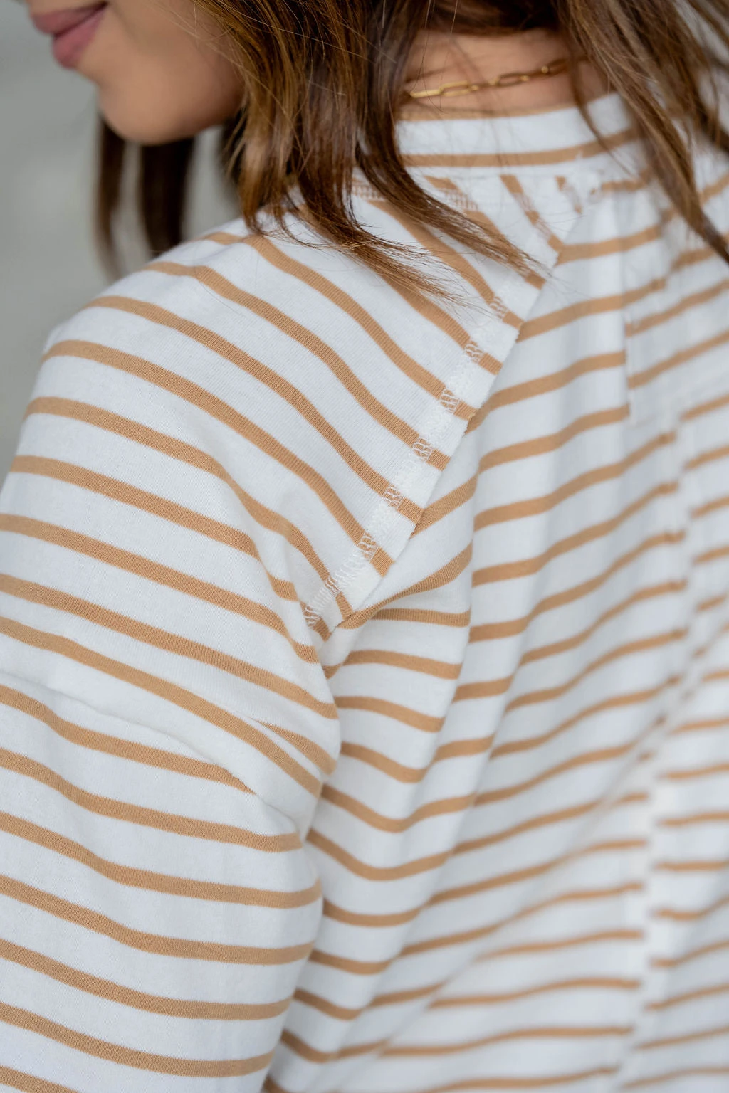 A simple tee with stripes, bold raw stitching, and a faux layered sleeve to give it that extra character! We love that this works for all season with its ease of layering! Dress this up or down for wherever the day takes you!