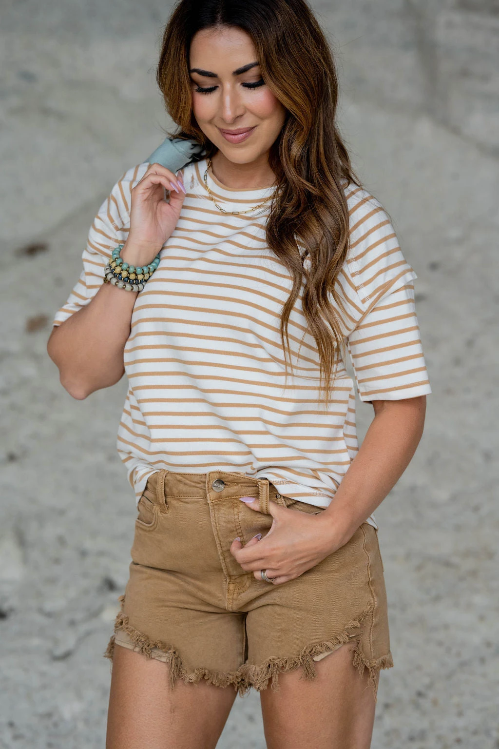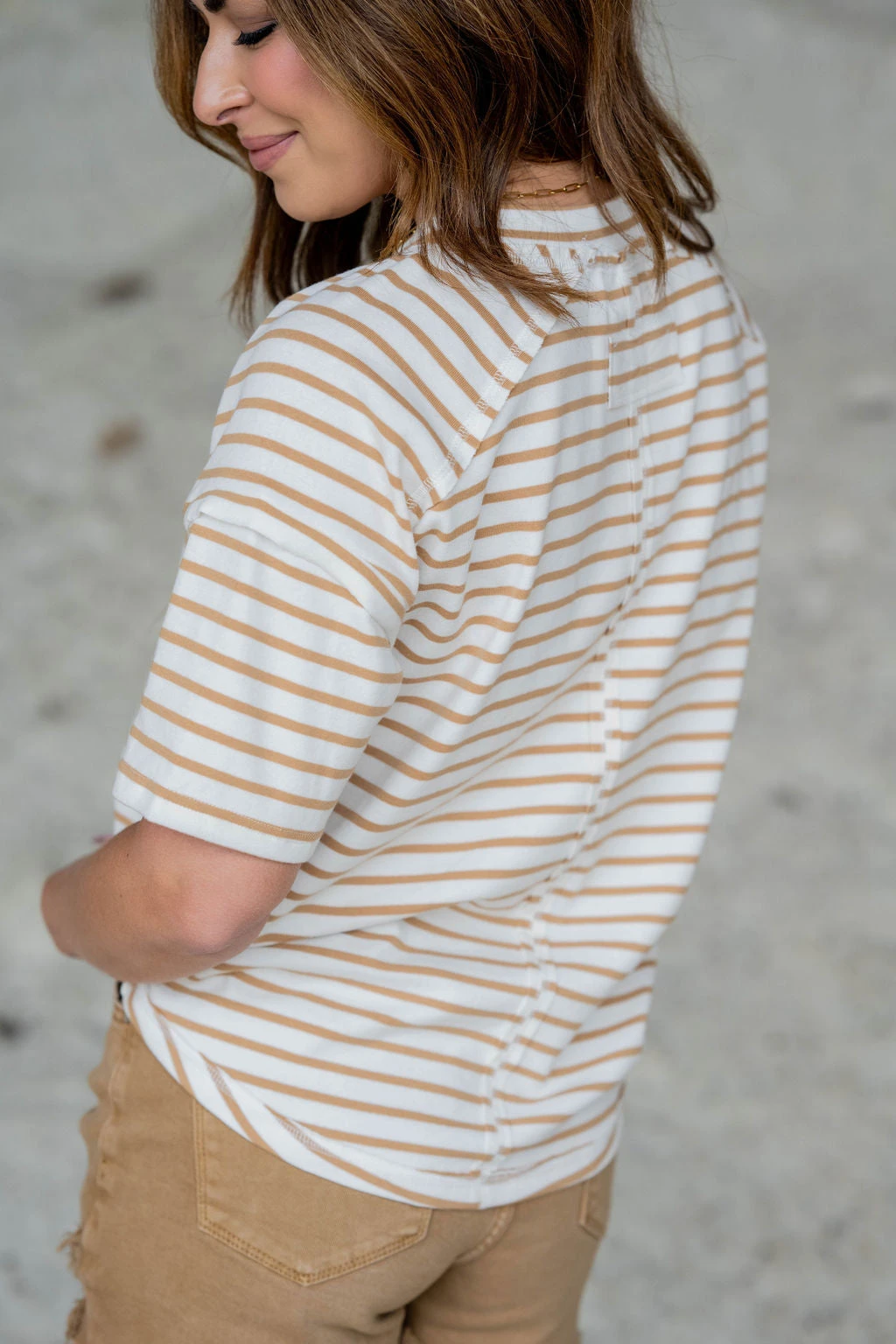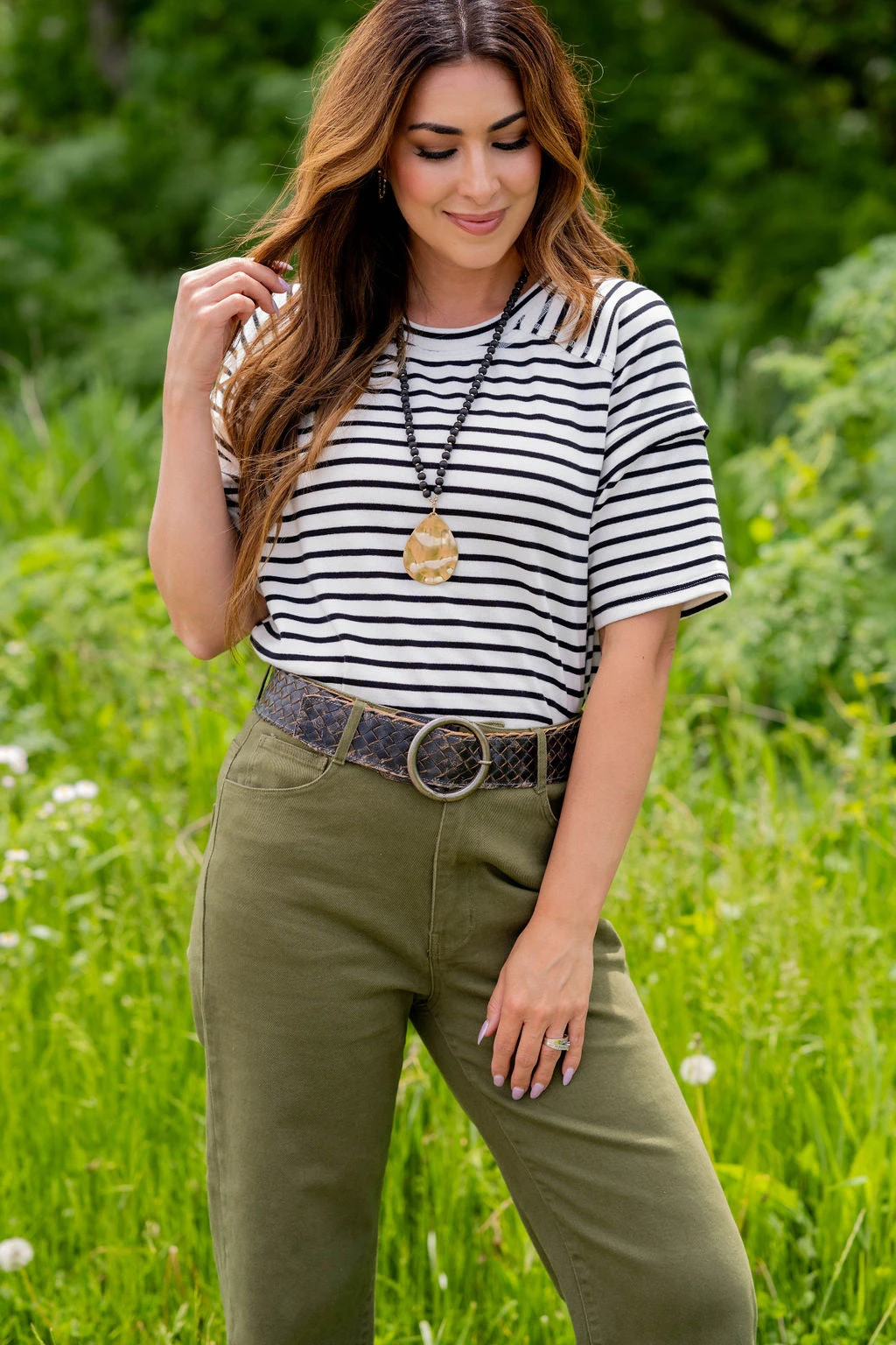 A simple tee with stripes, bold raw stitching, and a faux layered sleeve to give it that extra character! We love that this works for all season with its ease of layering! Dress this up or down for wherever the day takes you!