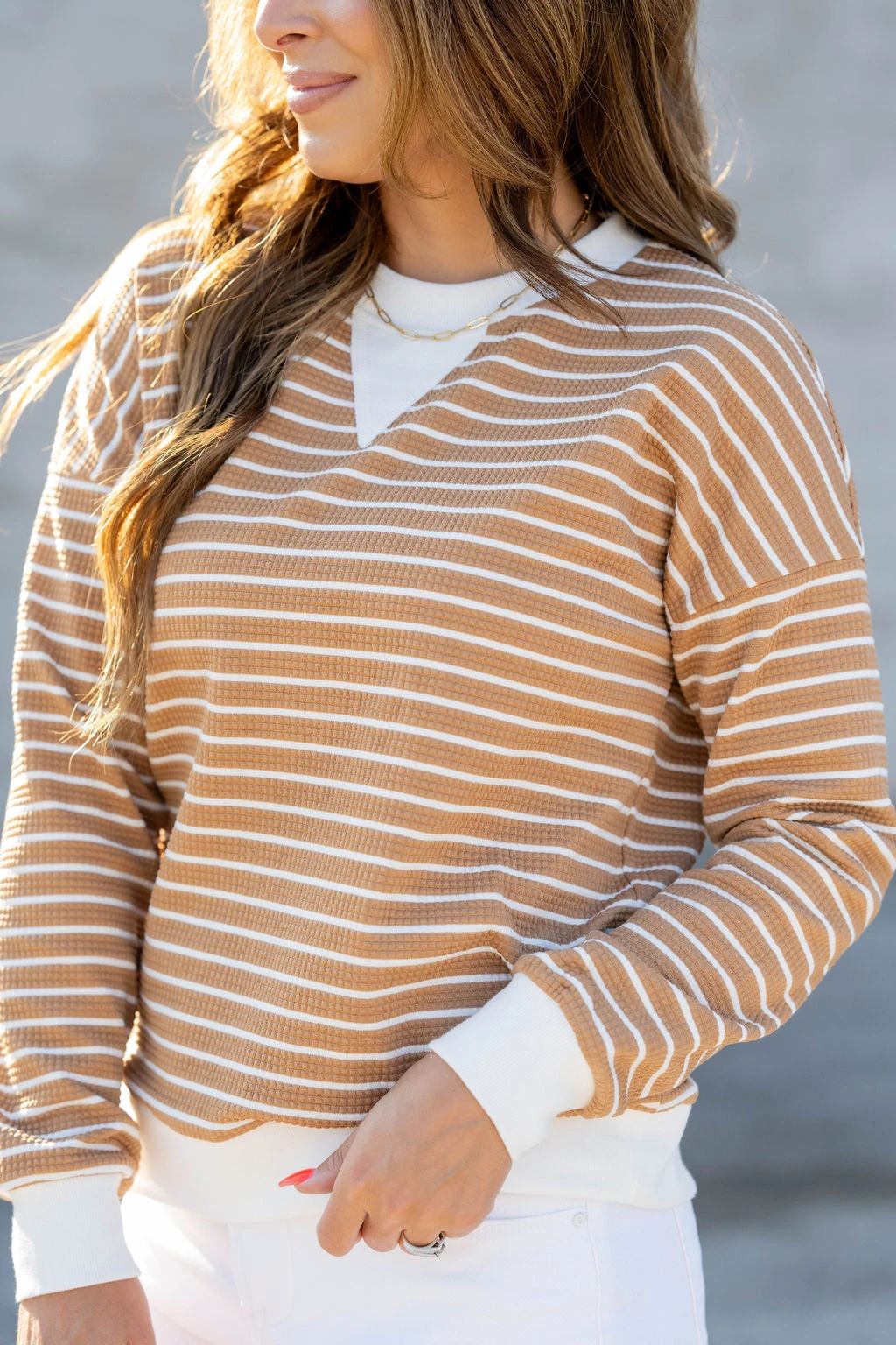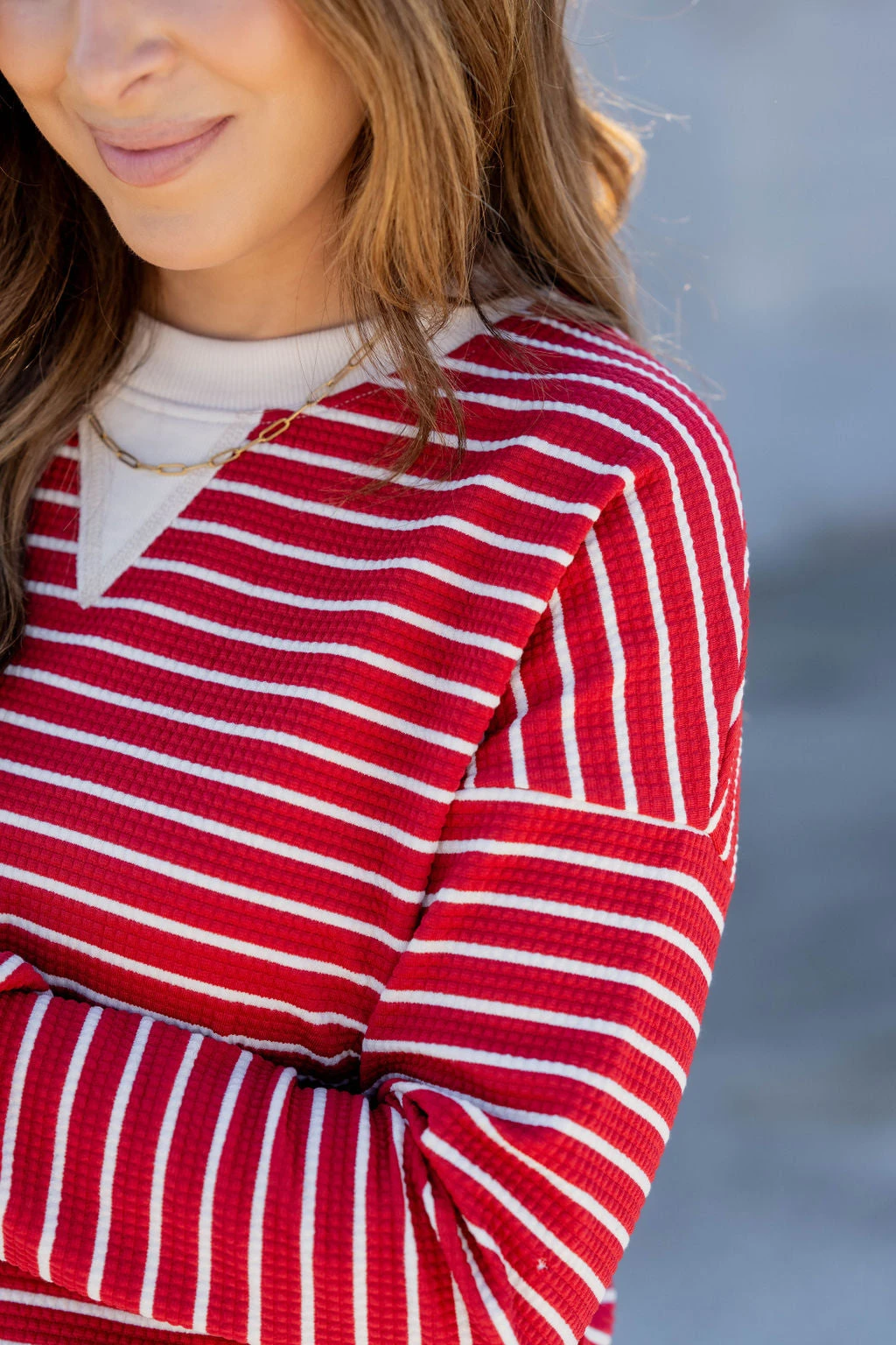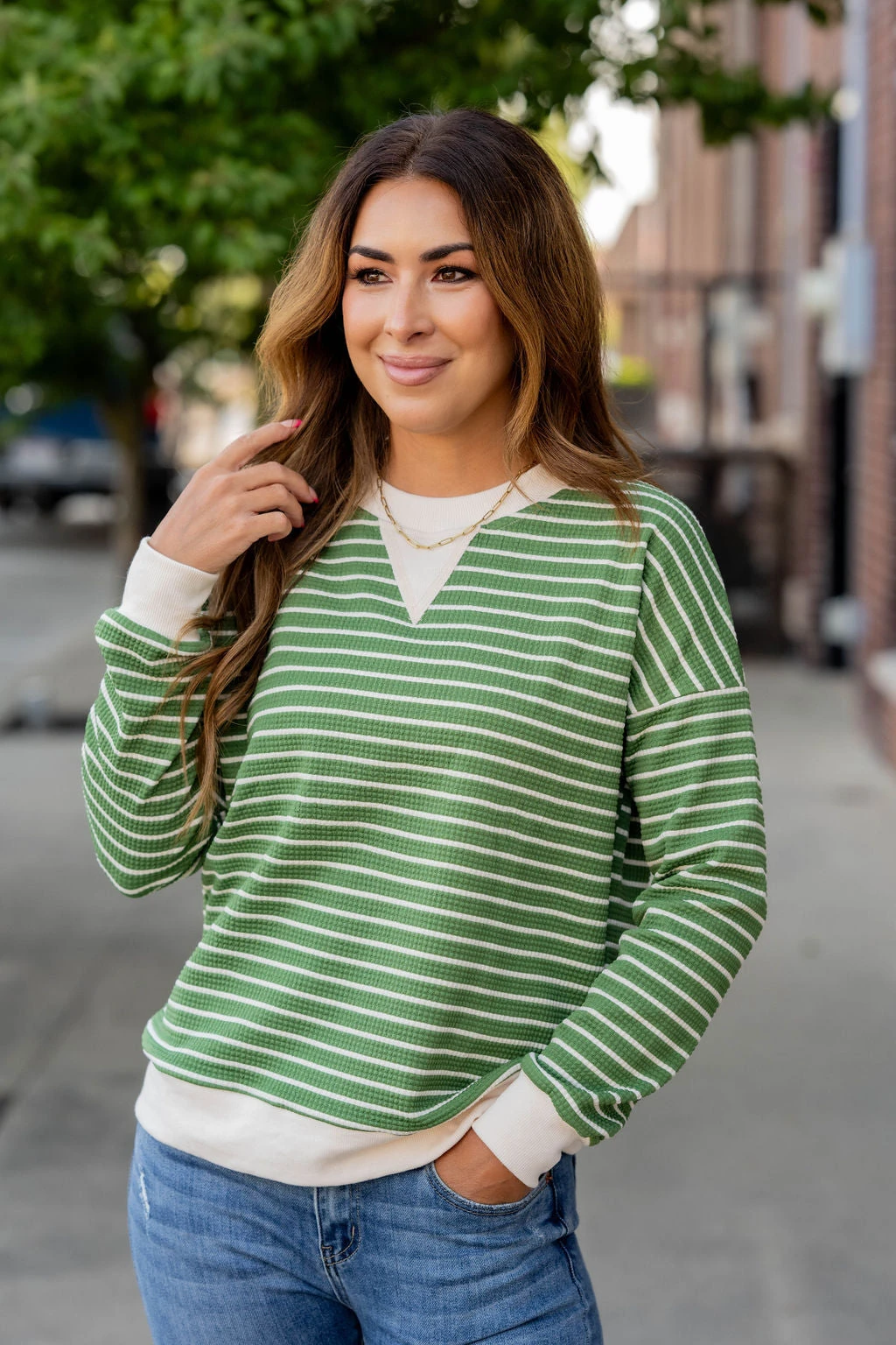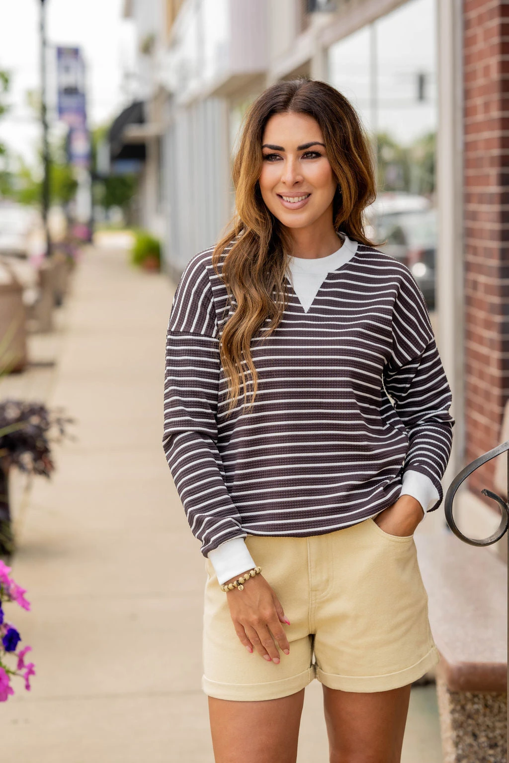 Stripes never go out of fashion! This sweatshirt features a solid trim that pops against the striped body and a waffled texture! Pair with shorts or a skirt for the warmer months or with your favorite denim, joggers, leggings, or our Betsey’s Jeggings for the cooler ones. Chilly? Add a vest or shacket with ease!