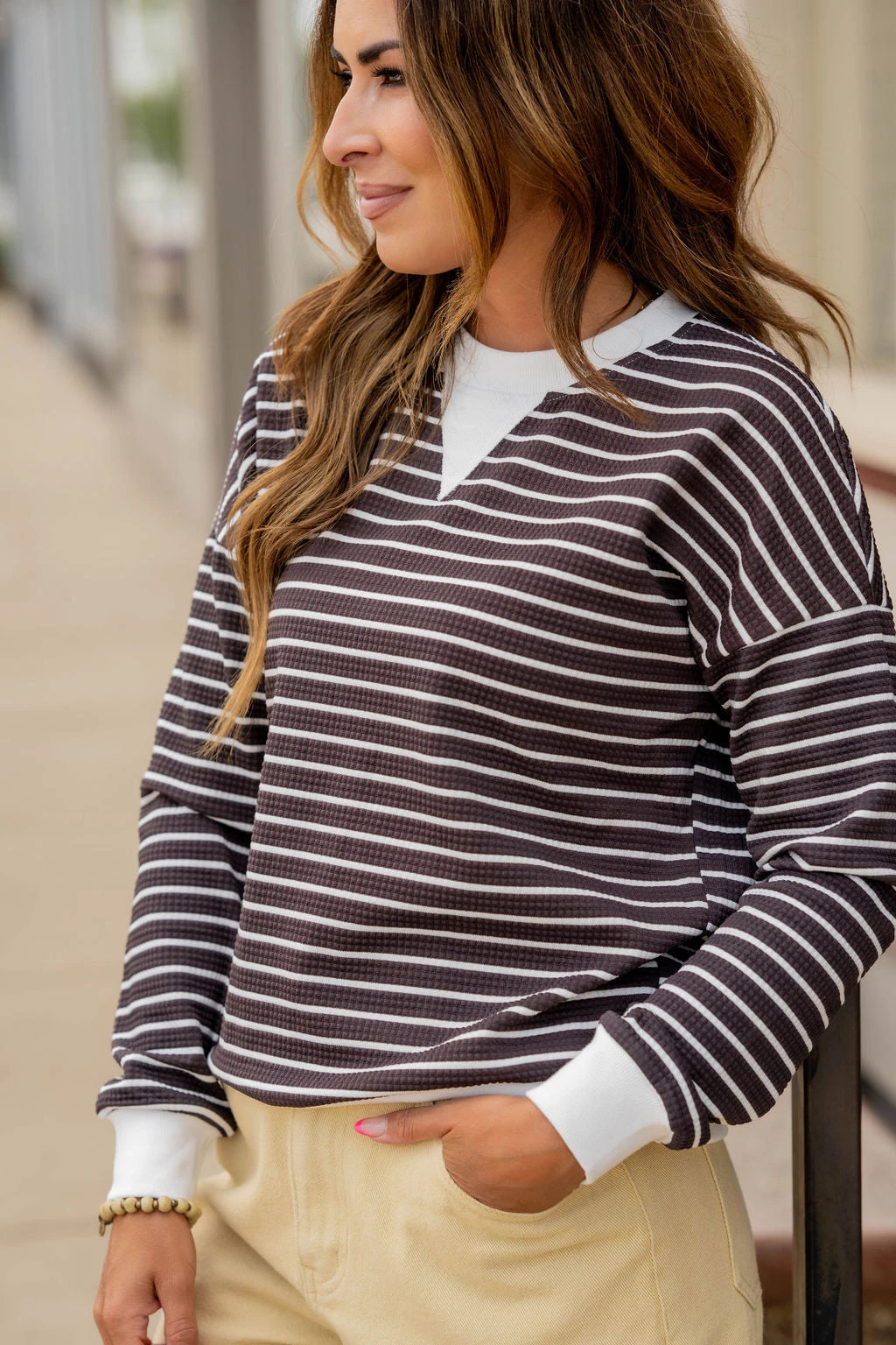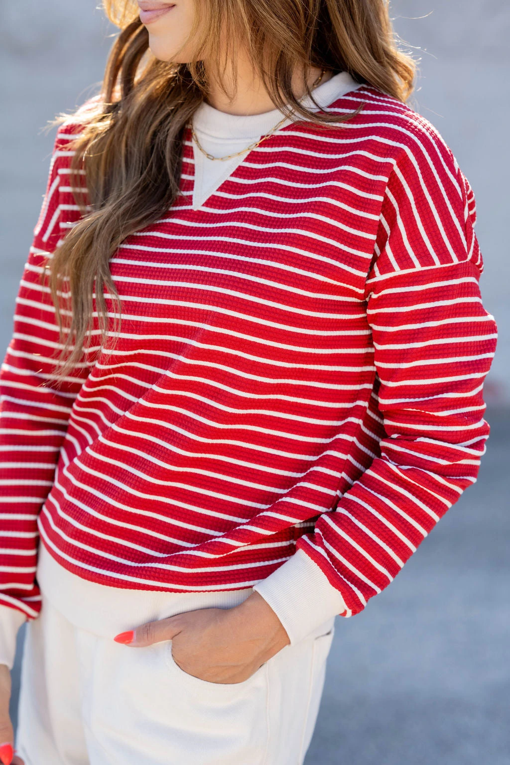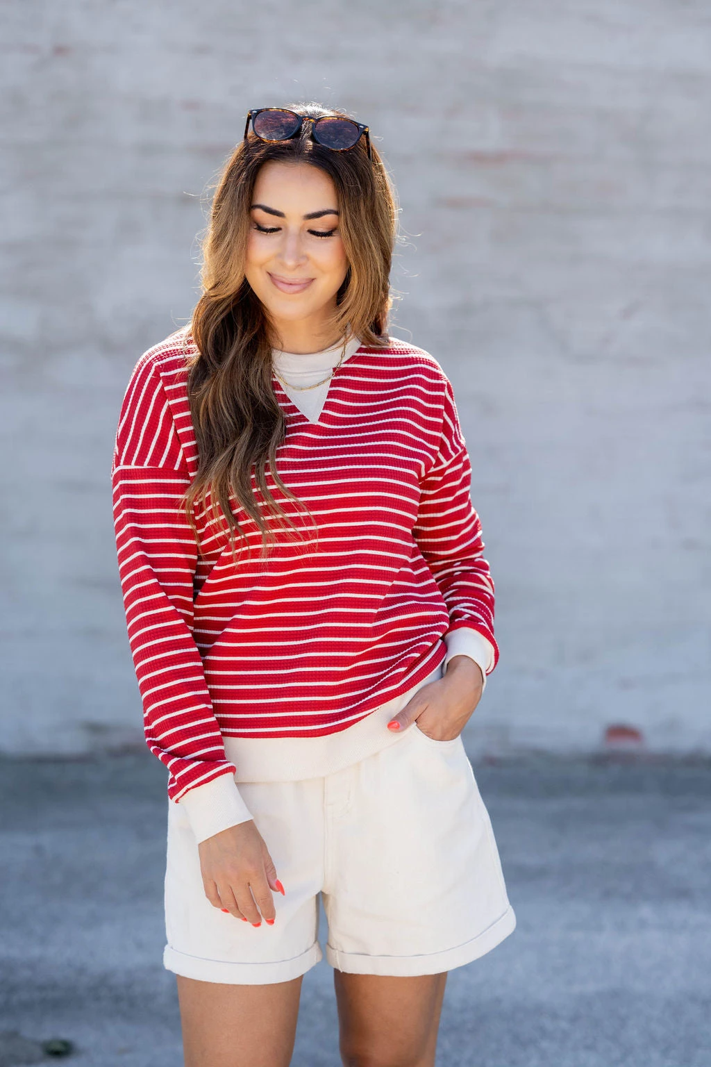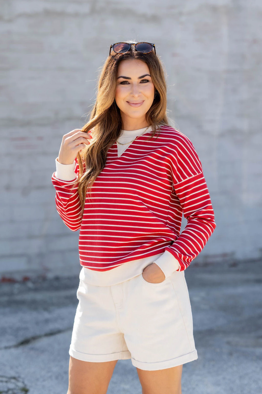 Stripes never go out of fashion! This sweatshirt features a solid trim that pops against the striped body and a waffled texture! Pair with shorts or a skirt for the warmer months or with your favorite denim, joggers, leggings, or our Betsey’s Jeggings for the cooler ones. Chilly? Add a vest or shacket with ease!