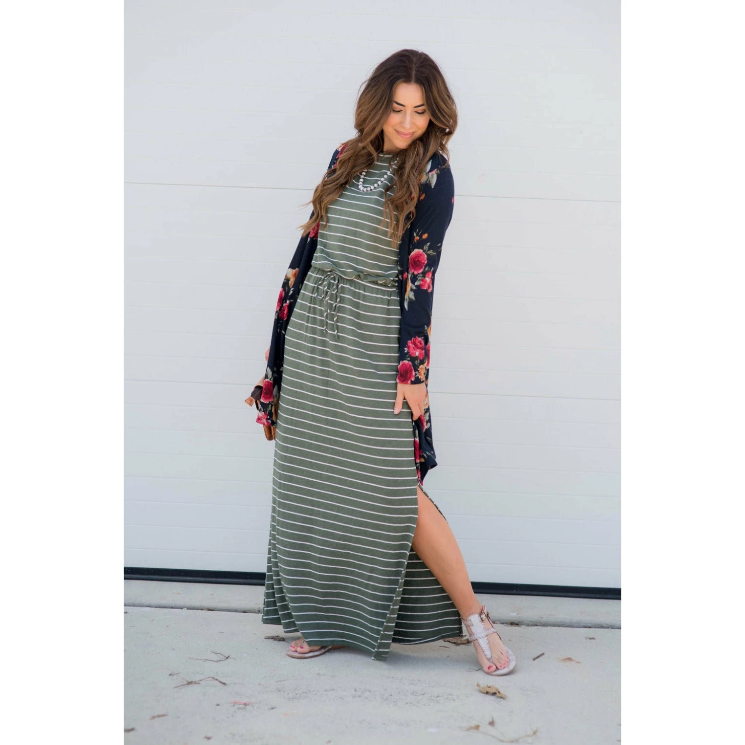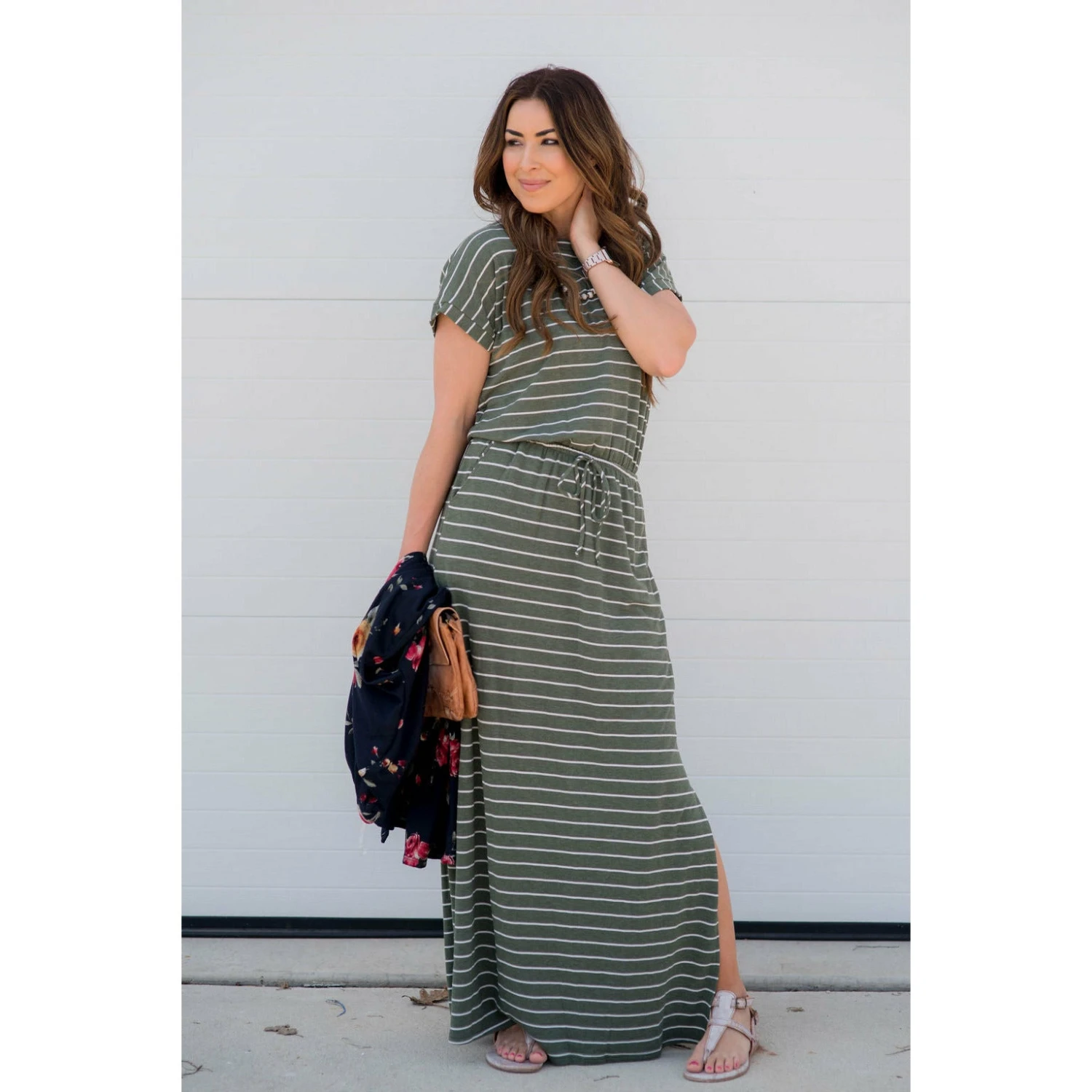 You will love the comfort of this maxi. The drawstring and cinched waist adds the perfect detail to make this a flattering look!