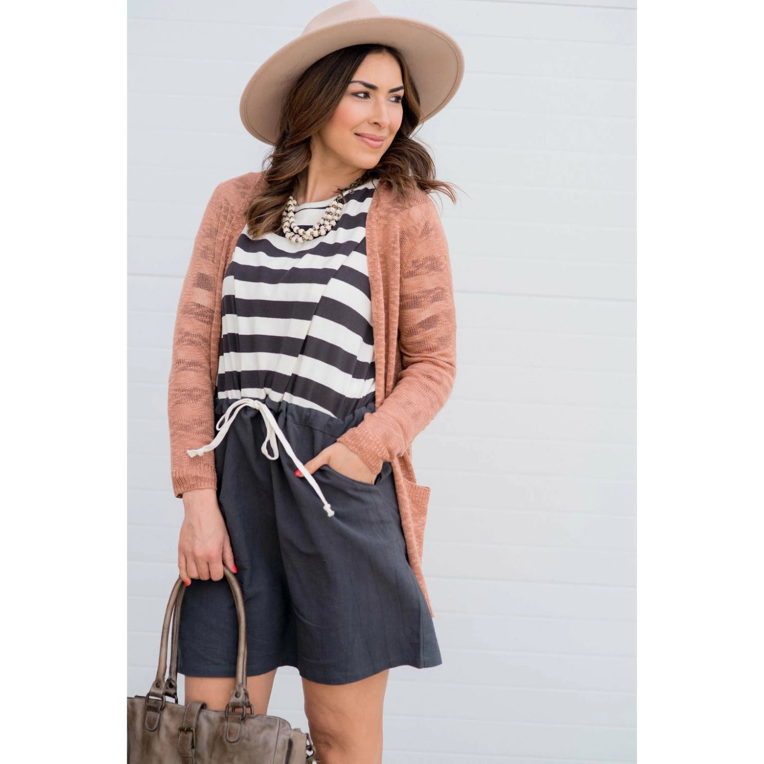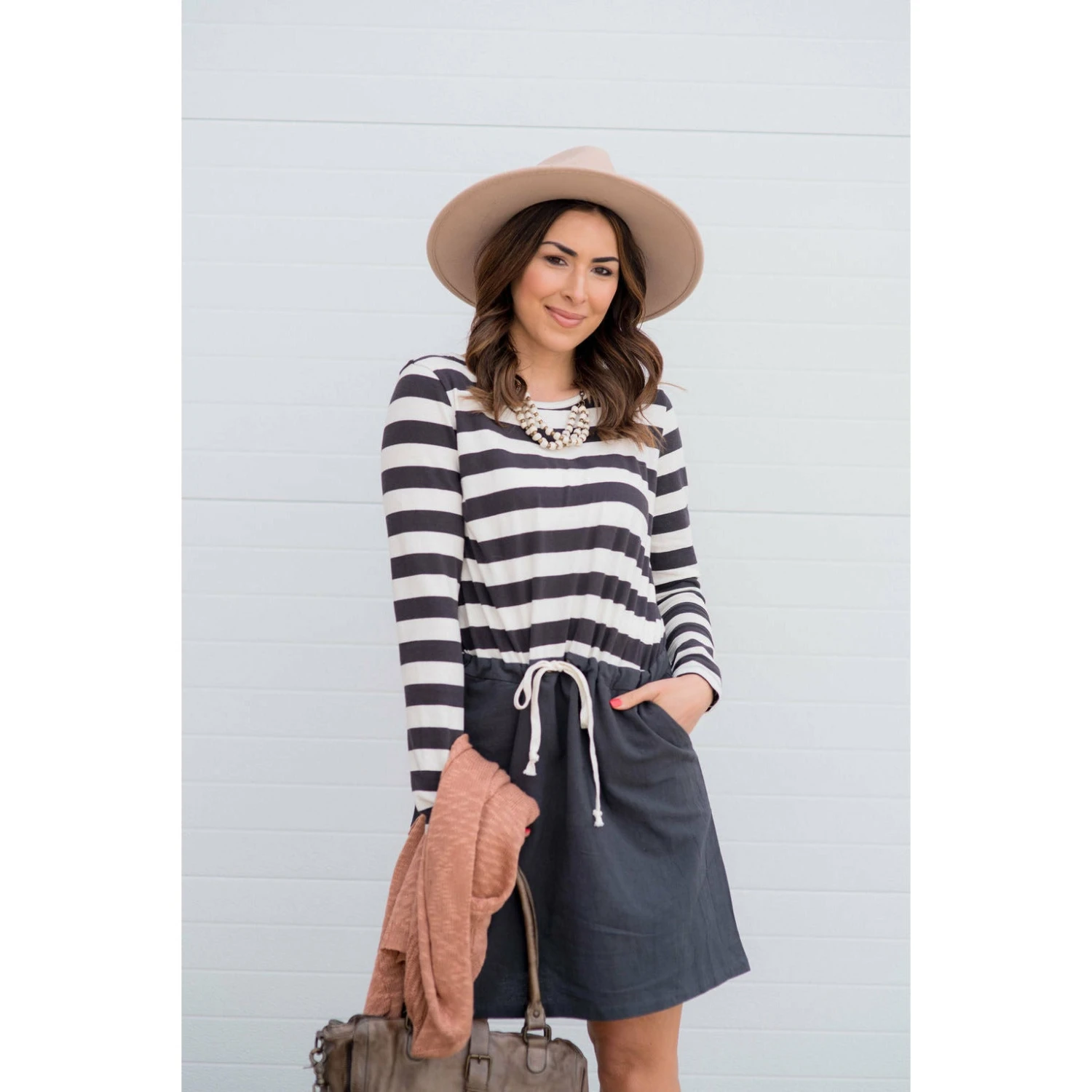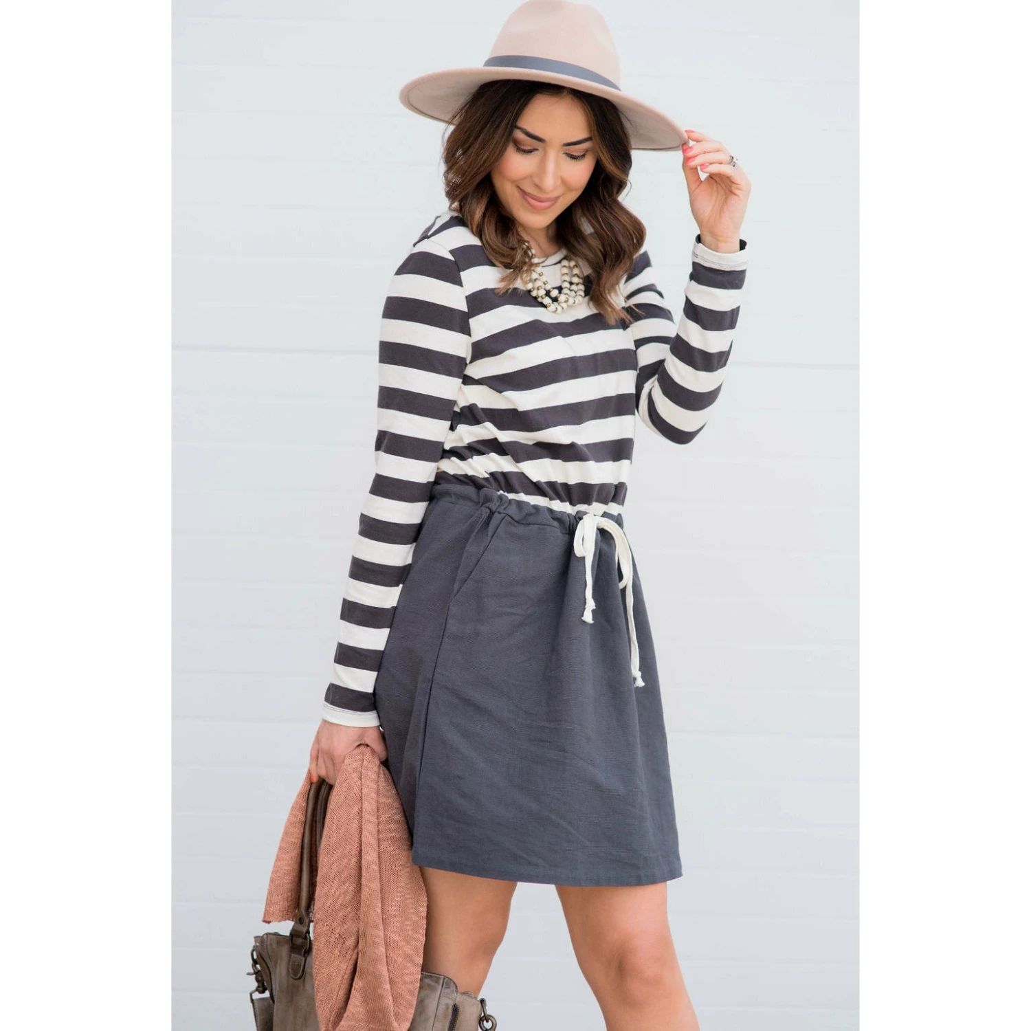 This dress is very unique! It has pockets and stripes to add an enjoyable look on top!