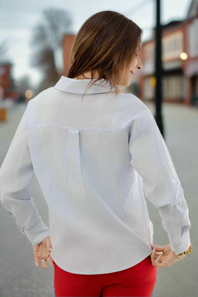 Simple and elegant describes this blouse perfectly. Button-up blouses are a classic, timeless piece. We love the classic stripes and the lightweight material making this ideal for every season and the twist bottom detailing gives this that extra bit of pizzaz. Pair with a skirt, your favorite denim, joggers, or our Betsey’s Jeggings for an easy yet pulled together look. Chilly? Add a vest, cardigan, or shacket with ease!