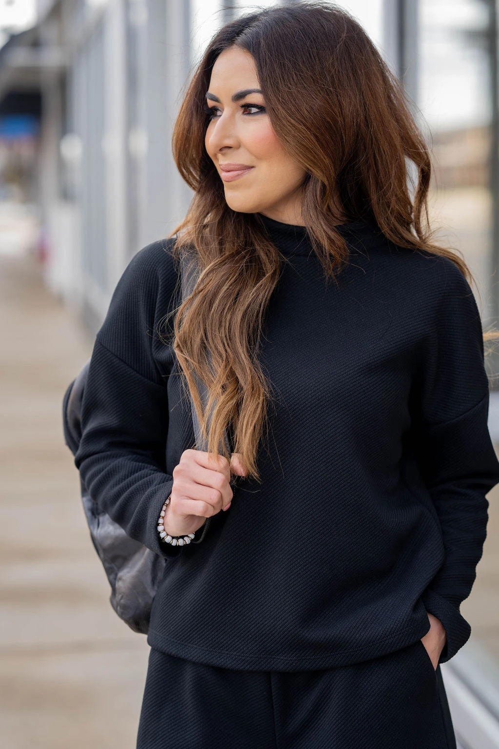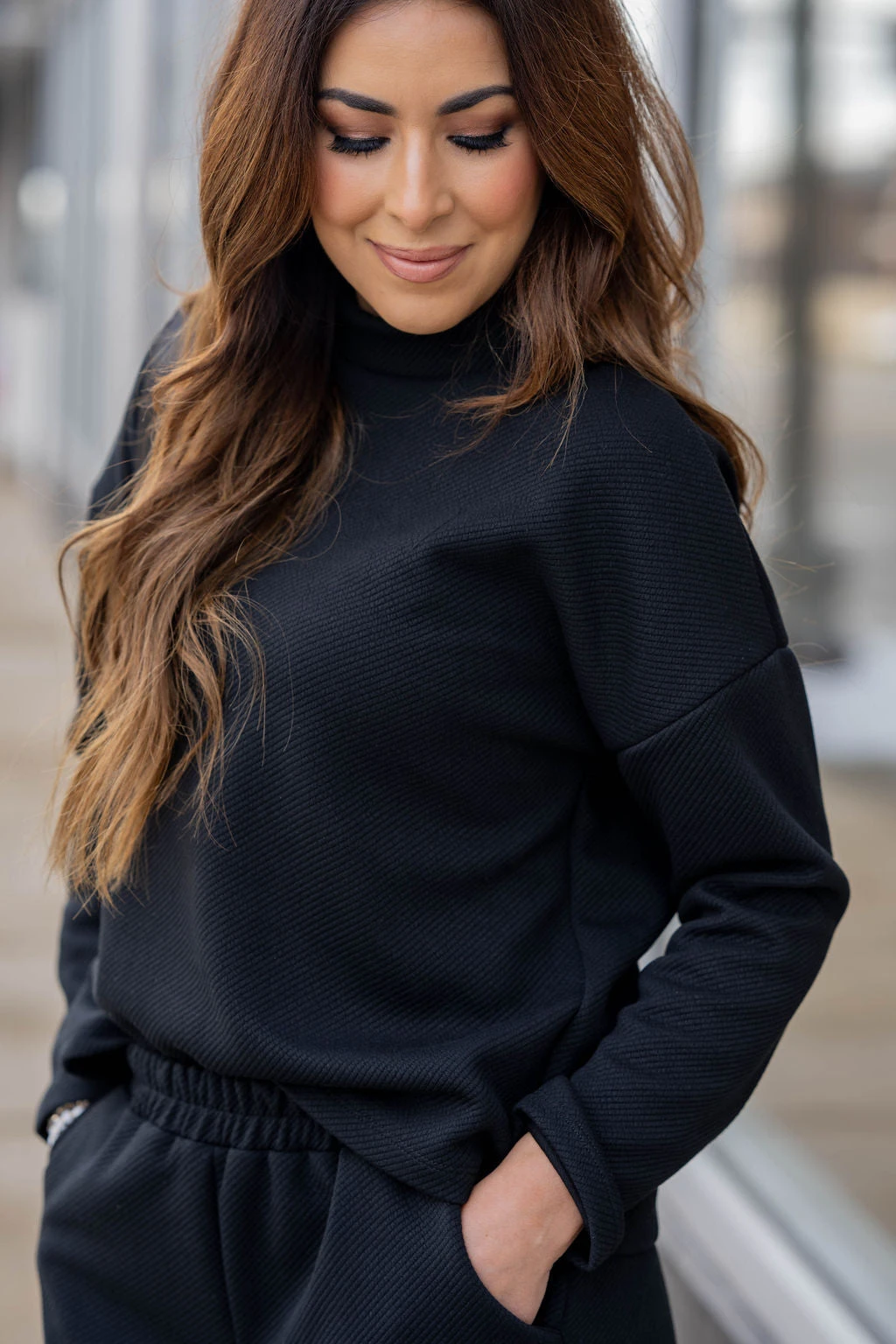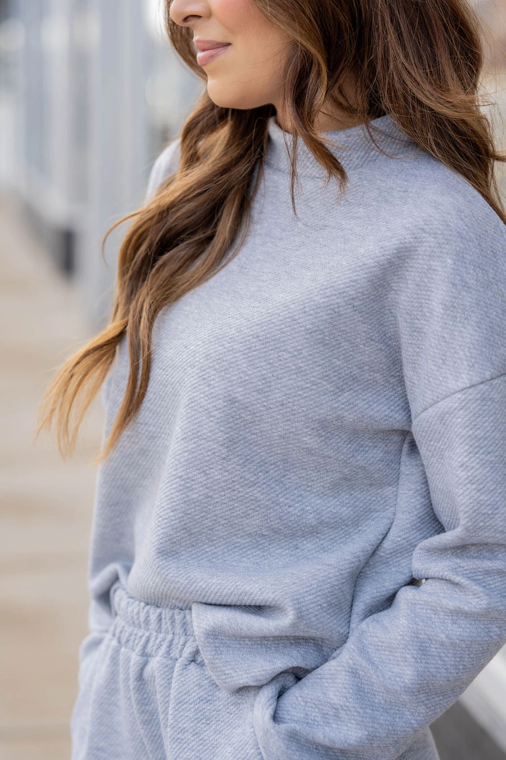 Comfort meets style in this subtle ribbed sweatshirt! The soft, lightly textured material gives a fun twist to any look, and the mock neck detailing is perfect to pair with leggings, denim, or joggers! Chilly? Layer with a vest or shacket! We also suggest pairing this with our Subtle Ribbed Relaxed Bottom Pants for a chic and complete look!