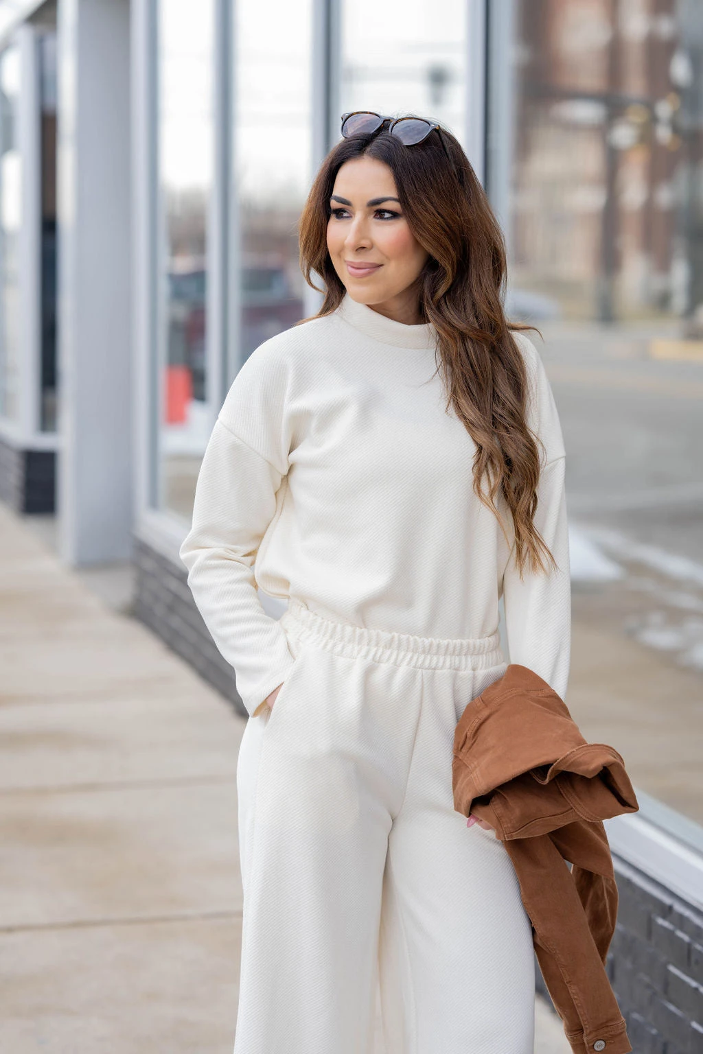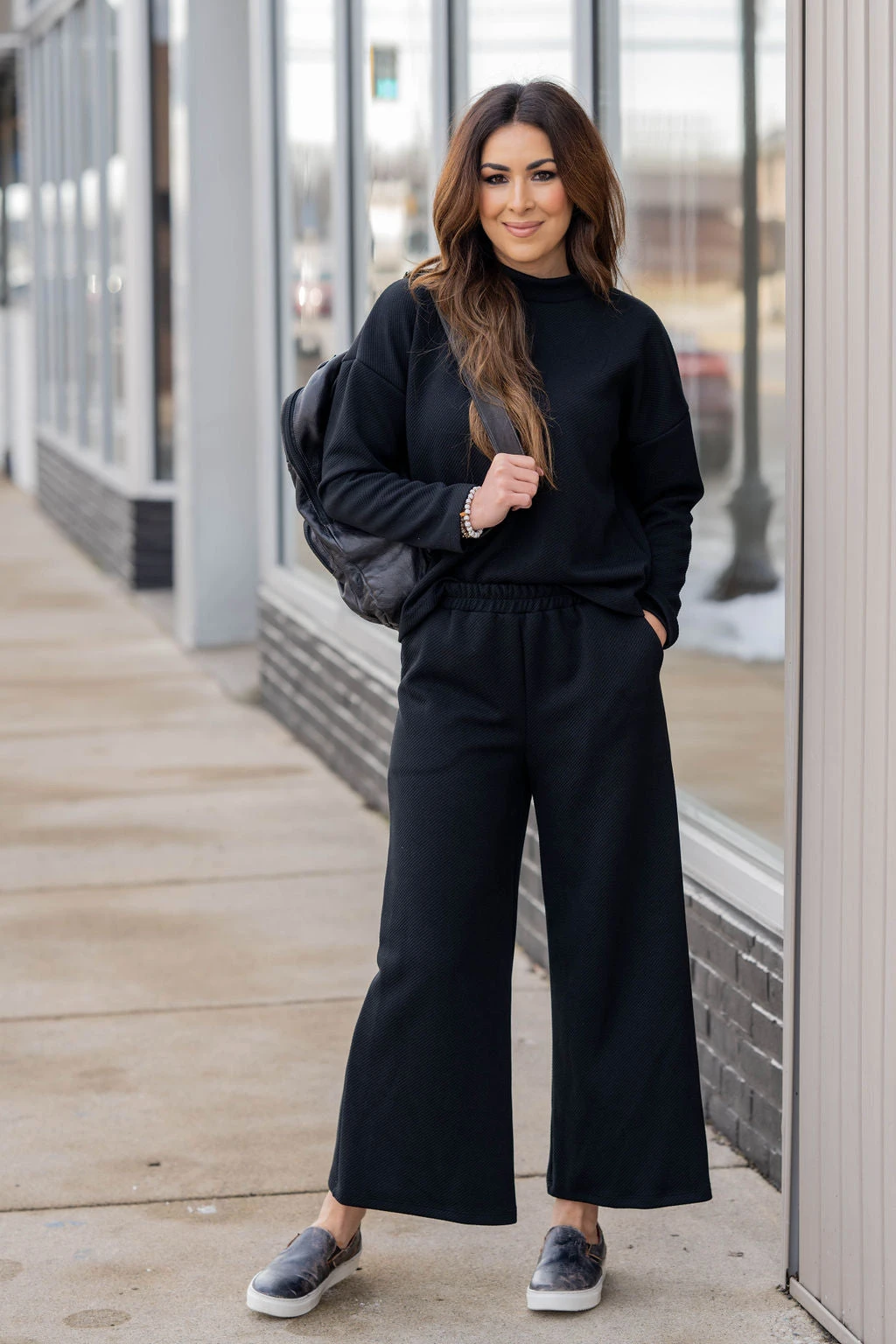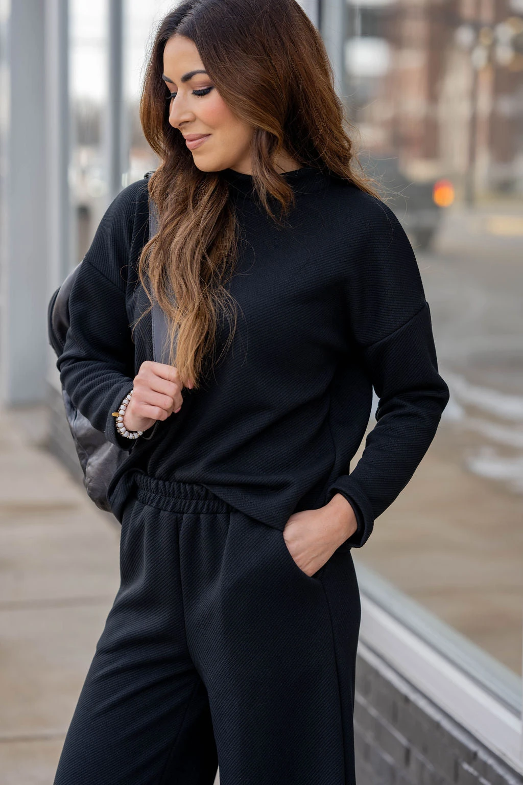 Comfort meets style in this subtle ribbed sweatshirt! The soft, lightly textured material gives a fun twist to any look, and the mock neck detailing is perfect to pair with leggings, denim, or joggers! Chilly? Layer with a vest or shacket! We also suggest pairing this with our Subtle Ribbed Relaxed Bottom Pants for a chic and complete look!