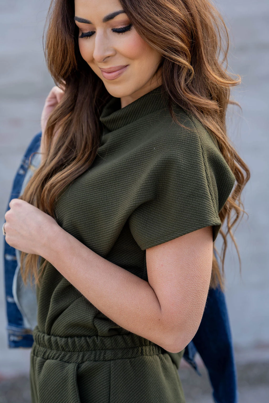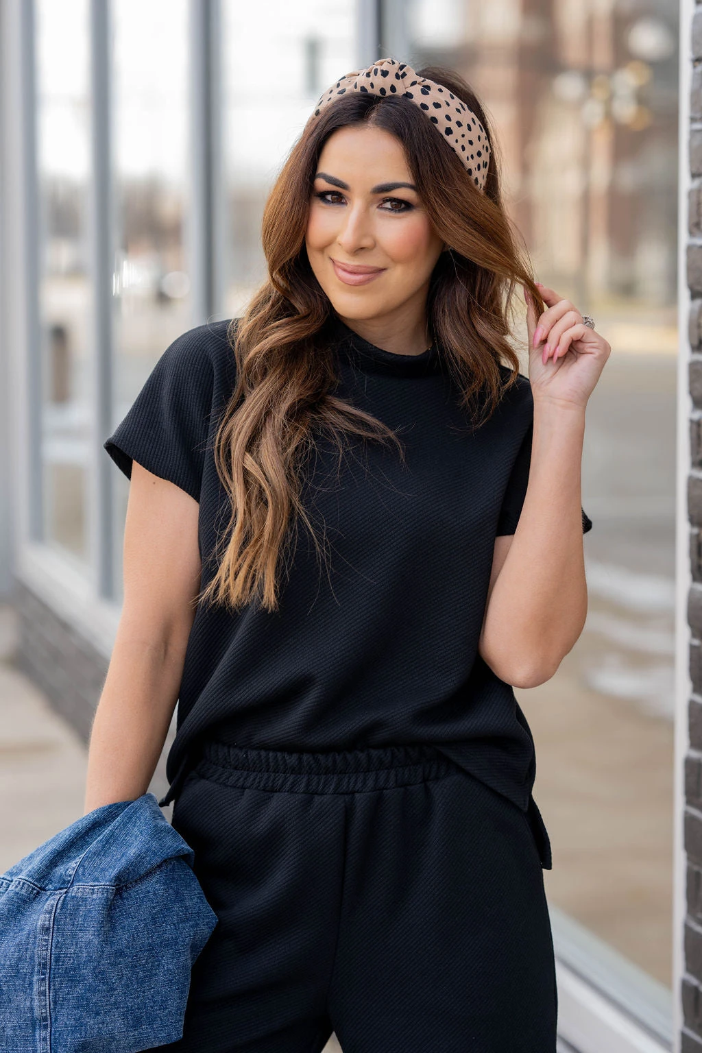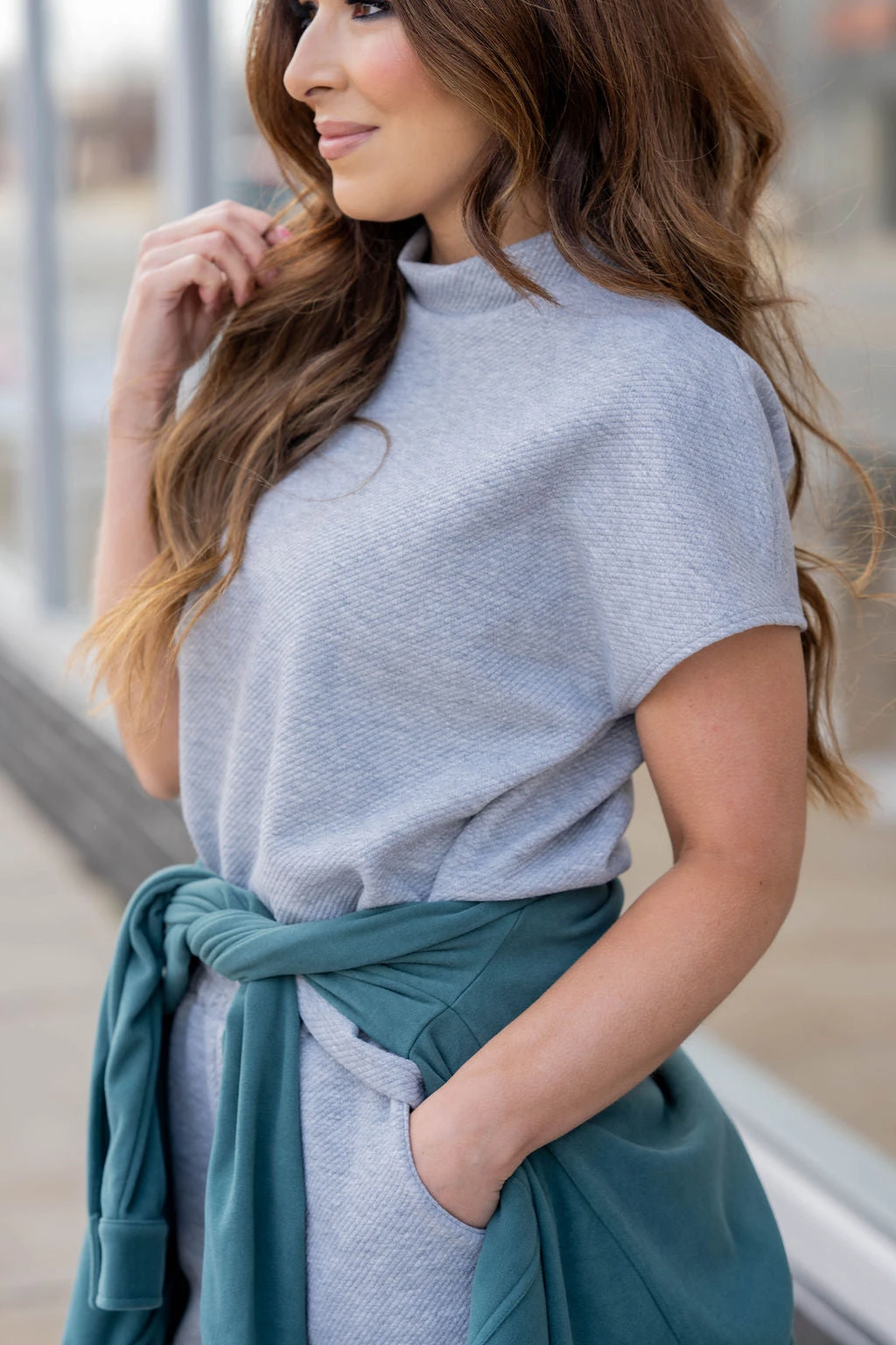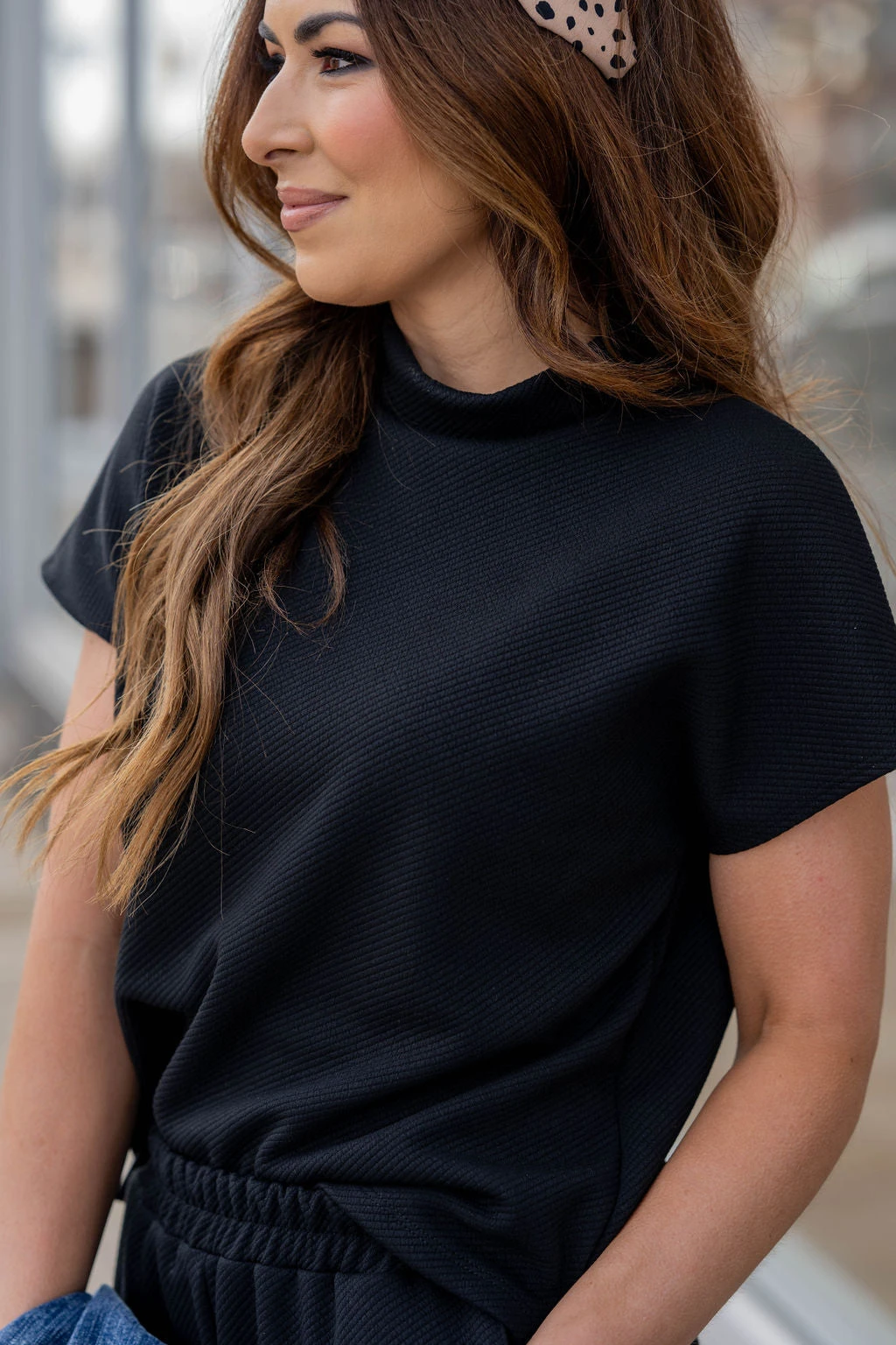 Comfort meets style in this subtle ribbed tee! The soft, lightly textured material gives a fun twist to any look, and the mock neck detailing is perfect to pair with leggings, denim, or joggers! Chilly? Layer with a vest or shacket! We also suggest pairing this with our Subtle Ribbed Relaxed Bottom Pants for a chic and complete look!