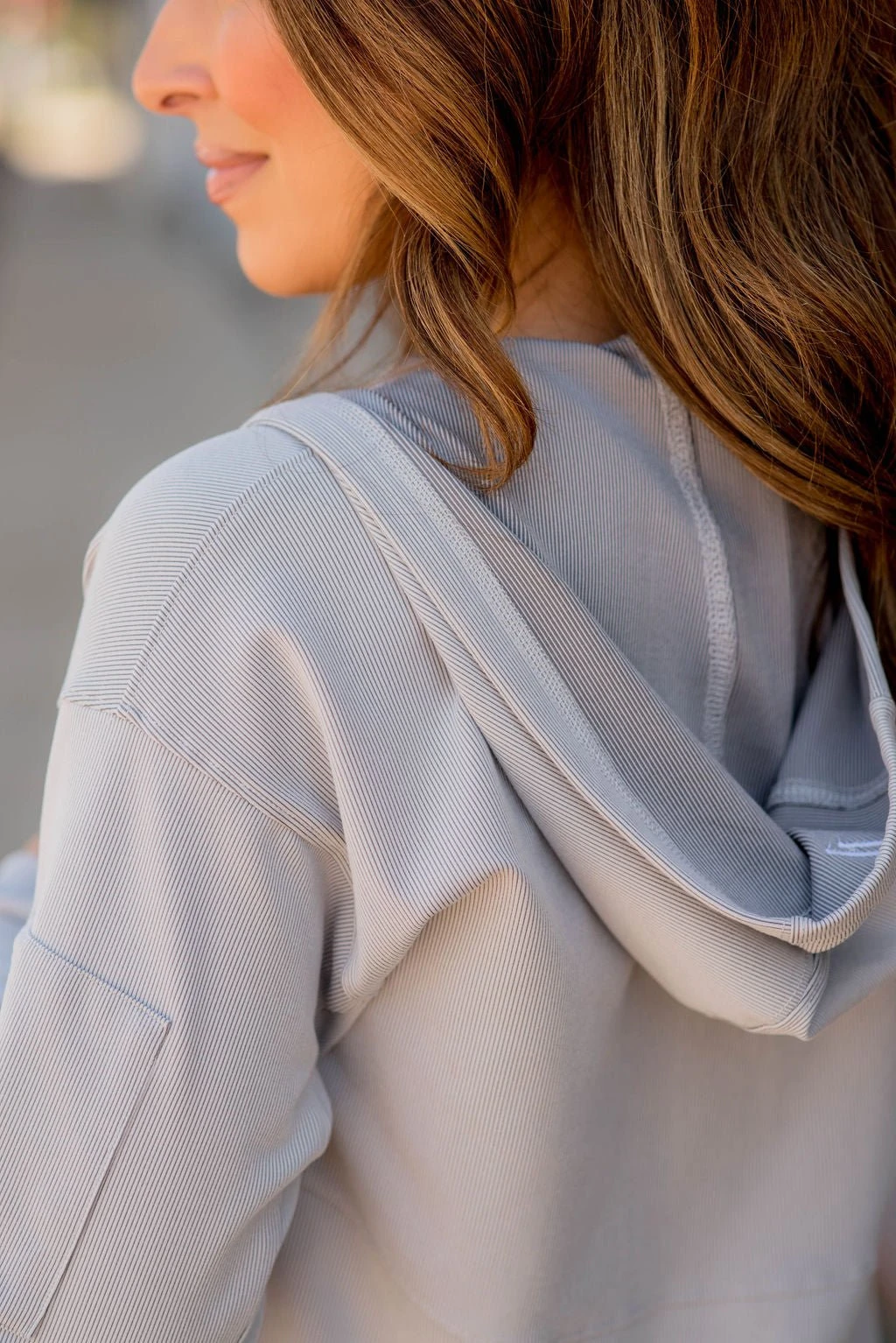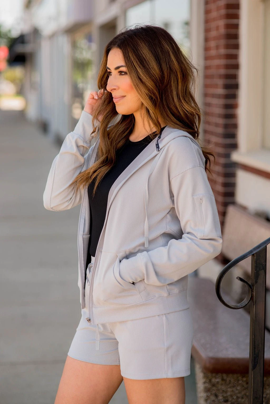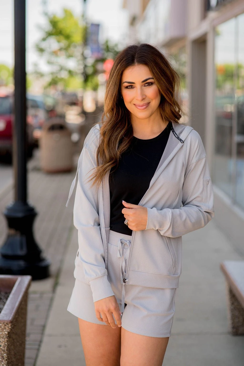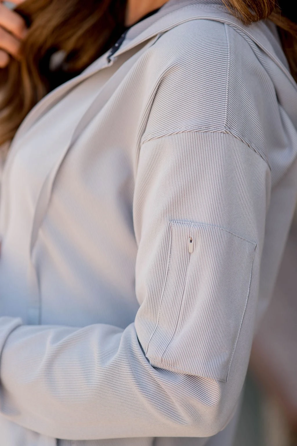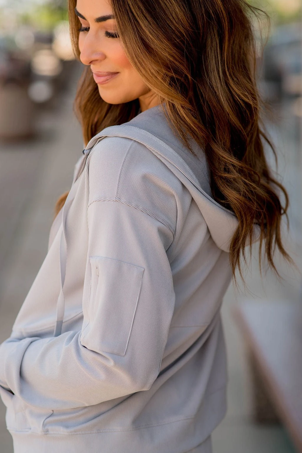 This zip-up jacket features a soft and lightweight material, subtle ribbed texture, functional pockets, and a hood! This is perfect to transition you through seasons and can be worn for the gym or even busy weekends on-the-go! We love pairing this with activewear for the perfect look!
