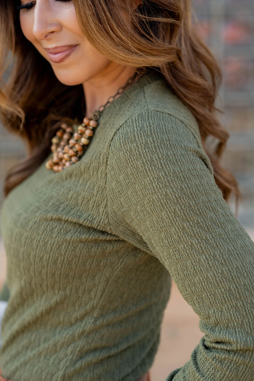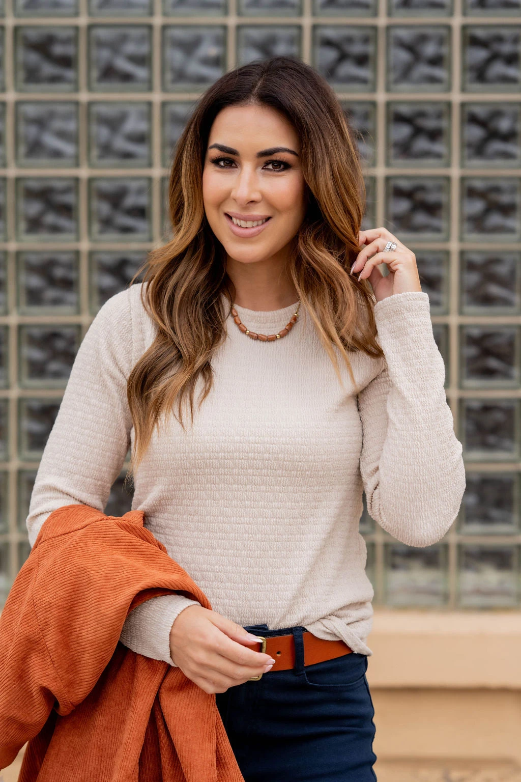 A simple long sleeve tee with a fun texture to give it a chic vibe! The subtle textured look can be either dressed up or down to match your style! We love that this can be worn with shorts for the warmer months or denim, joggers, or our Betsey’s Jeggings for the cooler ones. Chilly? Add a vest or jacket with ease! Simply add your favorite accessories to elevate this piece.